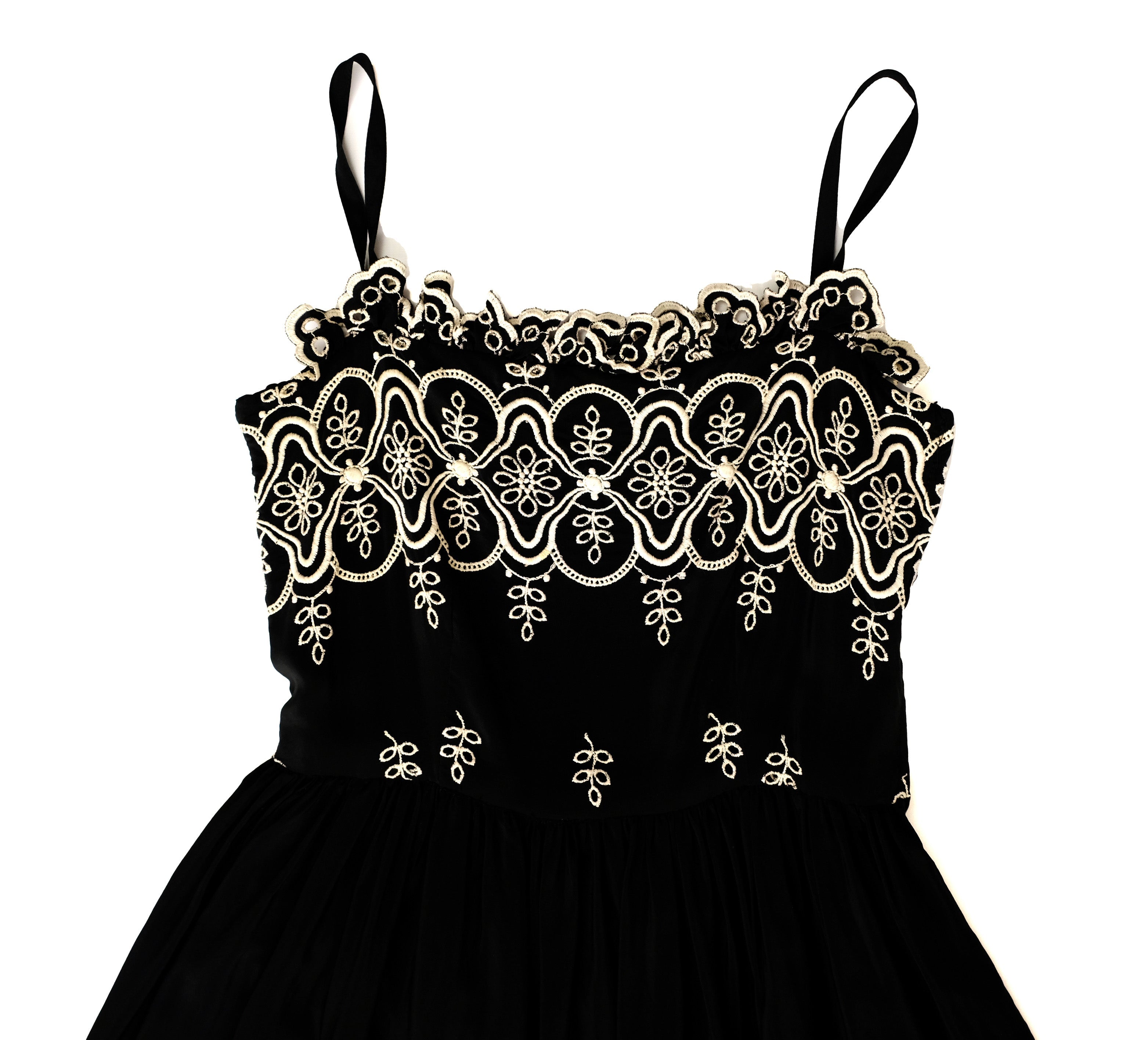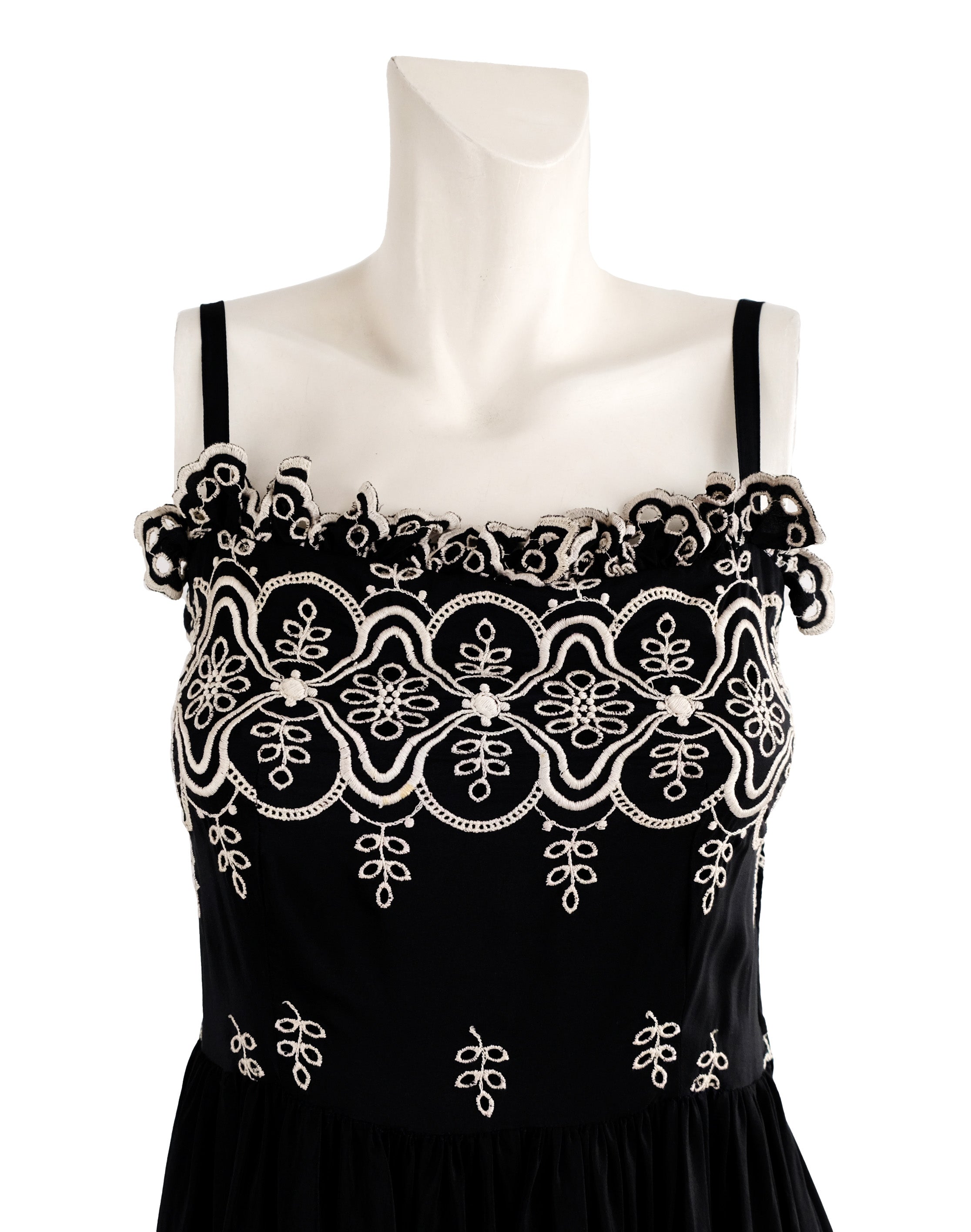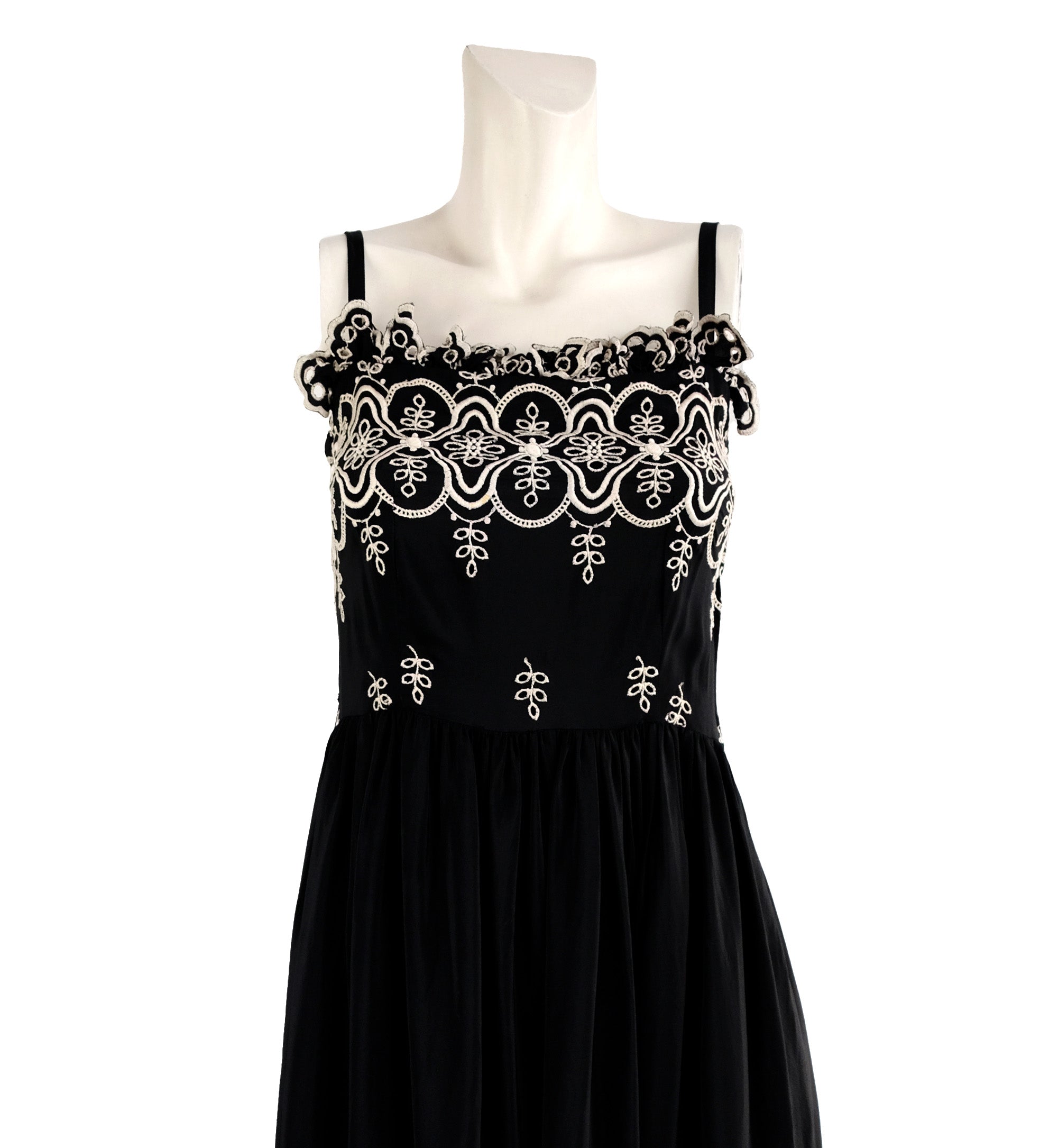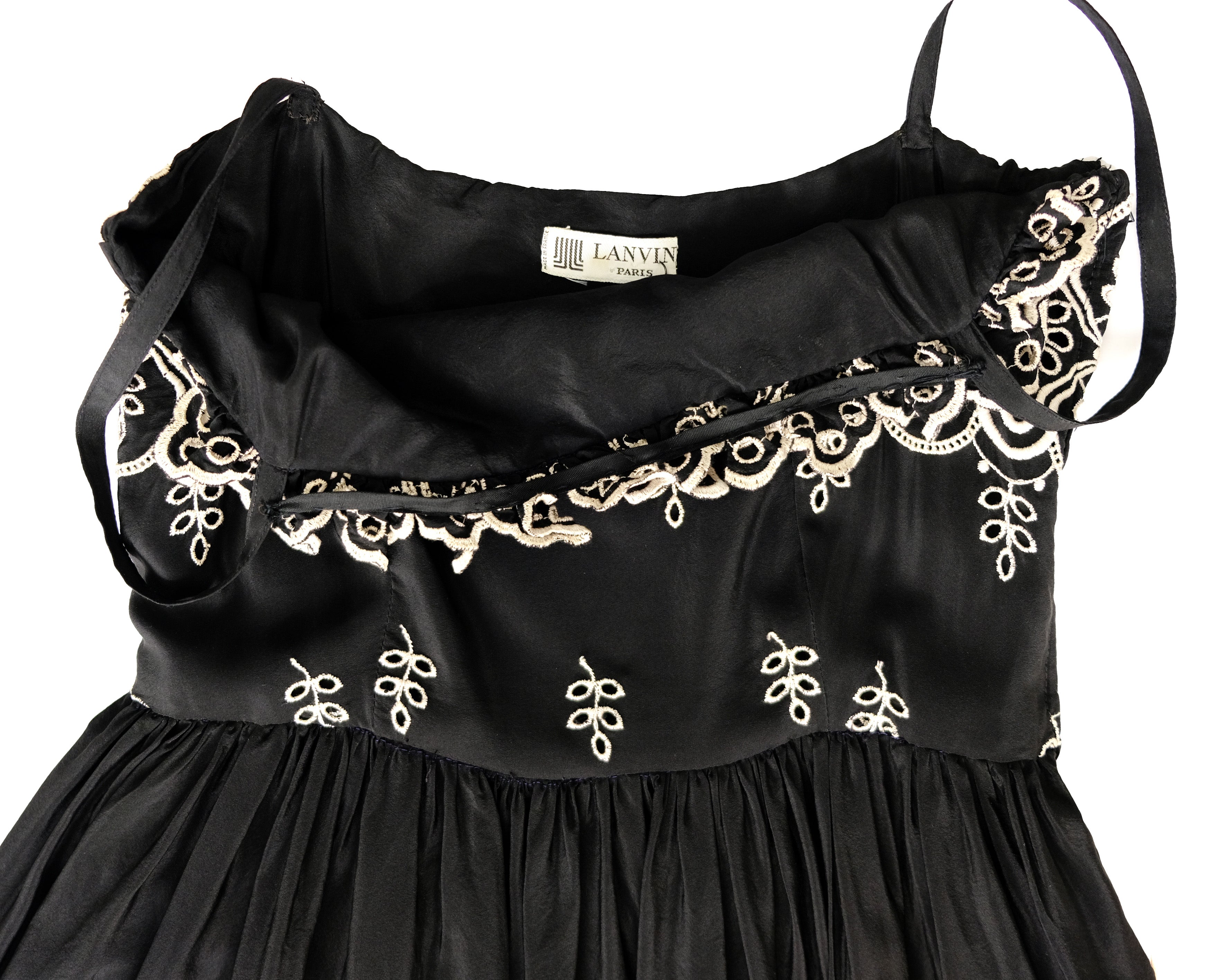 A beautiful 1970s vintage summer dress by Lanvin, in black silk with elaborate white floral embroidery.