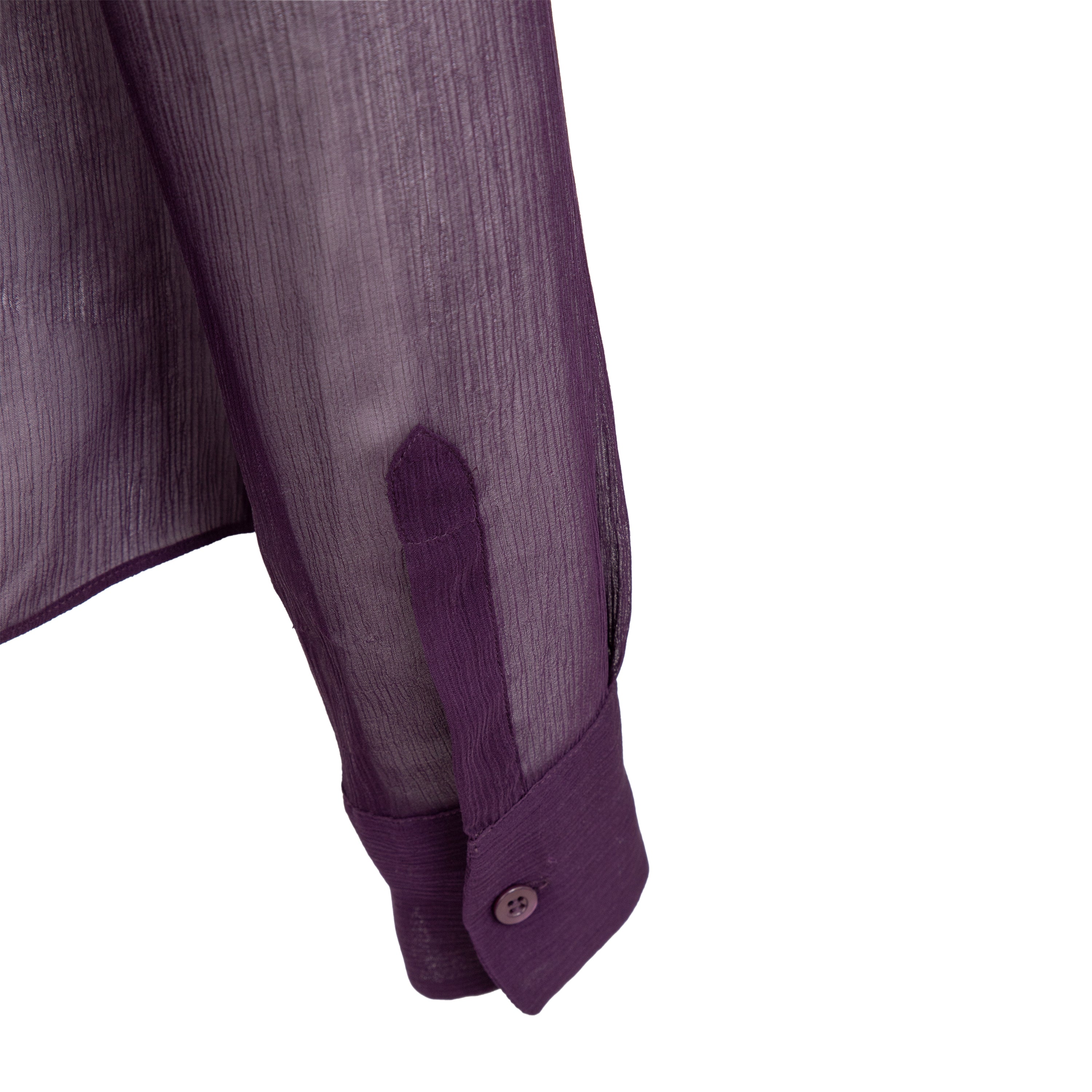 Effortlessly elevate your wardrobe with this luxurious Moschino shirt and camisole set. Crafted from pure silk in a rich deep plum purple color, this shirt is both stylish and versatile. The semi-sheer design, along with front ruffles and pleats, add a touch of femininity. Complete with a front button closure for easy wear.