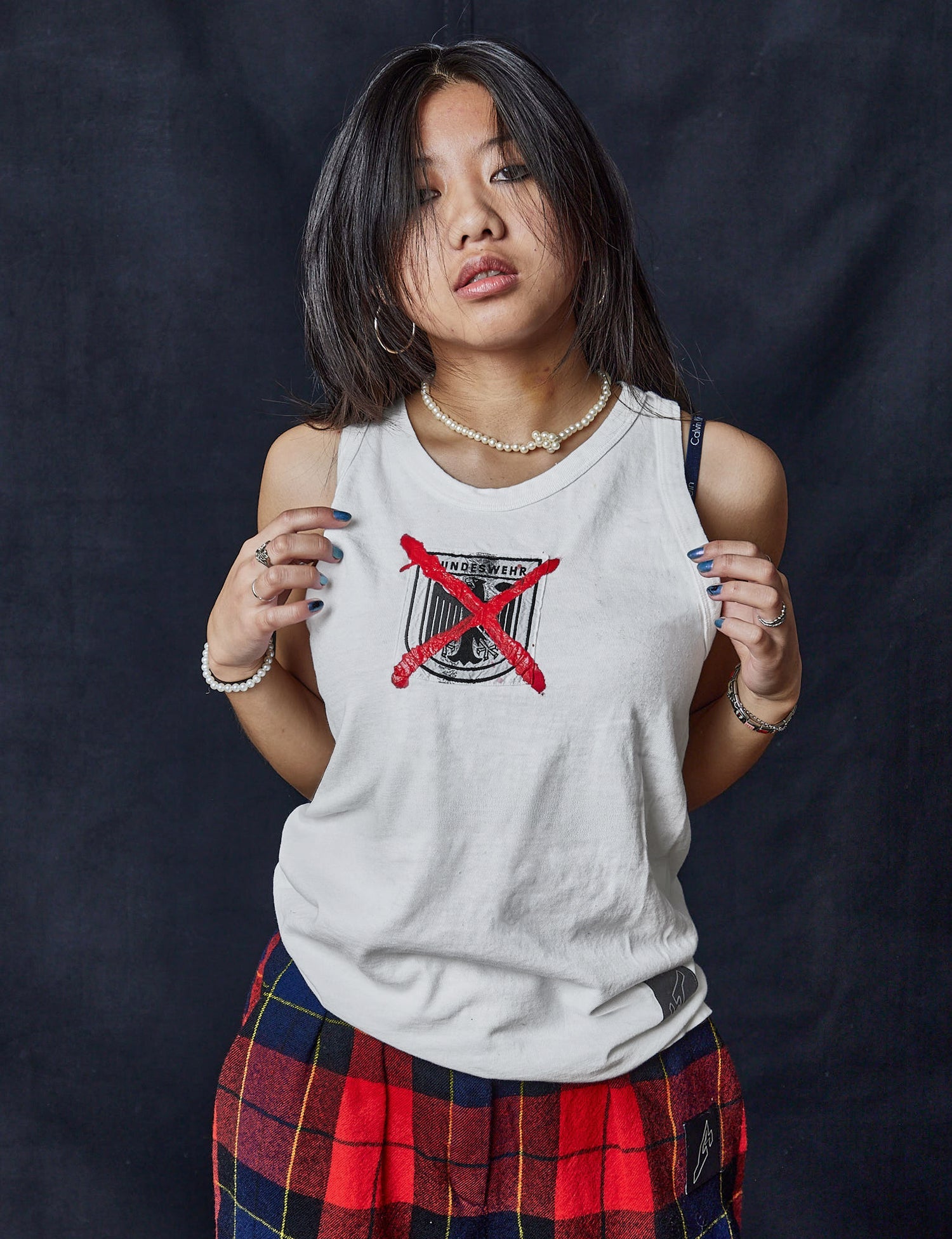 Decommissioned Vintage Bundeswehr Army Vest. 100% cotton slightly distressed, decommissioned with a hand painted Red Cross across the Bundeswehr Eagle patch as an anti war statement.