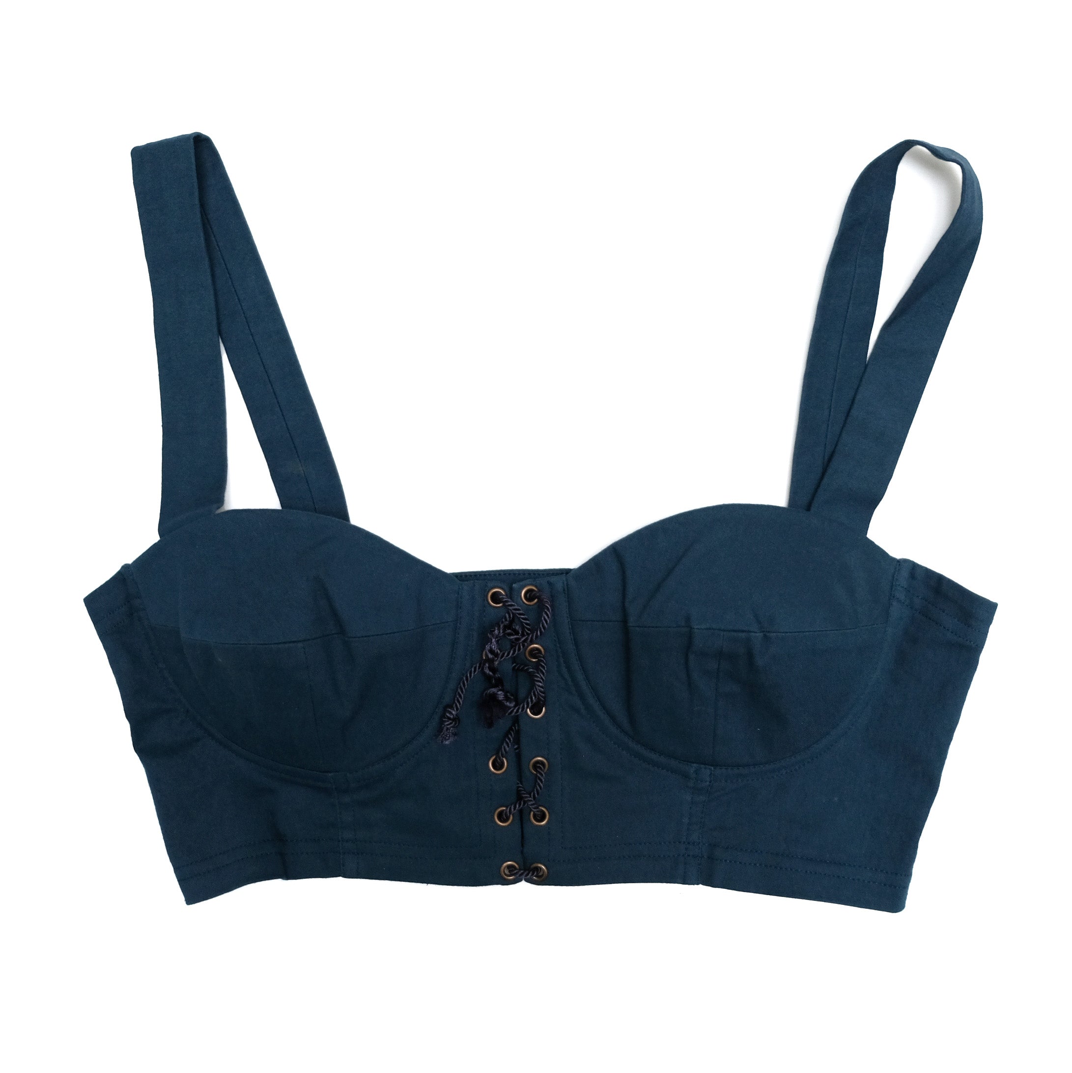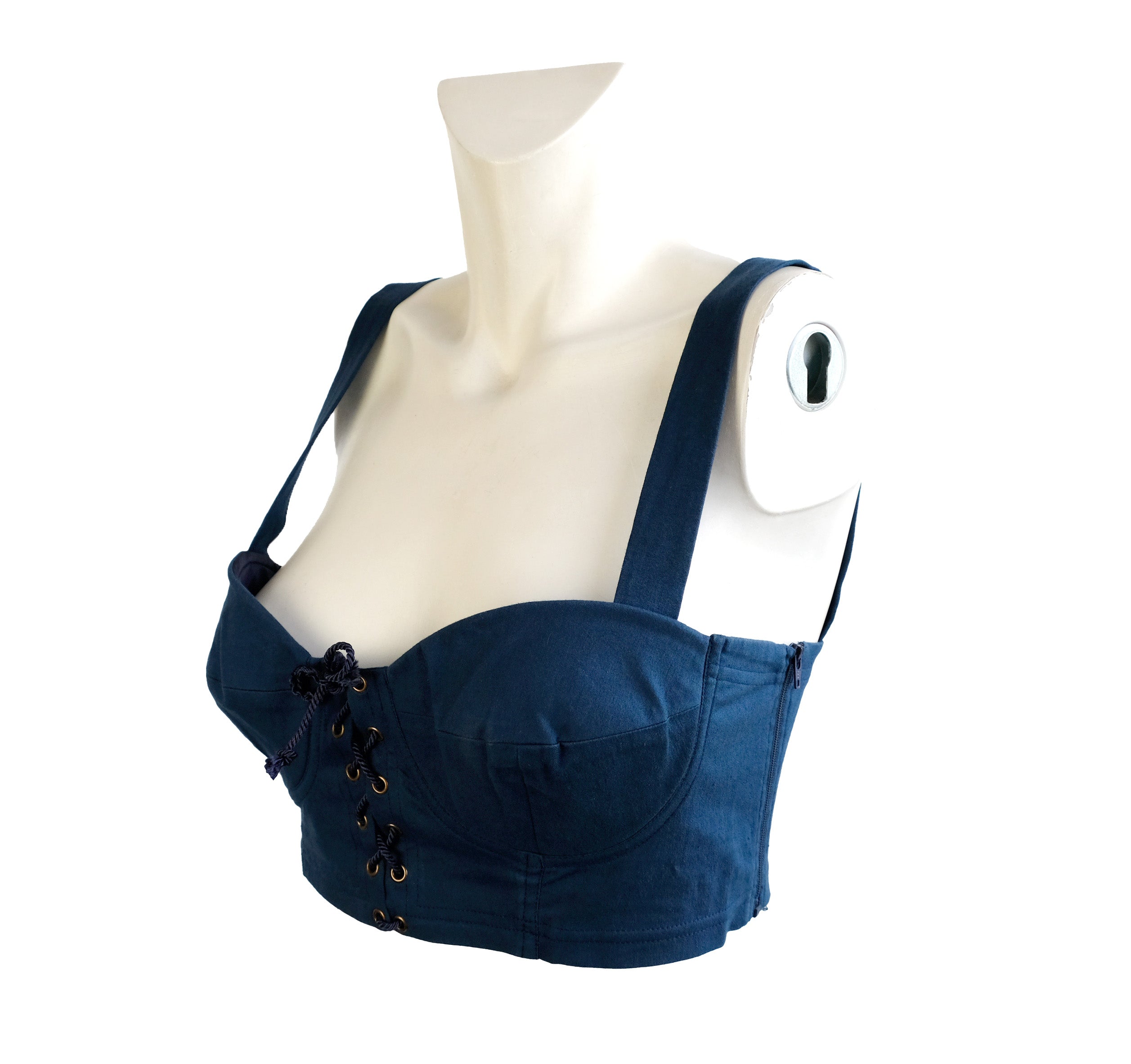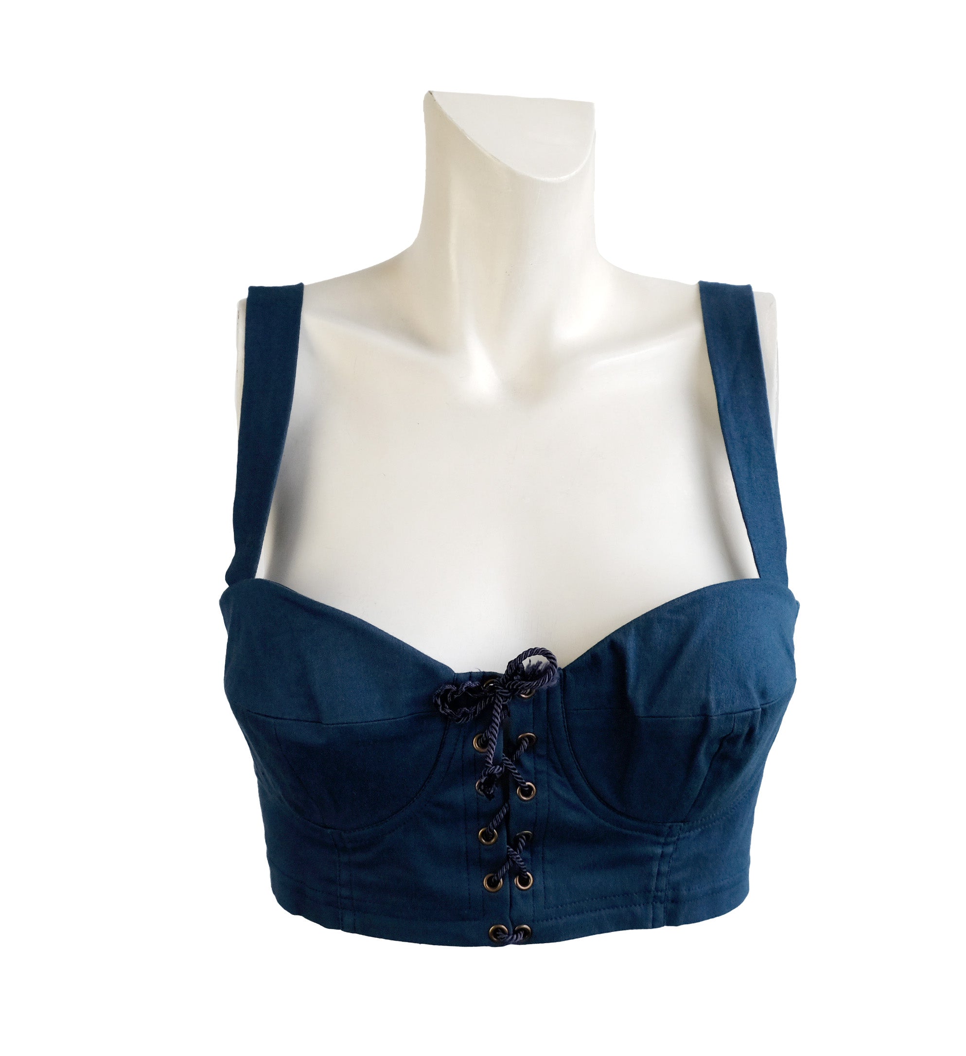 Cropped corset with shoulder straps , fitted and moulded bust. Lacing at the front with navy cord. Side zip.