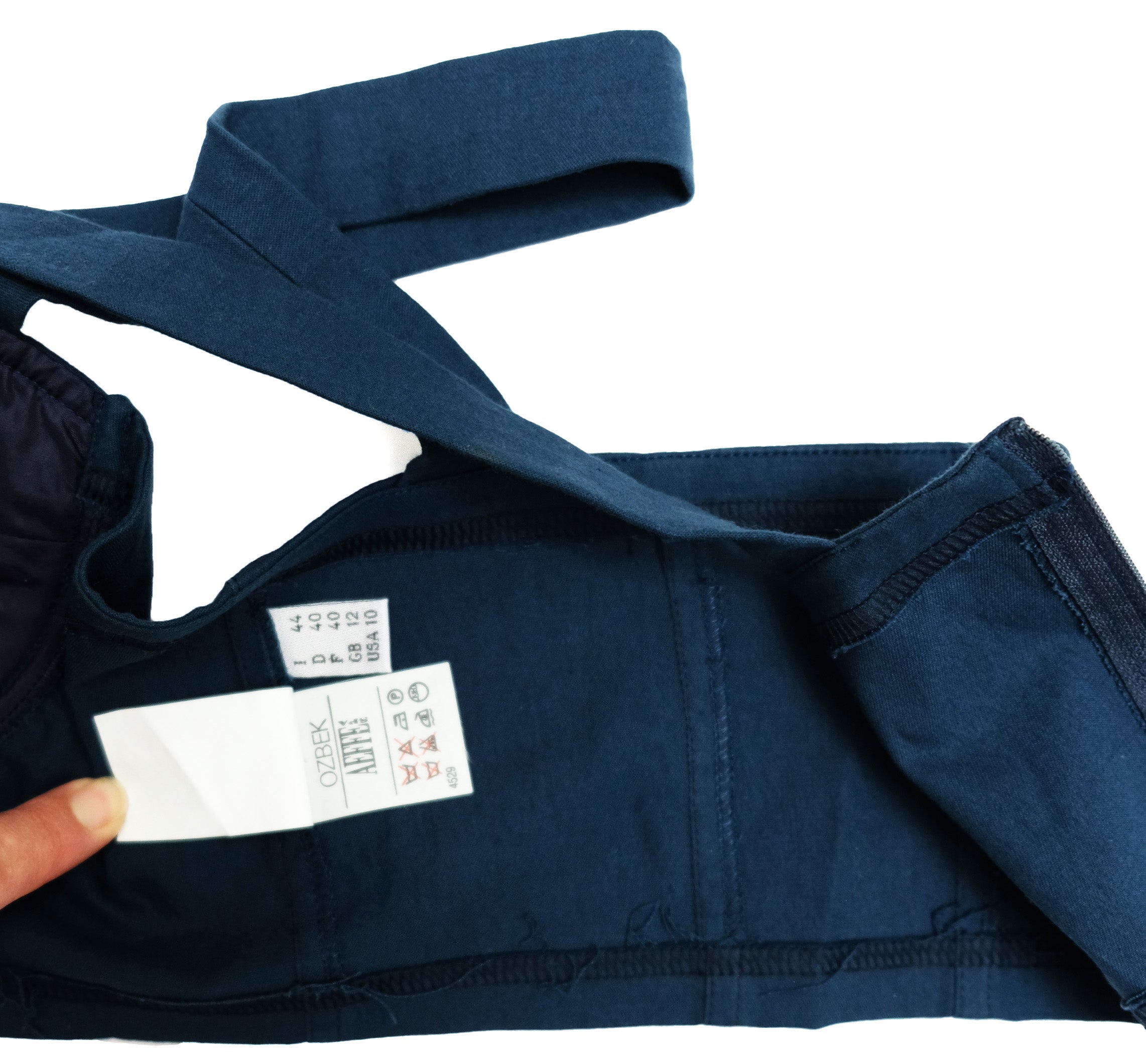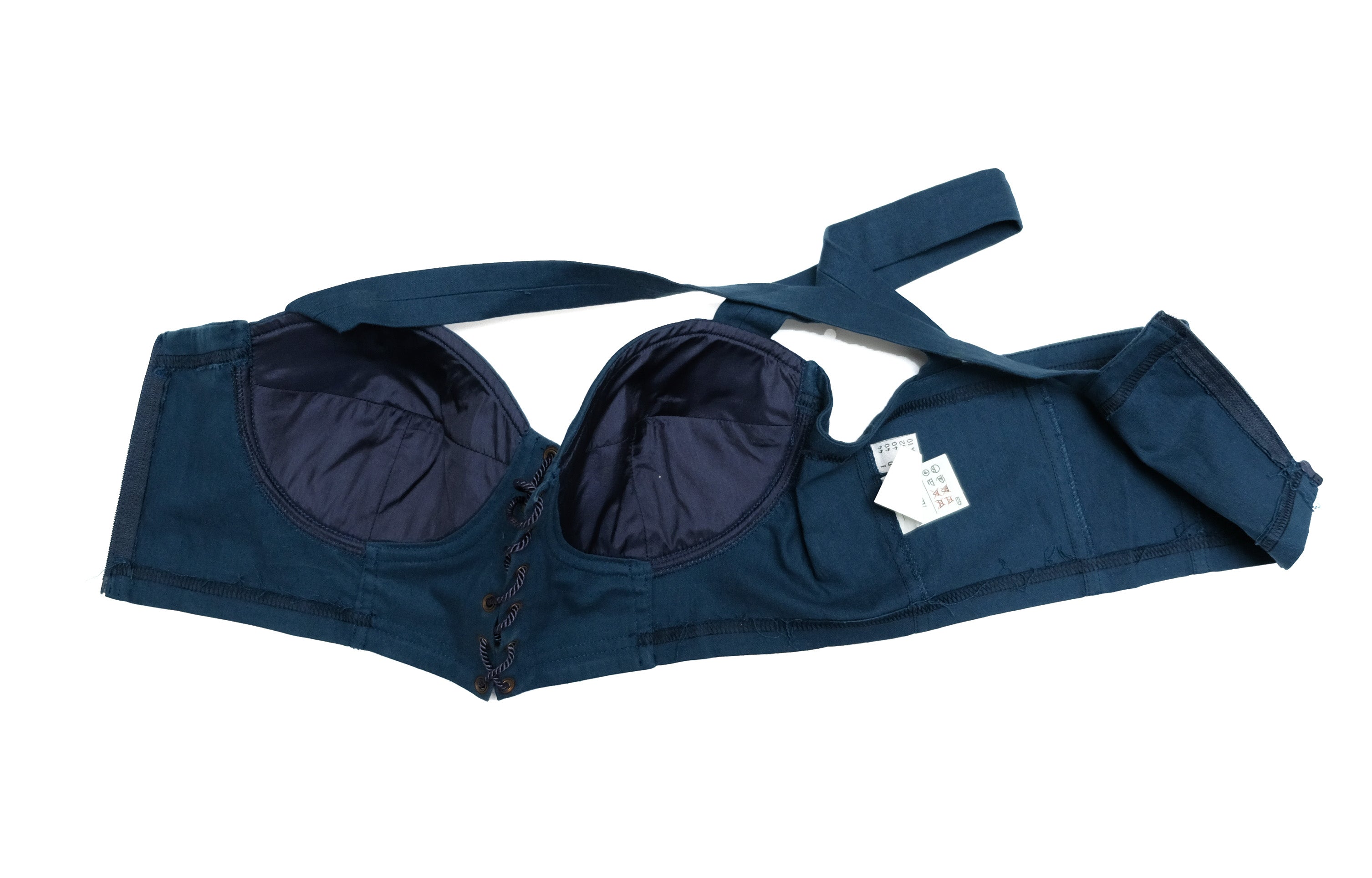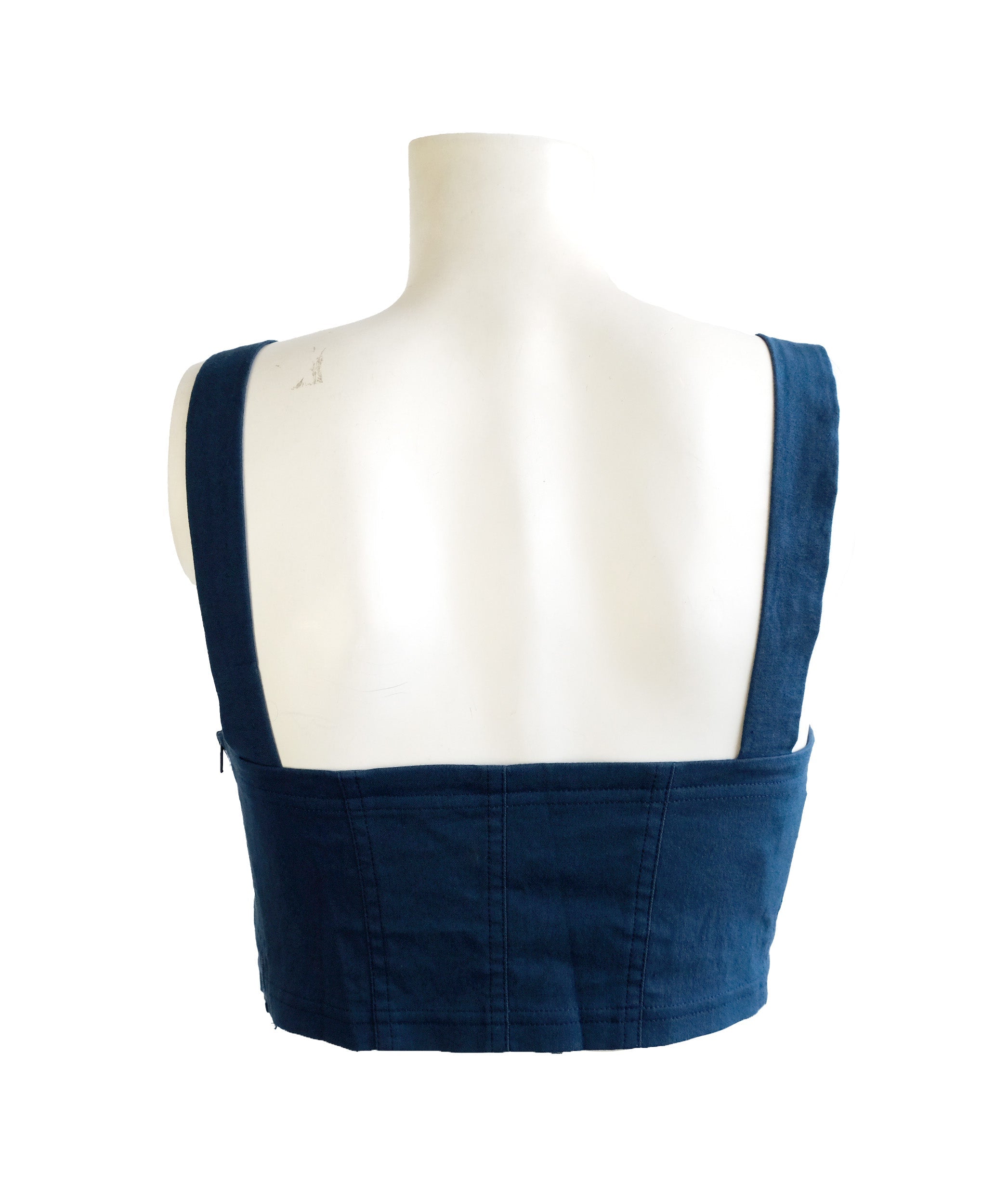 Cropped corset with shoulder straps , fitted and moulded bust. Lacing at the front with navy cord. Side zip.
