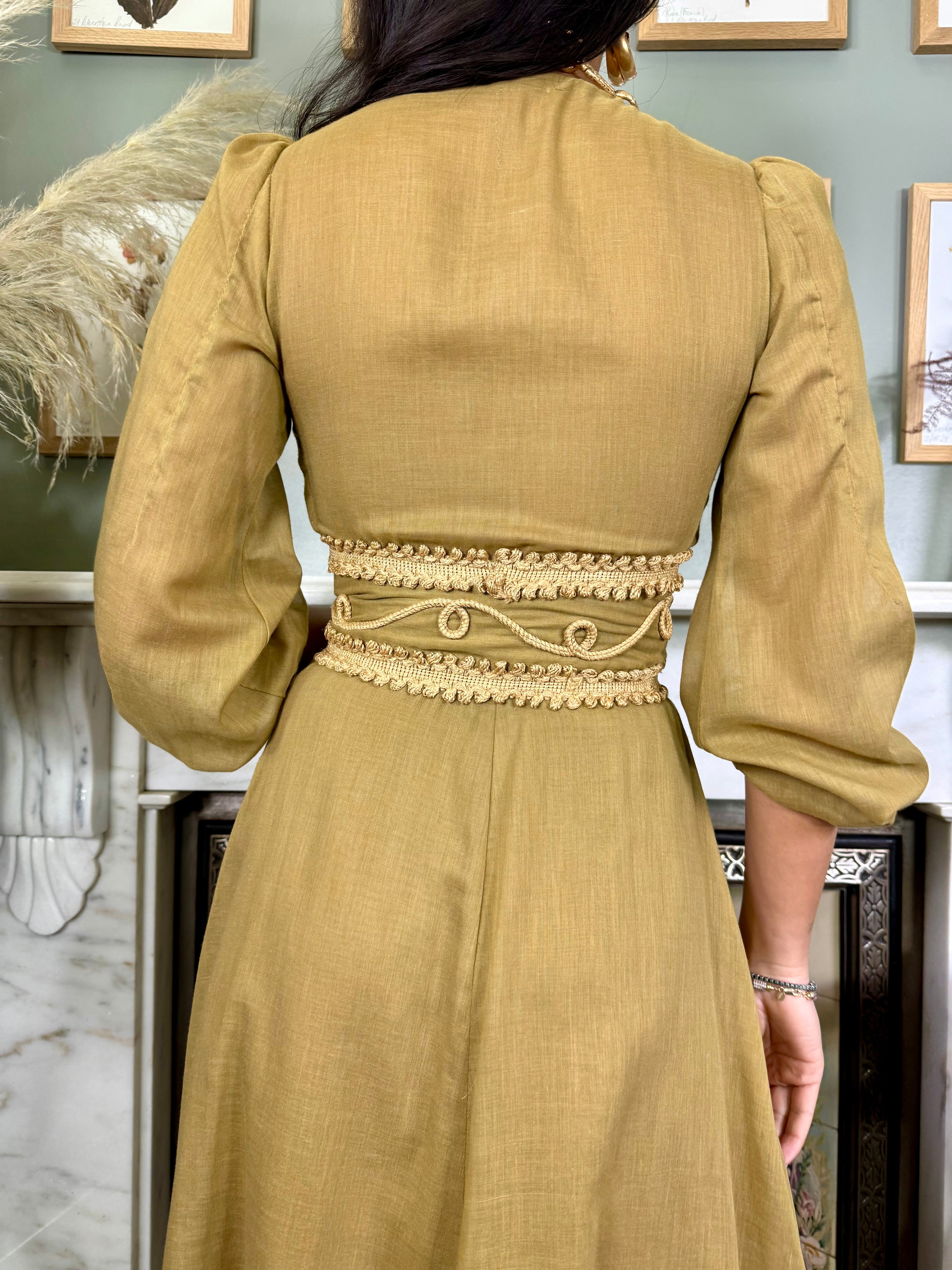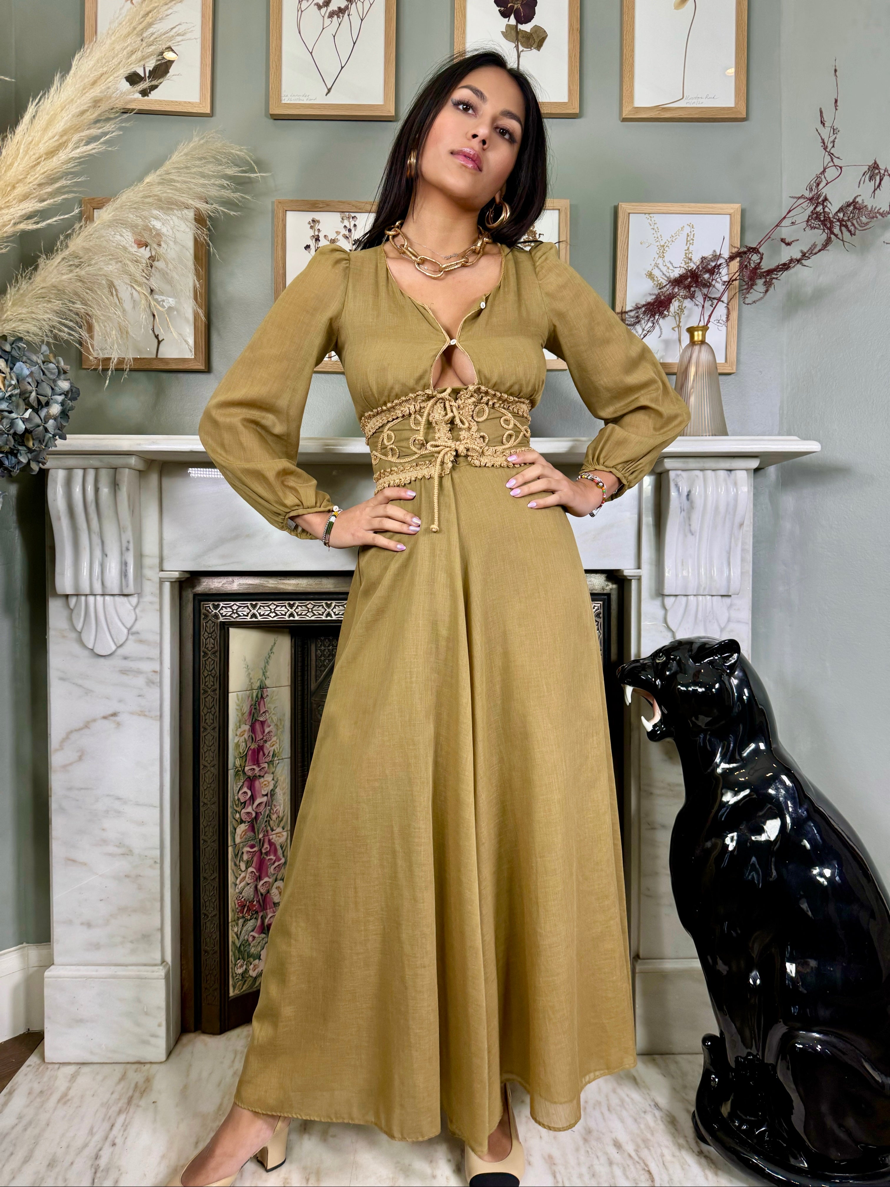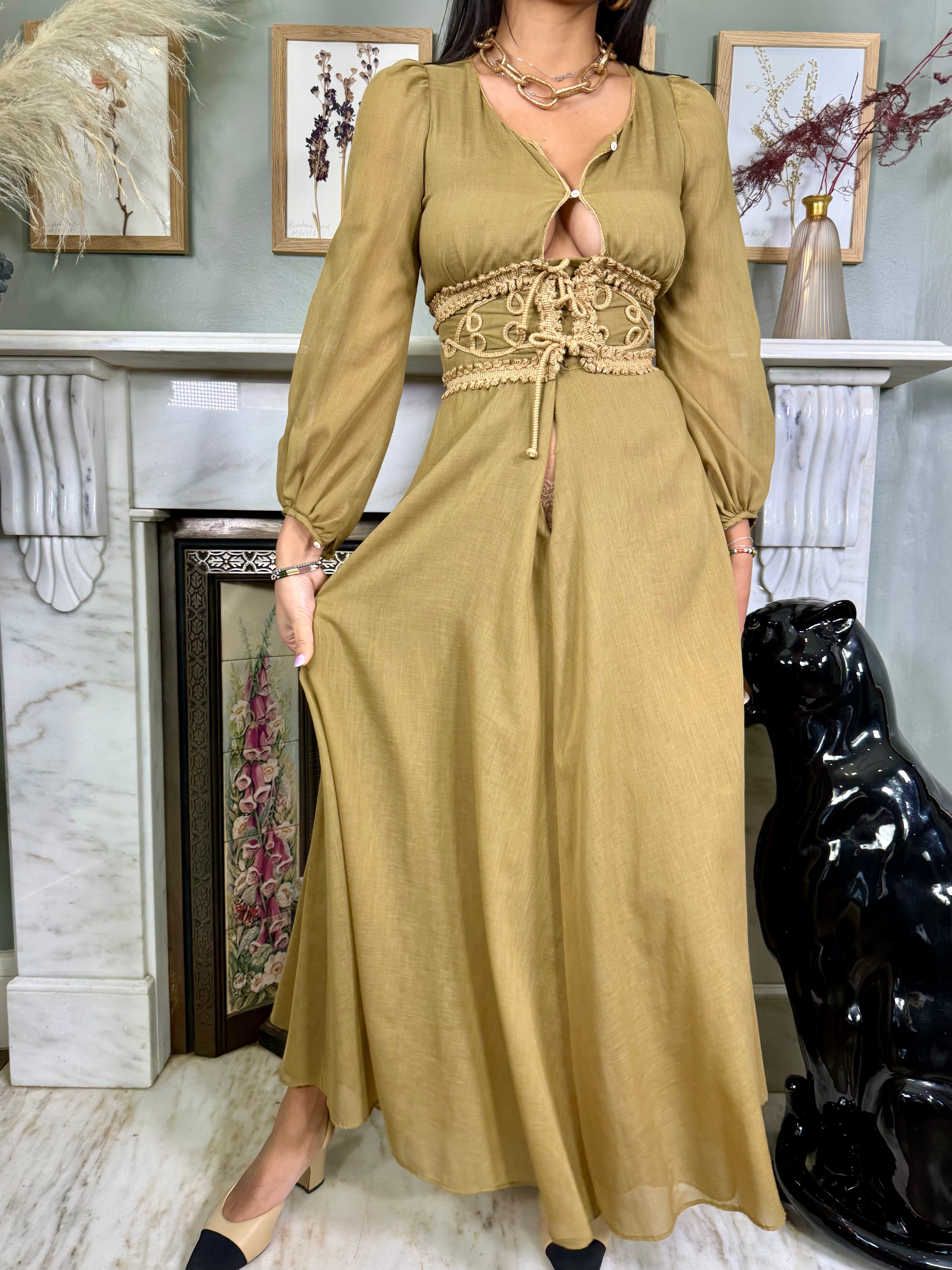Gorgeous 70s cotton camel dress. Has long sleeves, a round neckline with 3 centre buttons, an A line fit and fastens on the front with hooks. The waistband has an intricate cord design that also ties in the front. A beautiful safari vibes dress.
