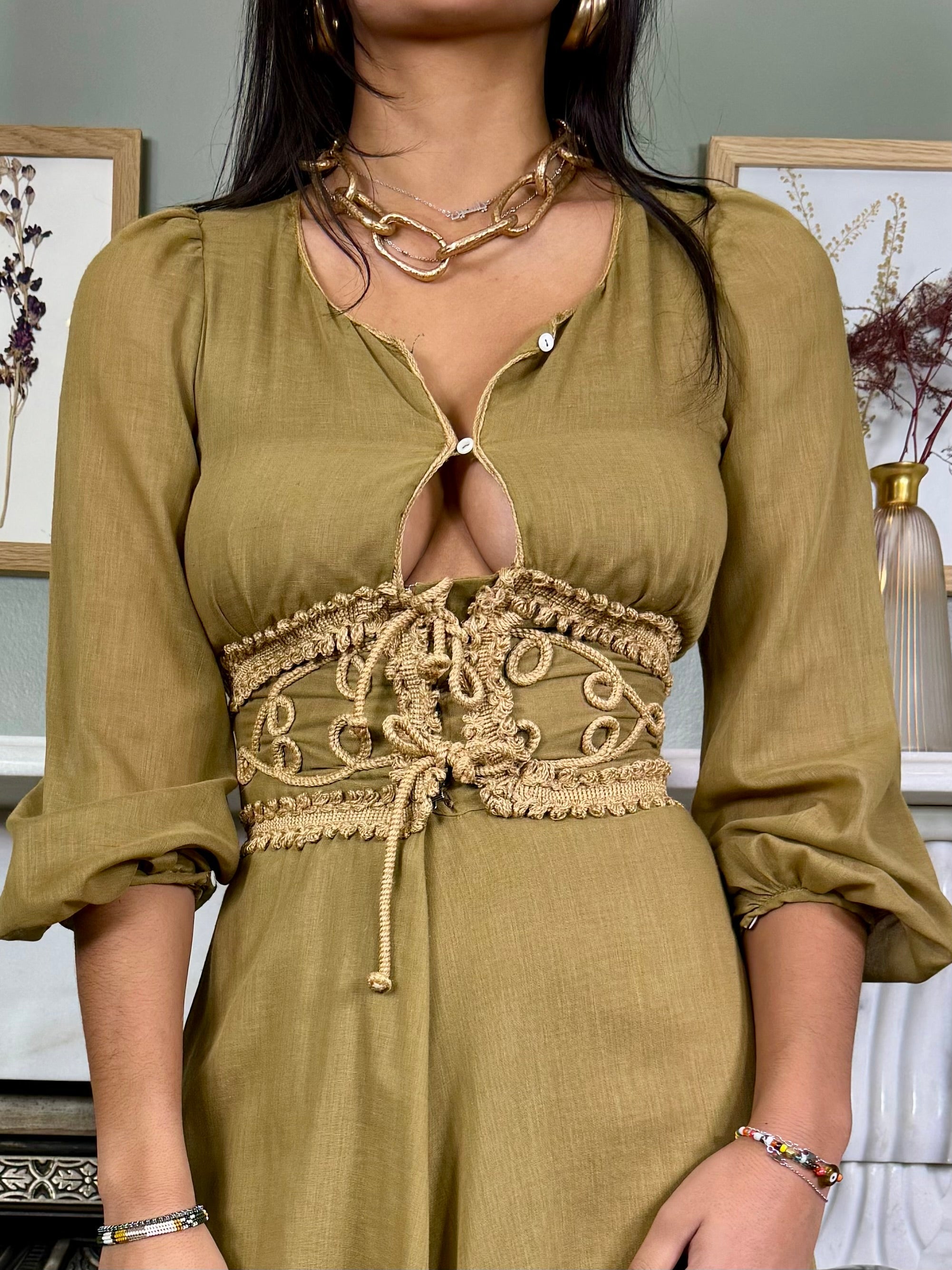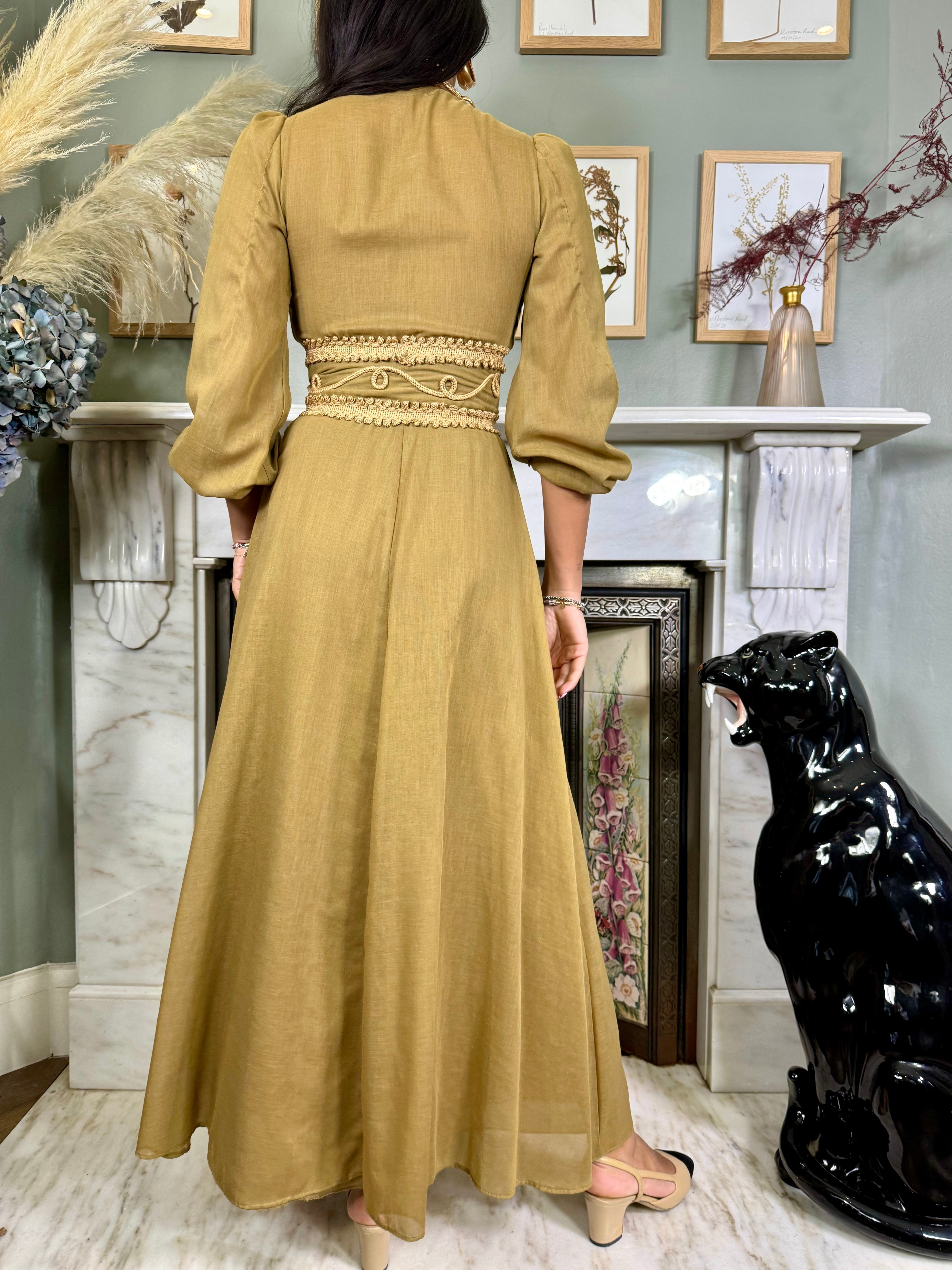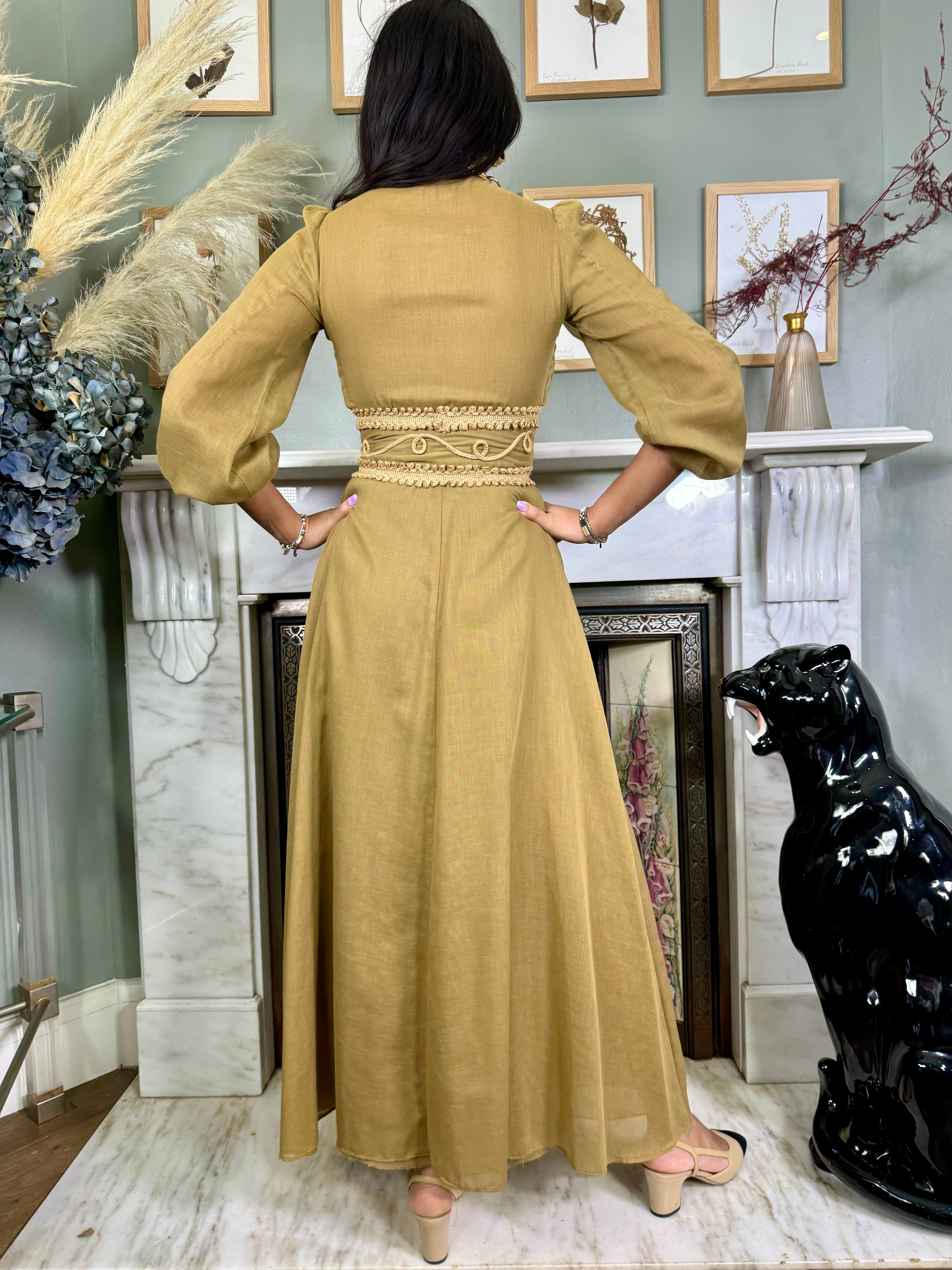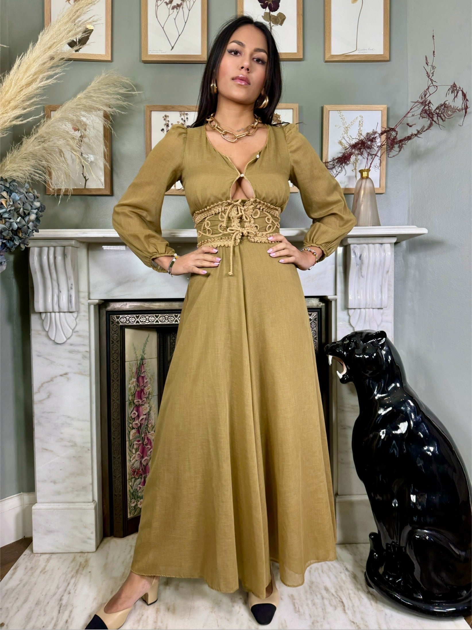 Gorgeous 70s cotton camel dress. Has long sleeves, a round neckline with 3 centre buttons, an A line fit and fastens on the front with hooks. The waistband has an intricate cord design that also ties in the front. A beautiful safari vibes dress.