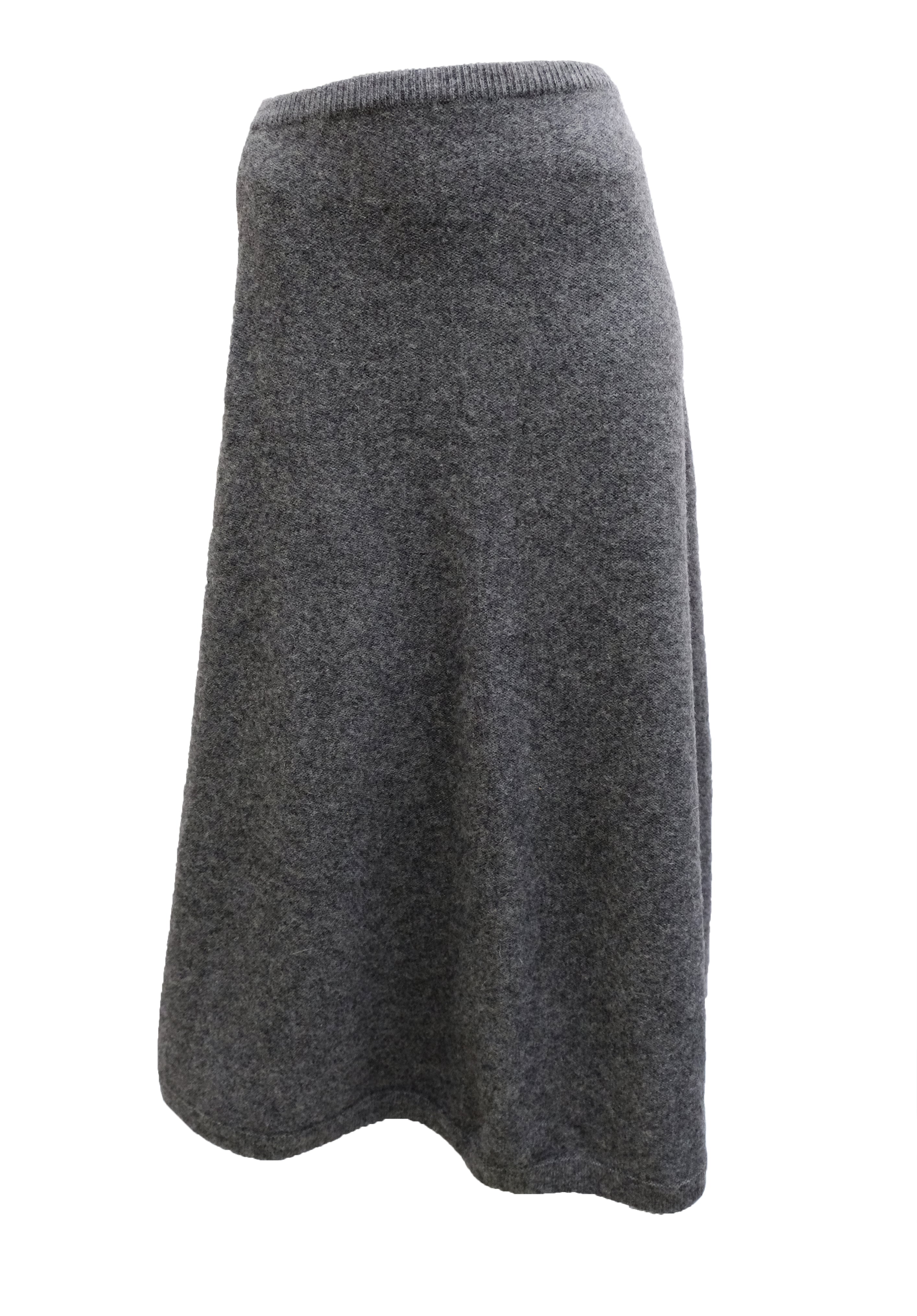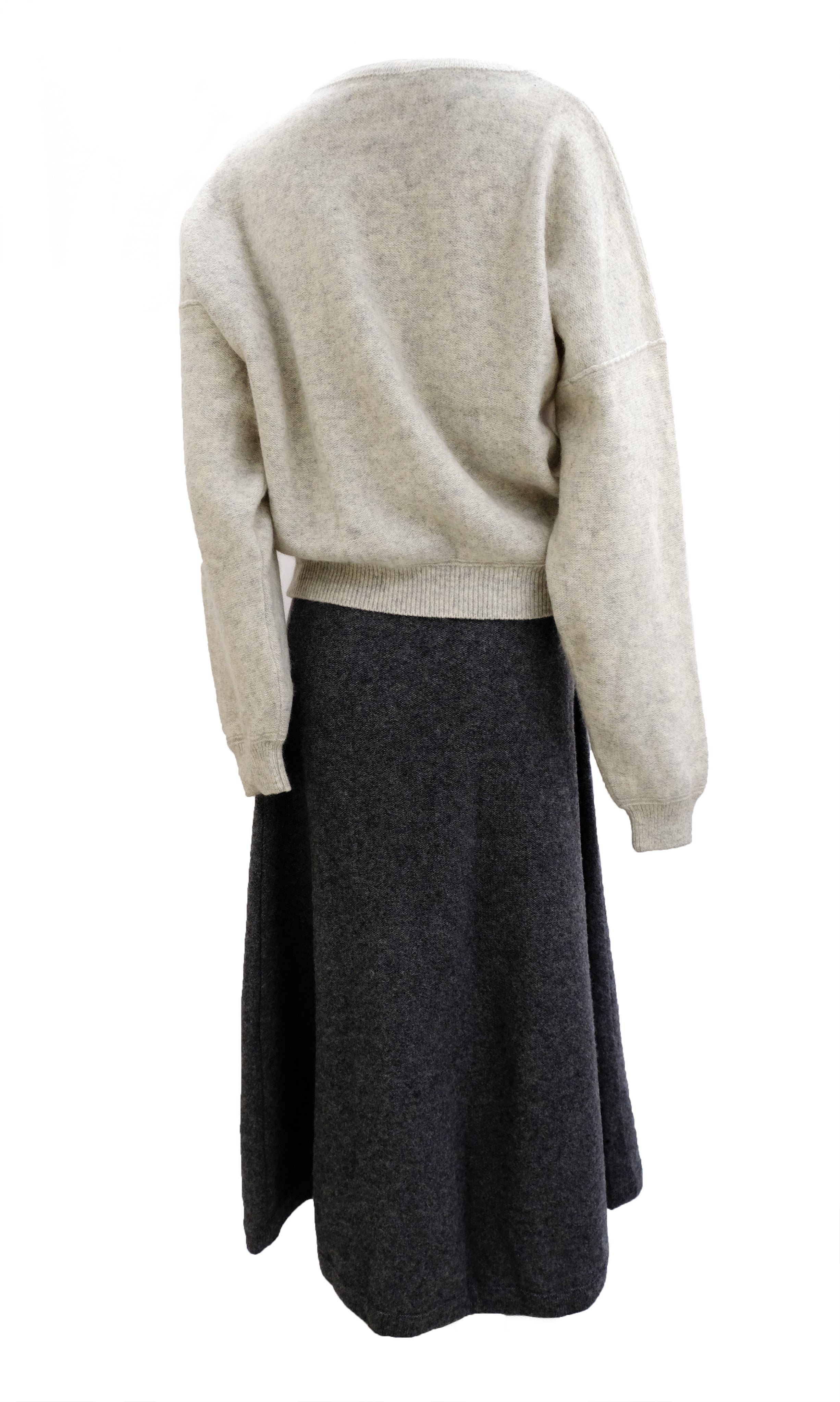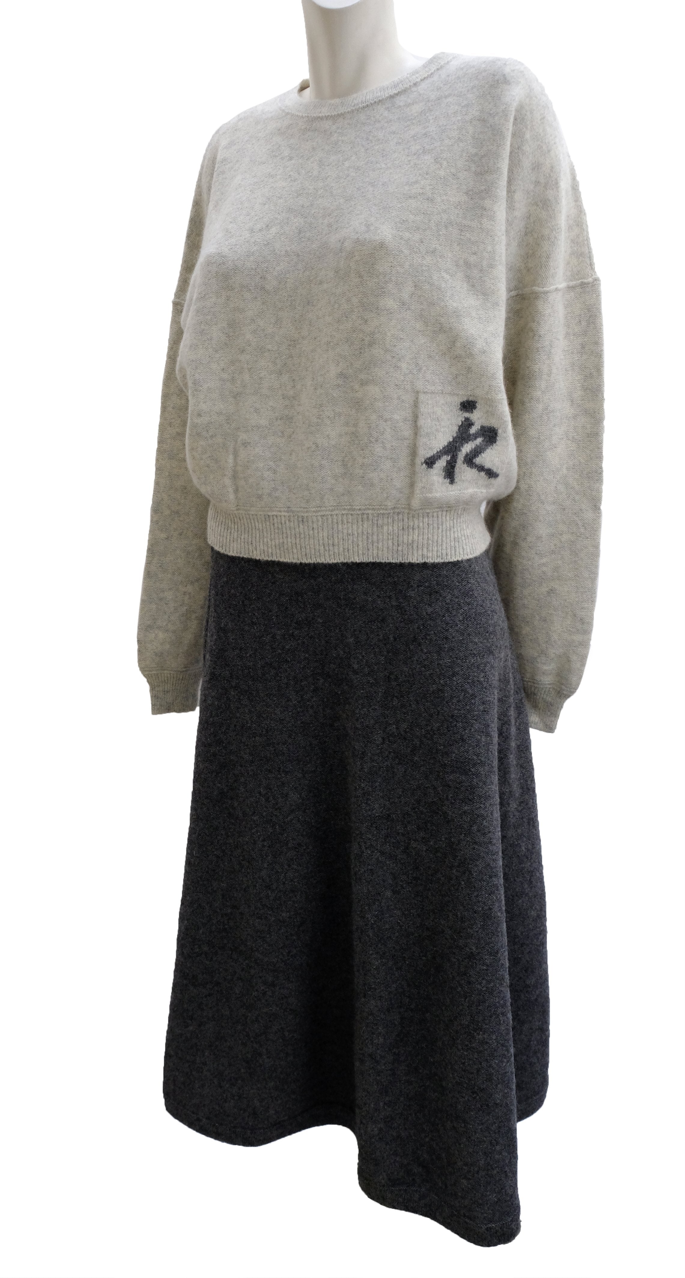 The skirt is A line, long to mid calf, in slate grey plain knit. The jumper is palest grey, wide fitting in matching plain knit, with round neck, dropped shoulders and long sleeves. The letters iR are knitted into the front.