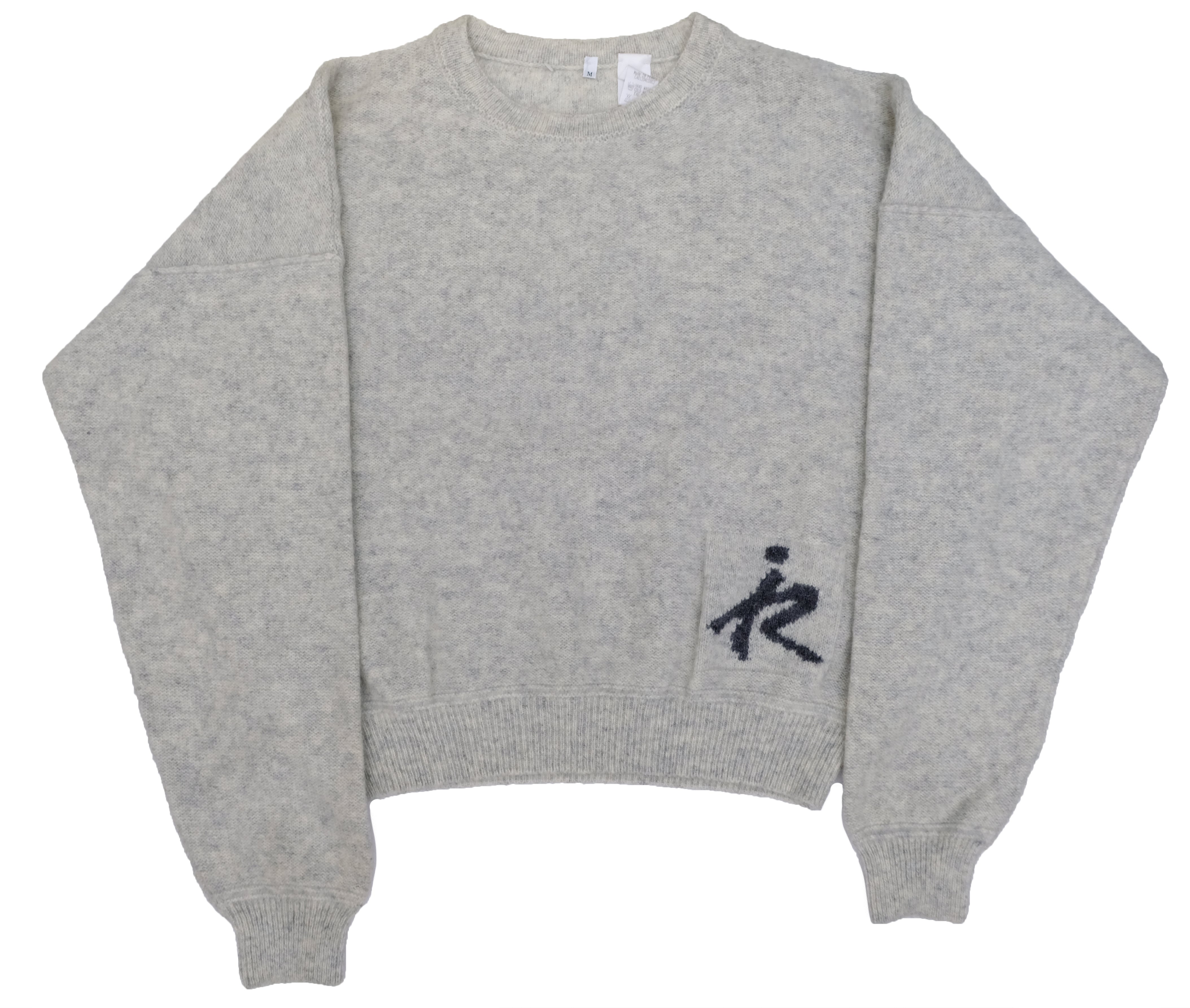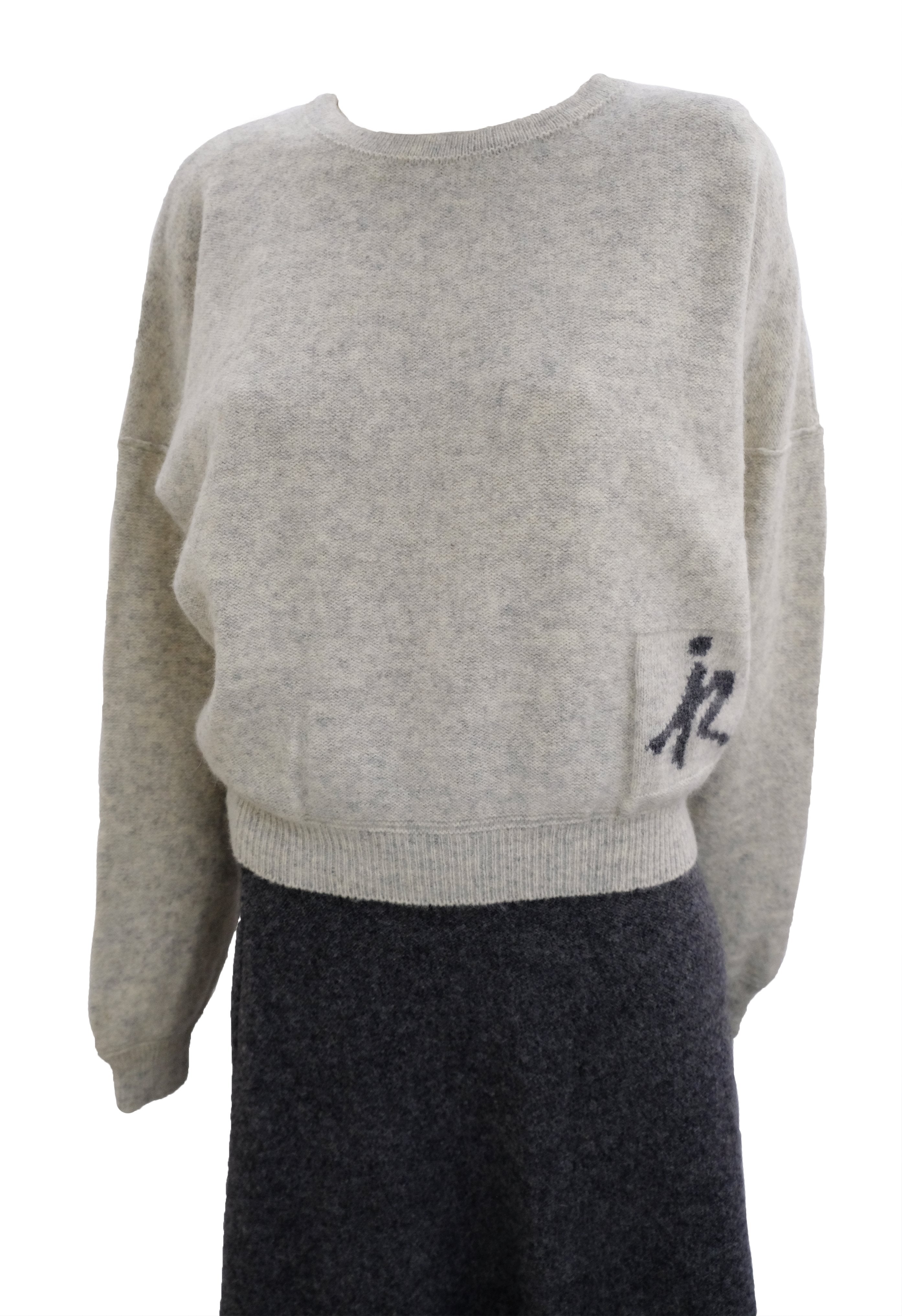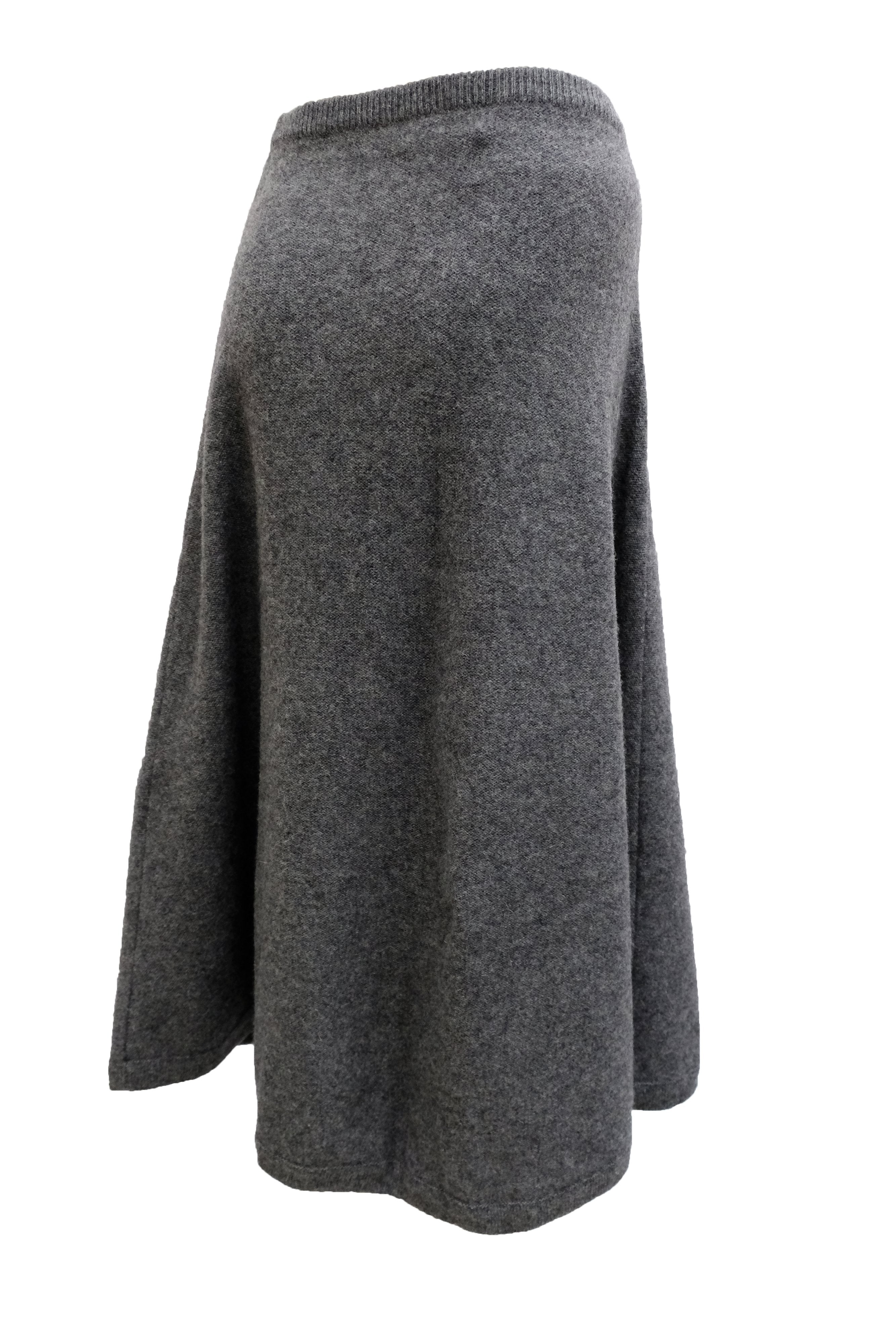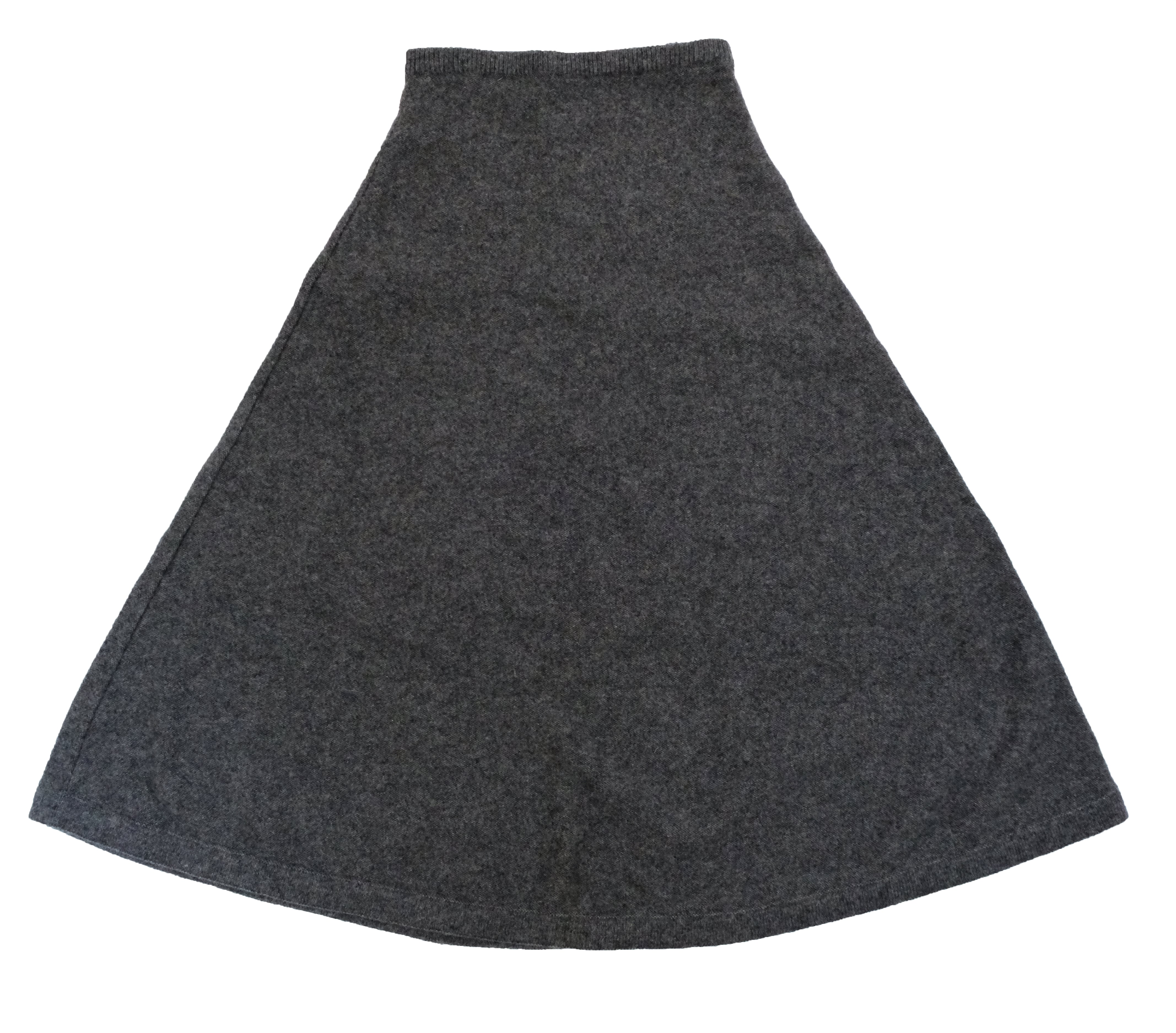 The skirt is A line, long to mid calf, in slate grey plain knit. The jumper is palest grey, wide fitting in matching plain knit, with round neck, dropped shoulders and long sleeves. The letters iR are knitted into the front.