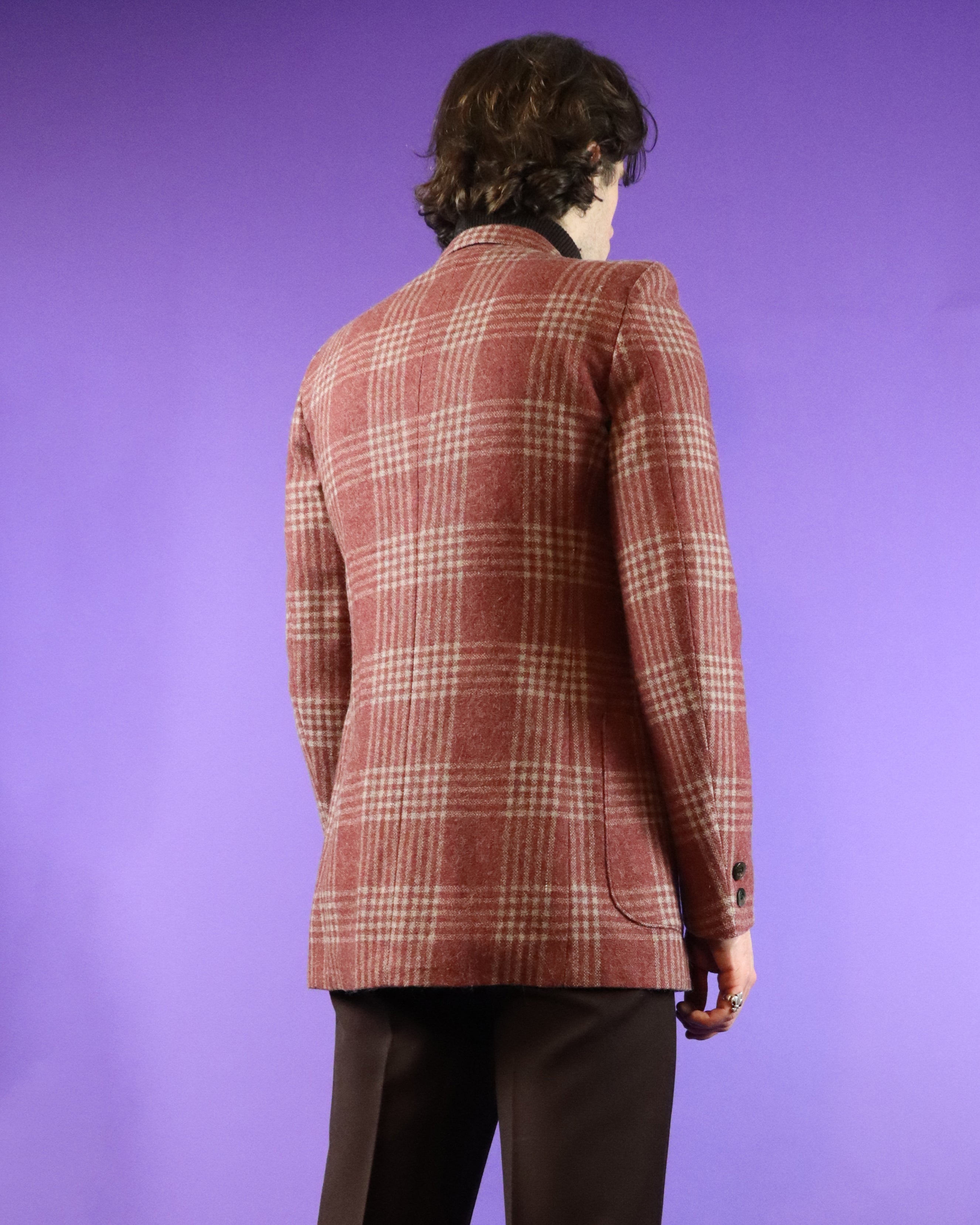 Vintage 1970s tailored plaid blazer. Fantastic super 70s cut- wide lapelled, shoulder pads, patch pockets and slim fit. The soft woollen fabric has a lovely weight to it and hangs perfectly on wear. Gorgeous soft red and beige colourway. Fully lined for comfort. Finished with pearlescent buttons. A special piece in fantastic condition.