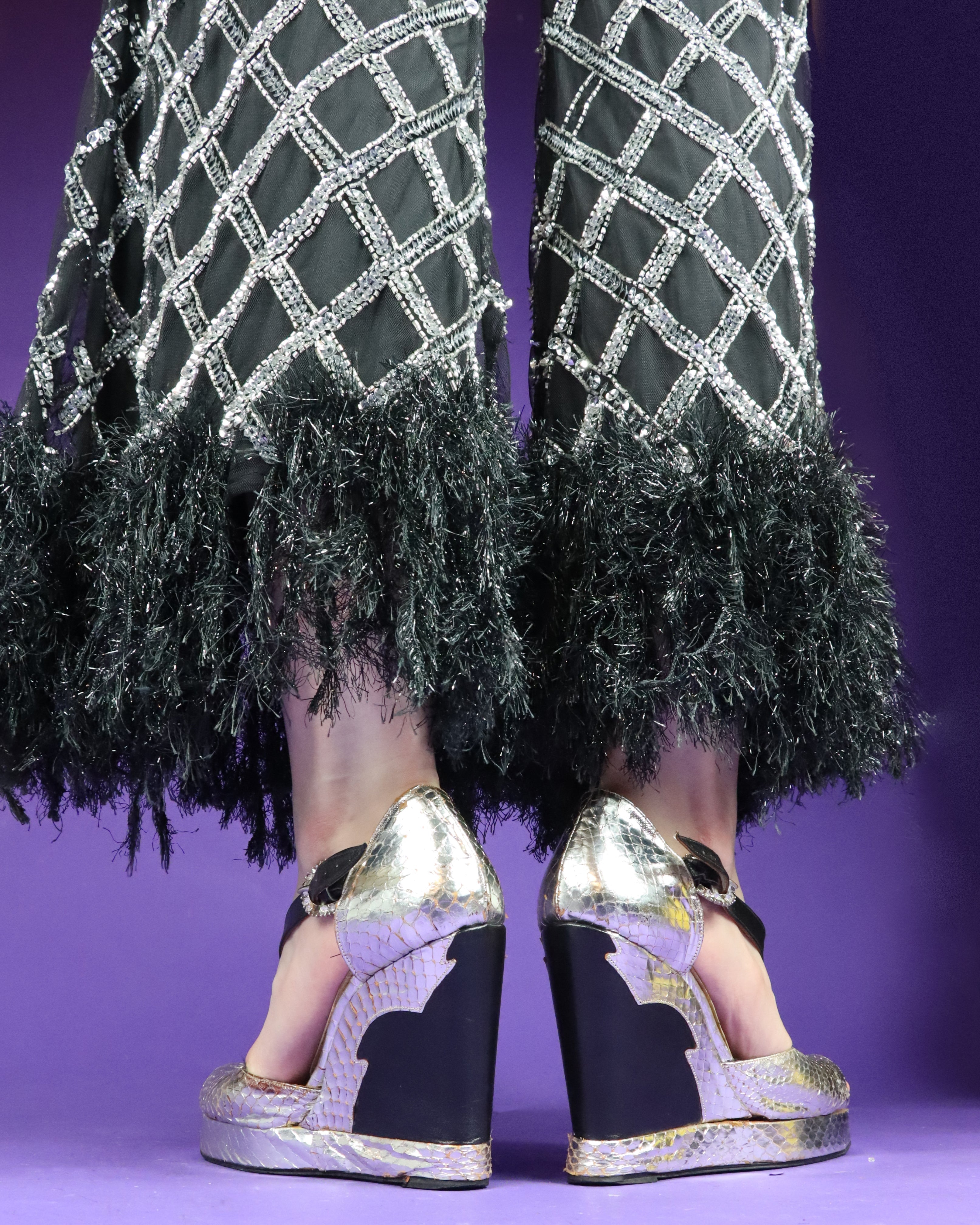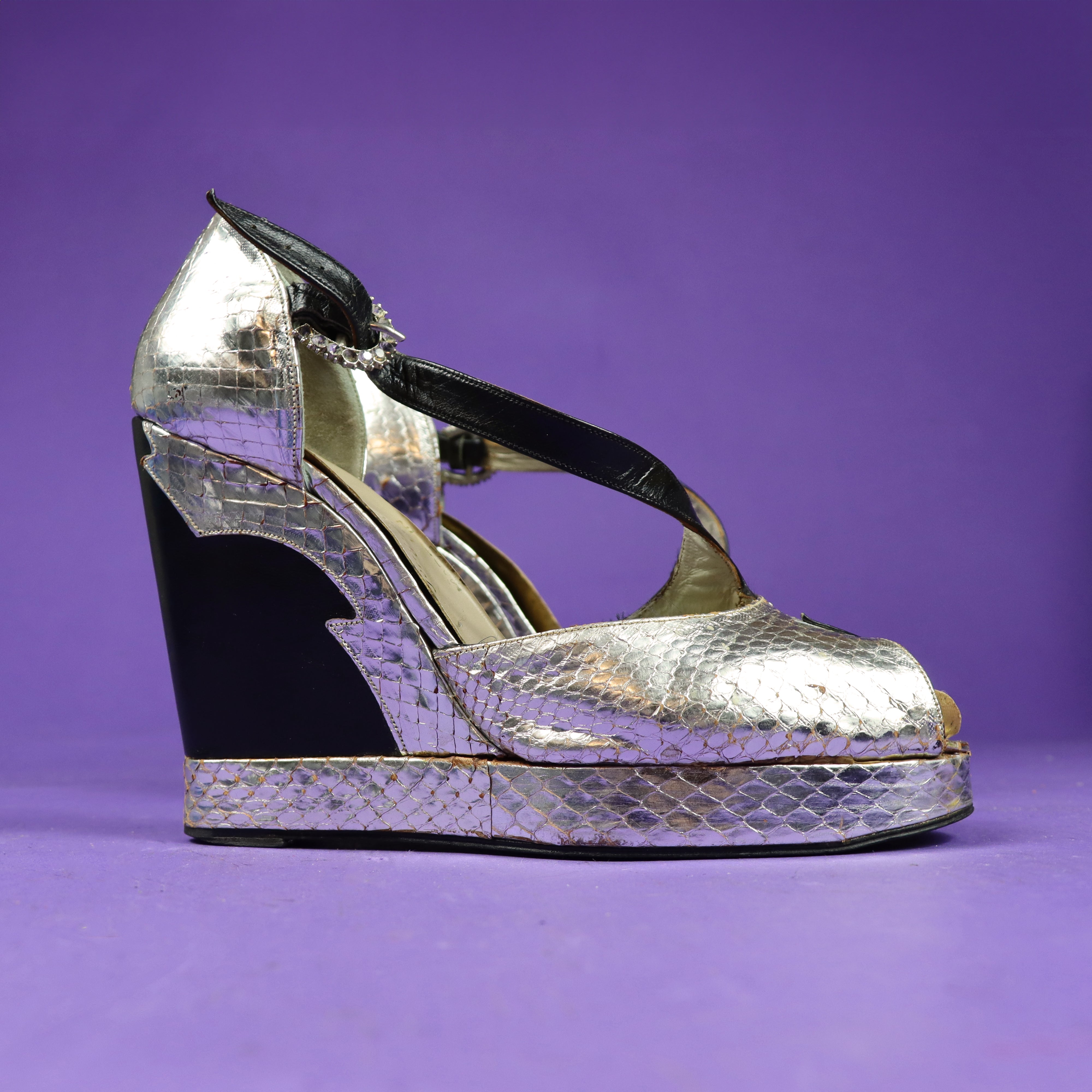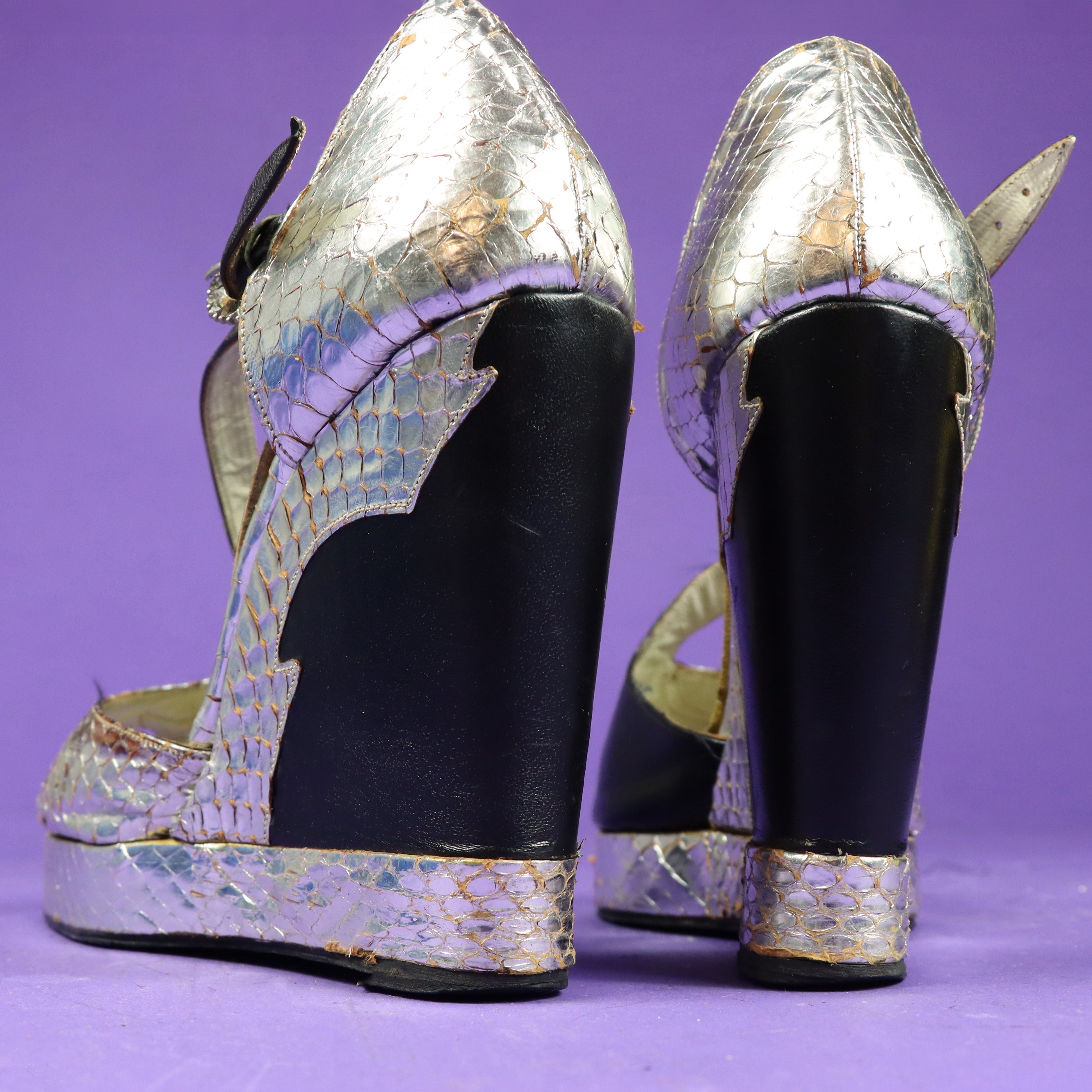 Ultra rare & collectible vintage 1970s platform wedge shoes by the late, great Terry De Havilland. High shine silver metallic snakeskin contrasted with black leather flame panels, wedge heel &swirling strap with rhinestone buckle. I love the sculptural way the ankle strap wraps around the foot.