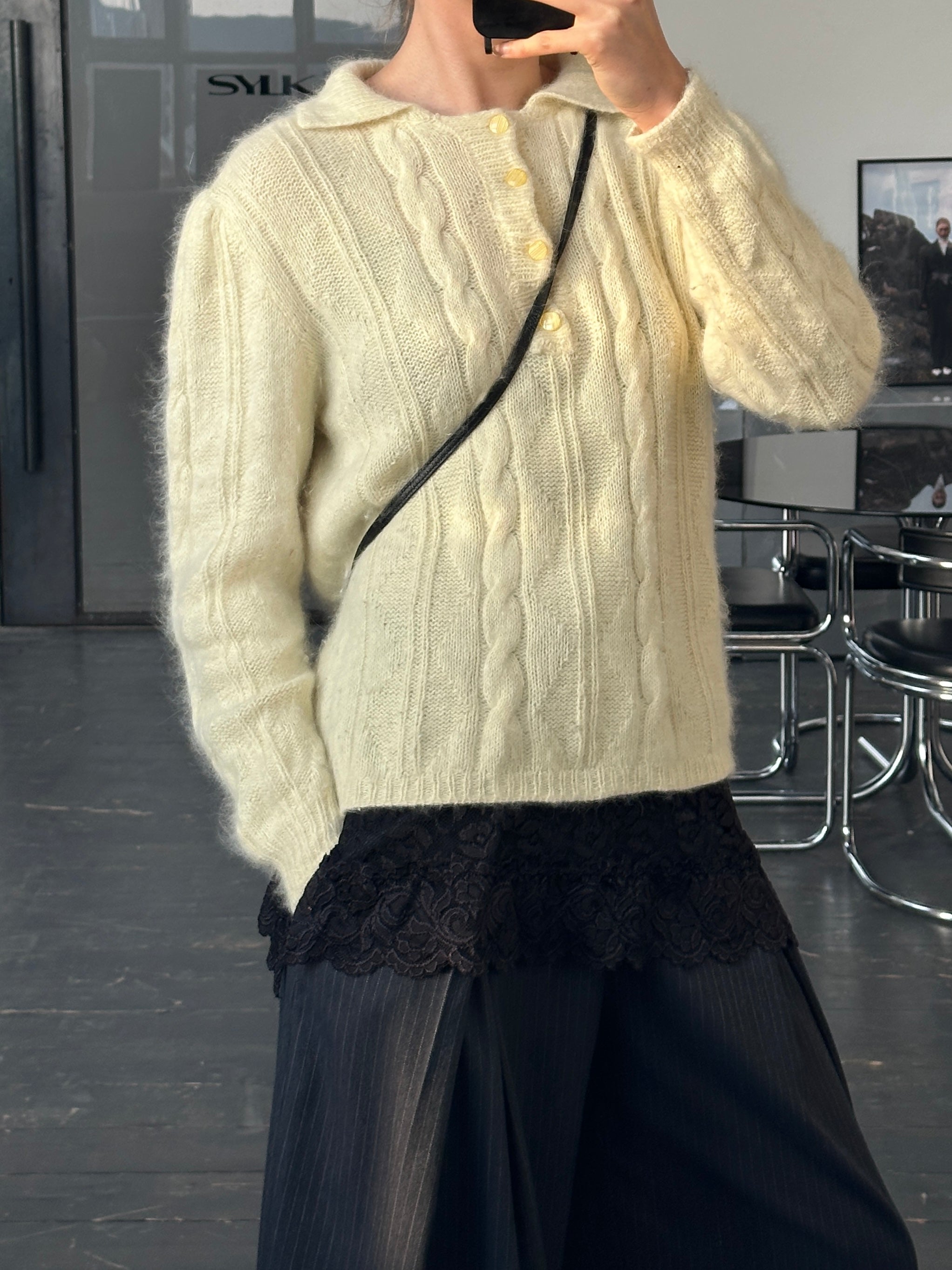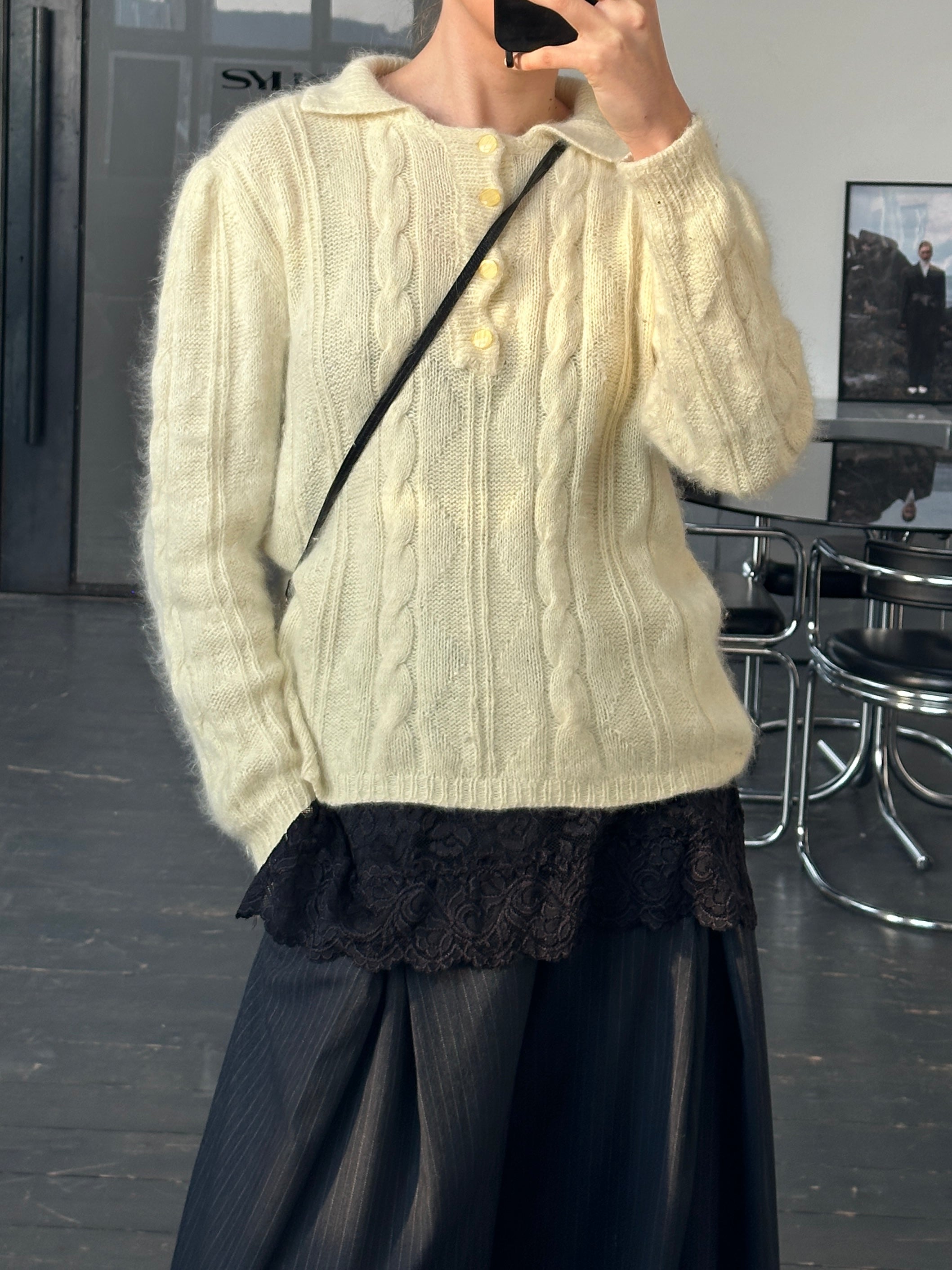A soft vintage 1980s knit polo in a light cream tone, crafted in a brushed mohair yarn with a natural halo finish. Designed with a relaxed silhouette, cable knit detailing and a button placket neckline for an effortless everyday layer.