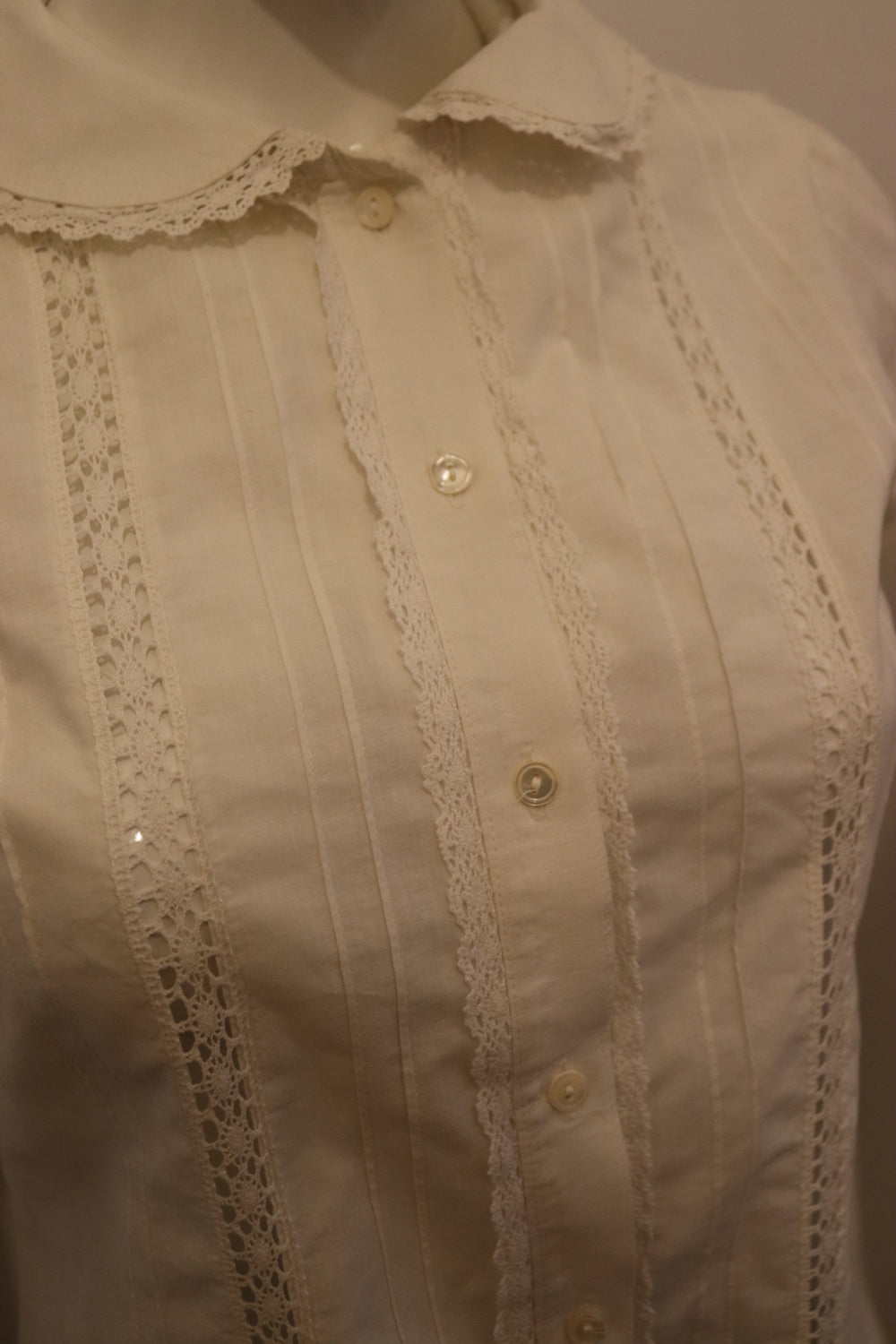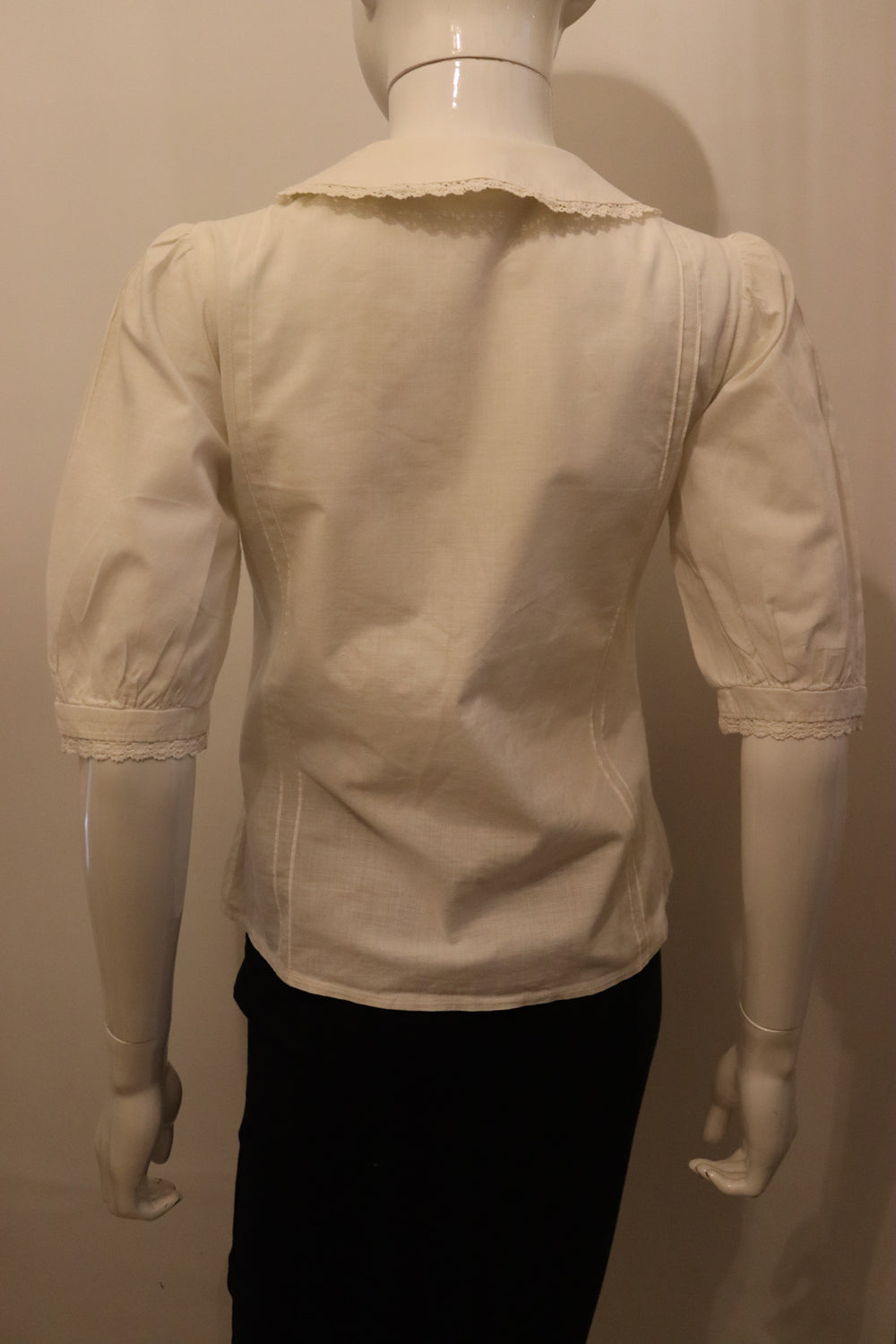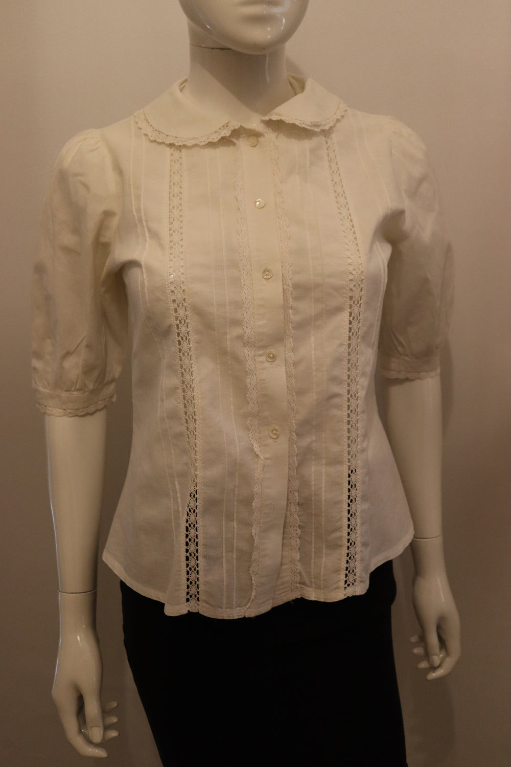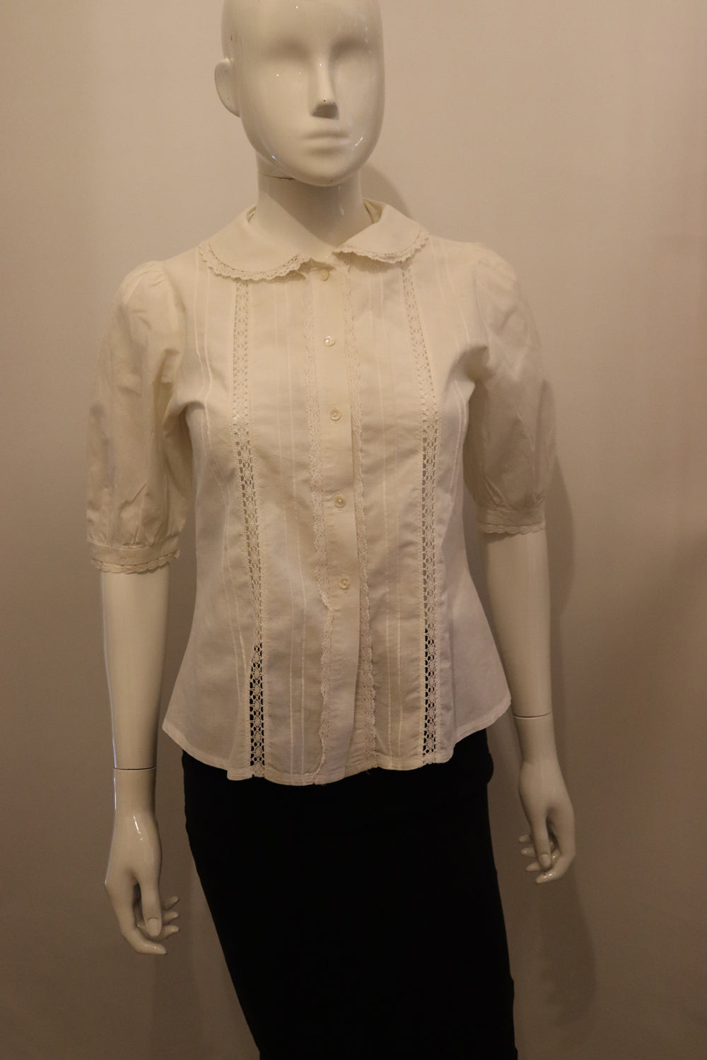 A pretty white vintage blouse, perfect for Spring /Summer . In a heavy cotton, the blouse has a peter pan collar with lace trim and puff sleaves and pin tuck detail. It has a button front opening with lace and pin tuck detail.