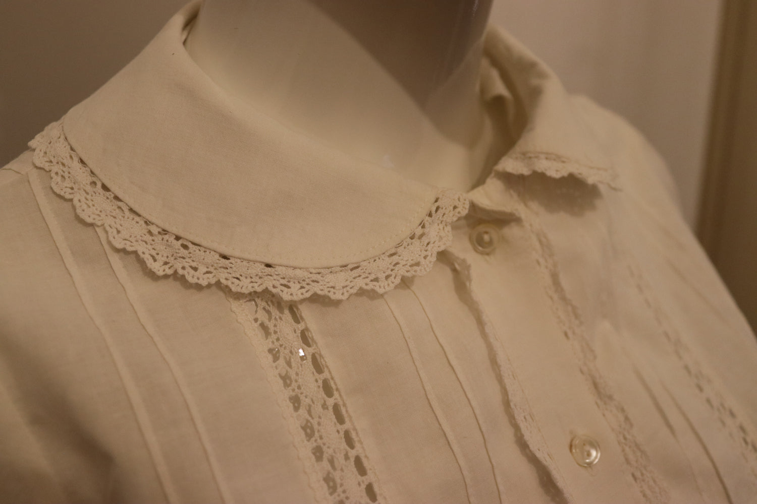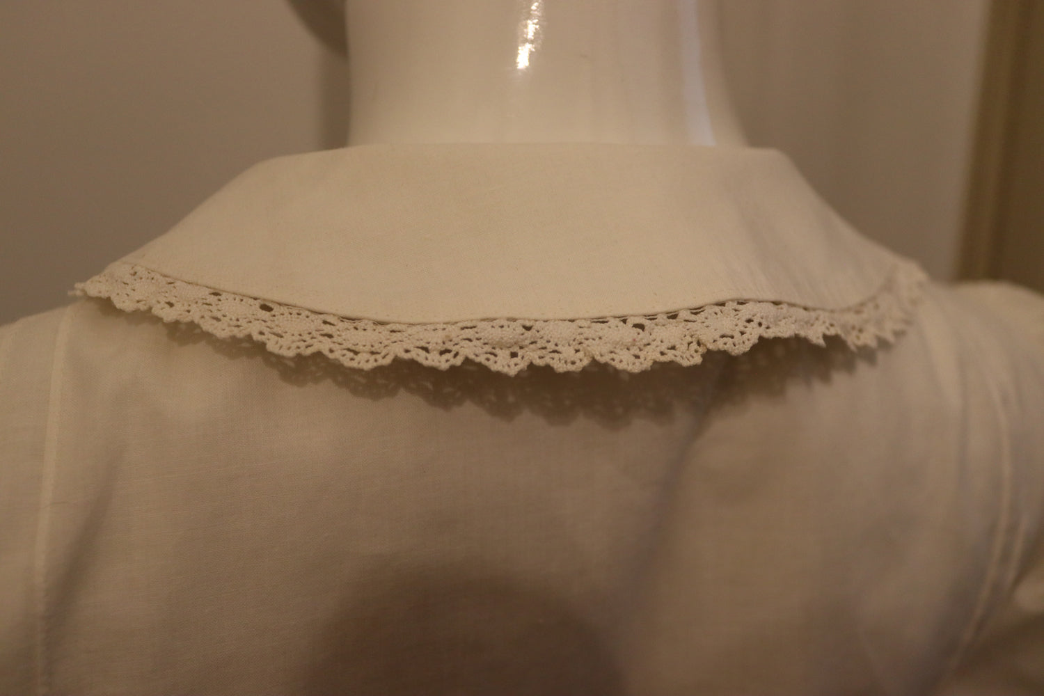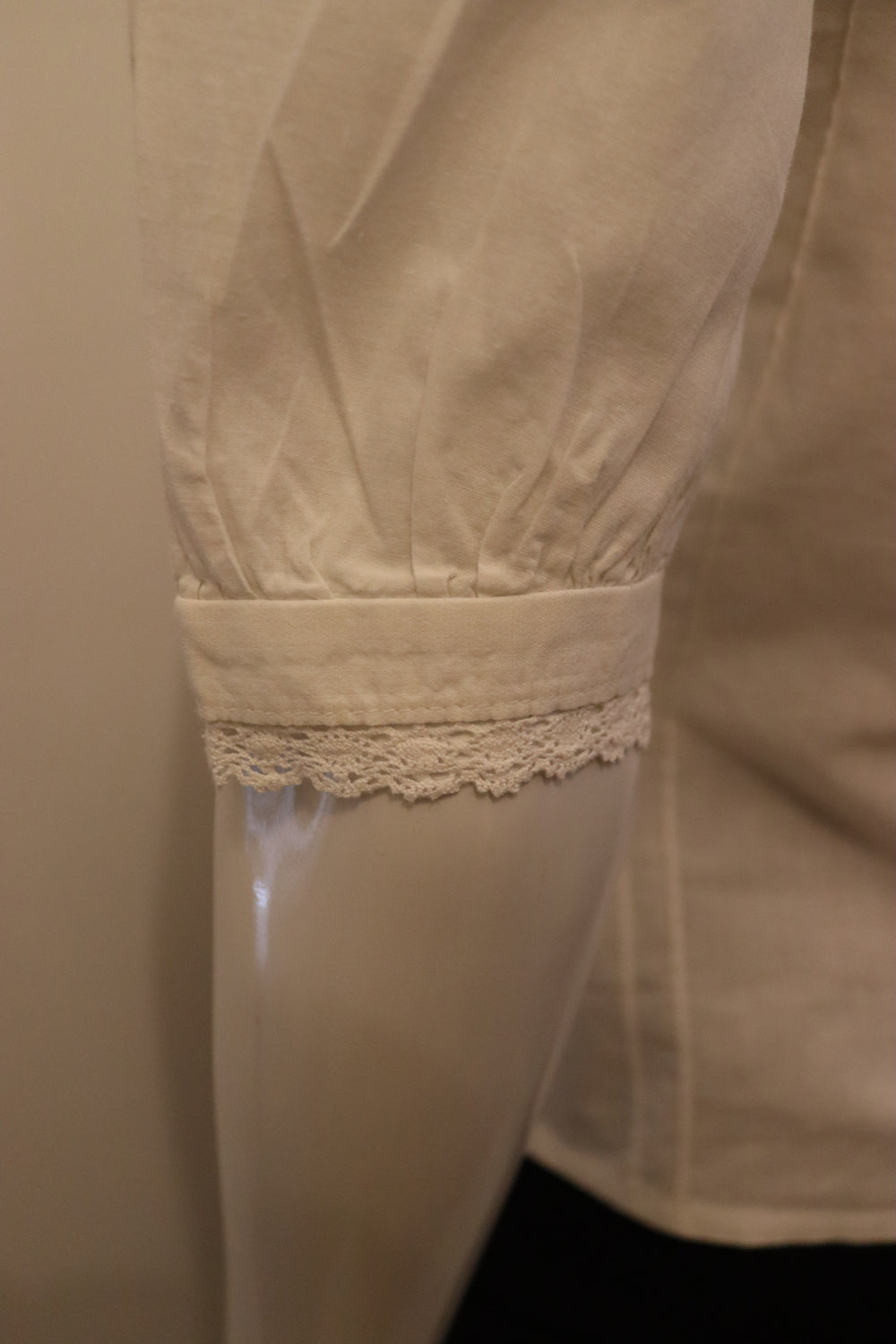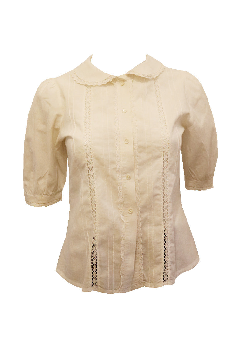 A pretty white vintage blouse, perfect for Spring /Summer . In a heavy cotton, the blouse has a peter pan collar with lace trim and puff sleaves and pin tuck detail. It has a button front opening with lace and pin tuck detail.