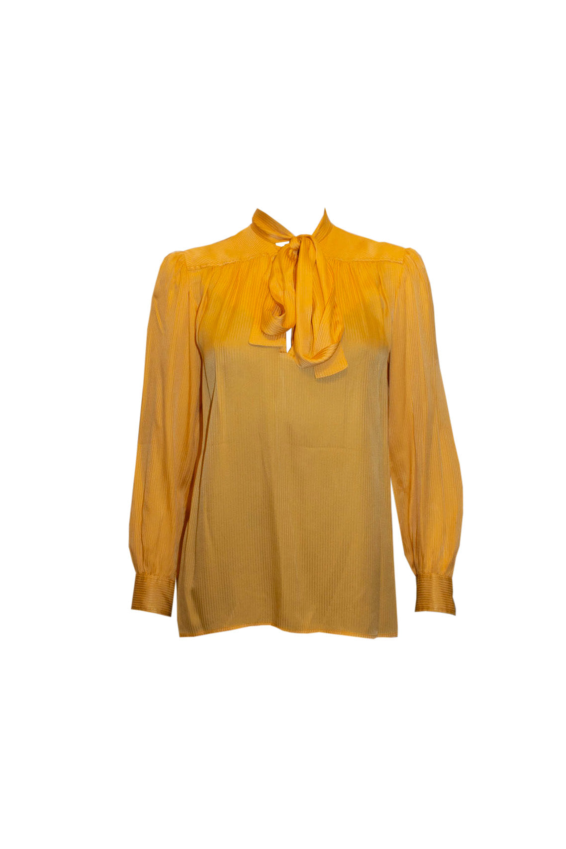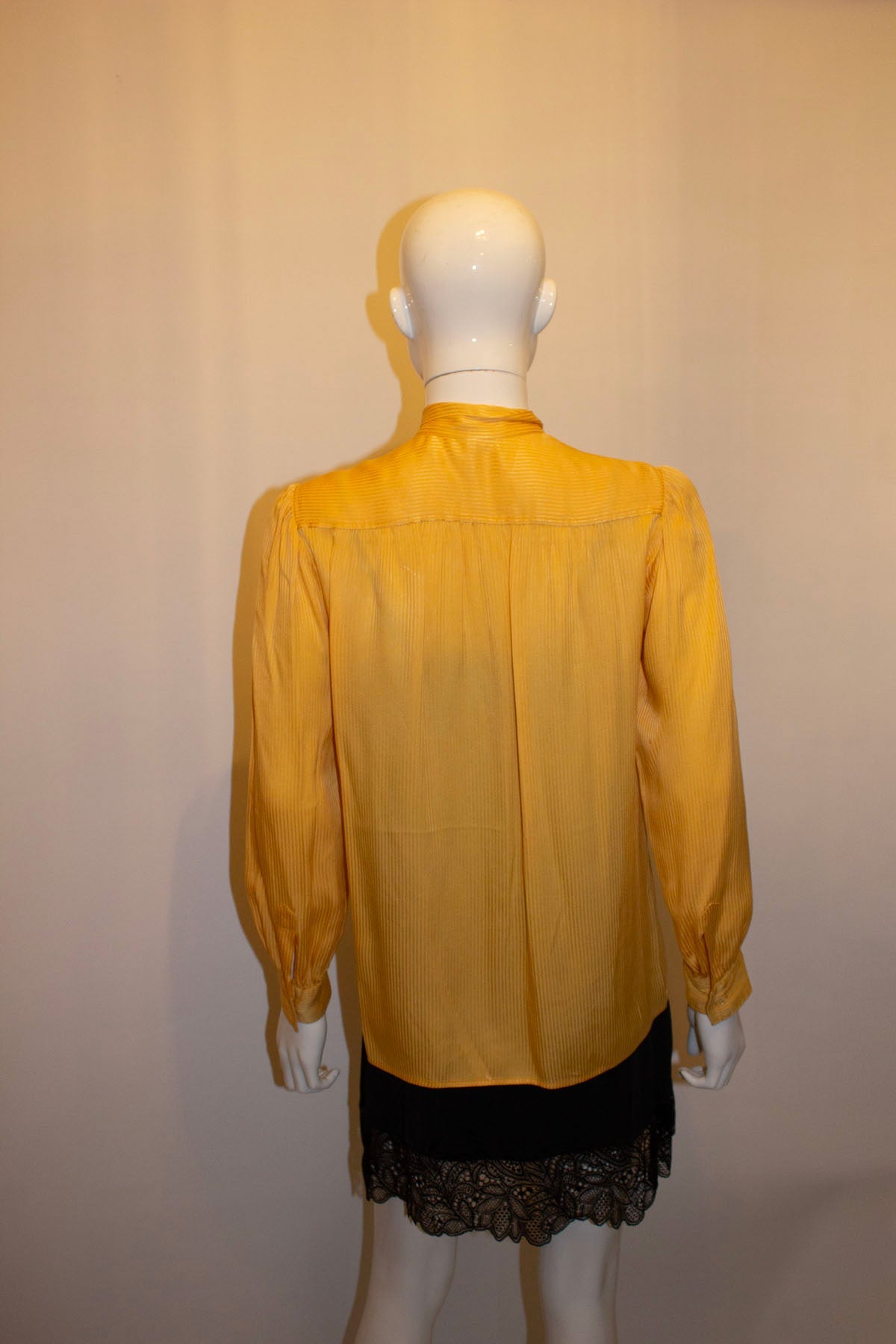 A super vintage silk blouse by Yves Saint Laurent Rive Gauche . In a sunny yellow colour, the blouse has a single button fastening at the neck , a pussy bow tie , single button cuffs  and gathering at the yoke front and back.