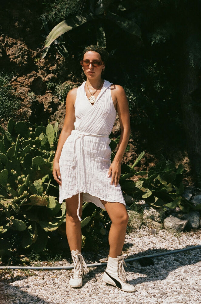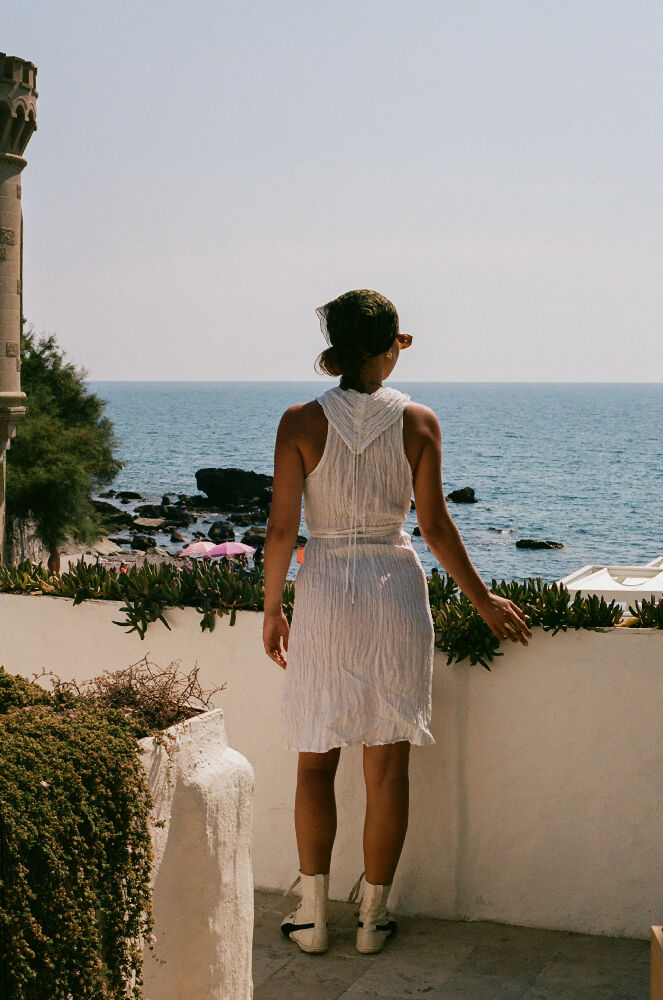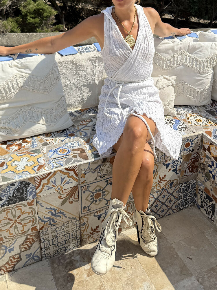 Effortlessly elegant, this vintage Italian wrap dress is crafted from 100% natural linen for a breezy, breathable feel. The soft crinkle texture and adjustable waist tie create a flattering, feminine silhouette, while the distinctive mermaid-style hood drapes beautifully down the back—adding a touch of whimsical charm and coastal allure. Perfect for sun-soaked days by the sea or relaxed summer evenings, this timeless piece embodies understated Mediterranean chic.
