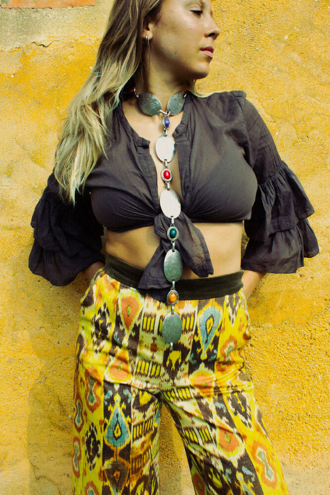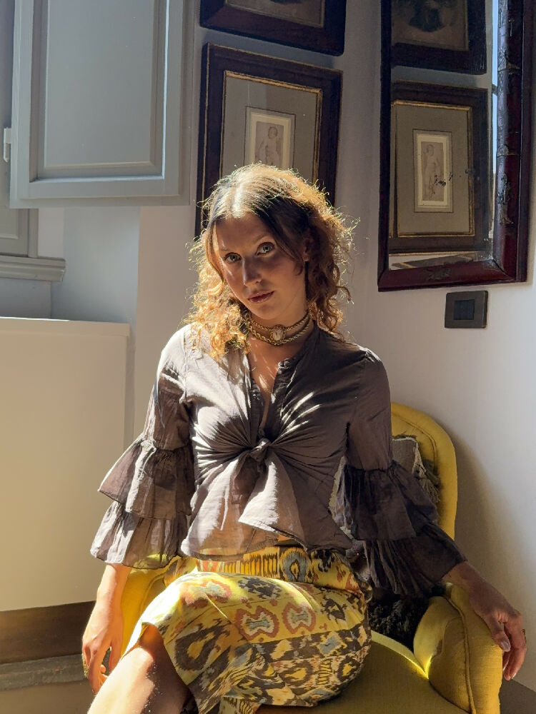 Vintage find from Florence, made from 100% cotton with flared sleeves and a versatile tie-front you can style in multiple ways. Soft, breathable, and easy to wear. Seen here on a size 8.