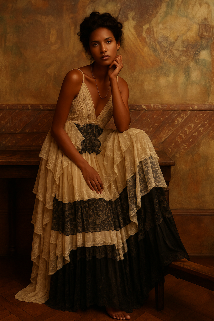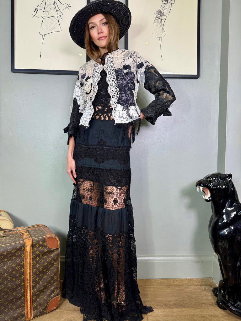 Hermione, reworked antique Rhajastani embroidered top and Victorian embroidered lace coat