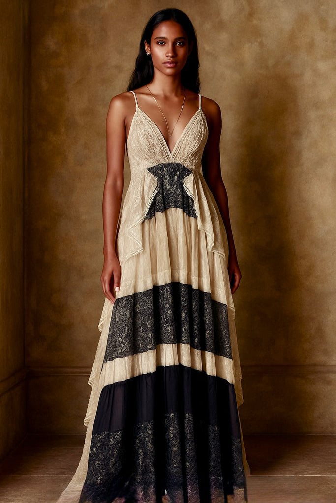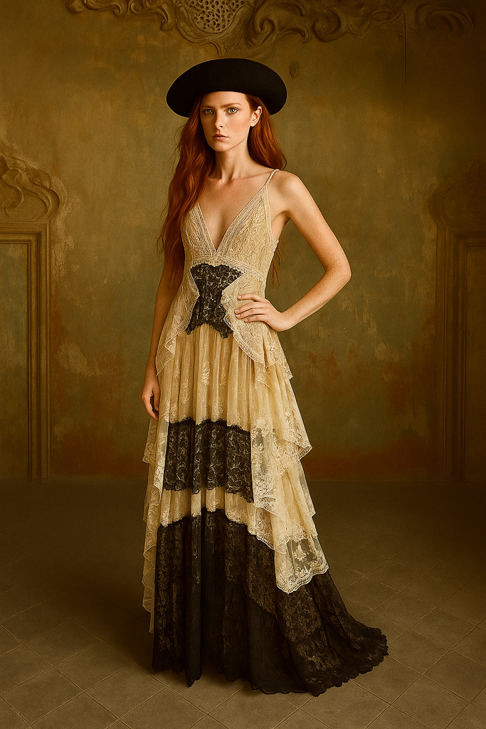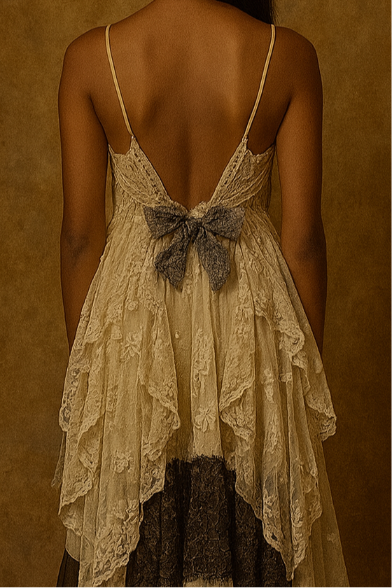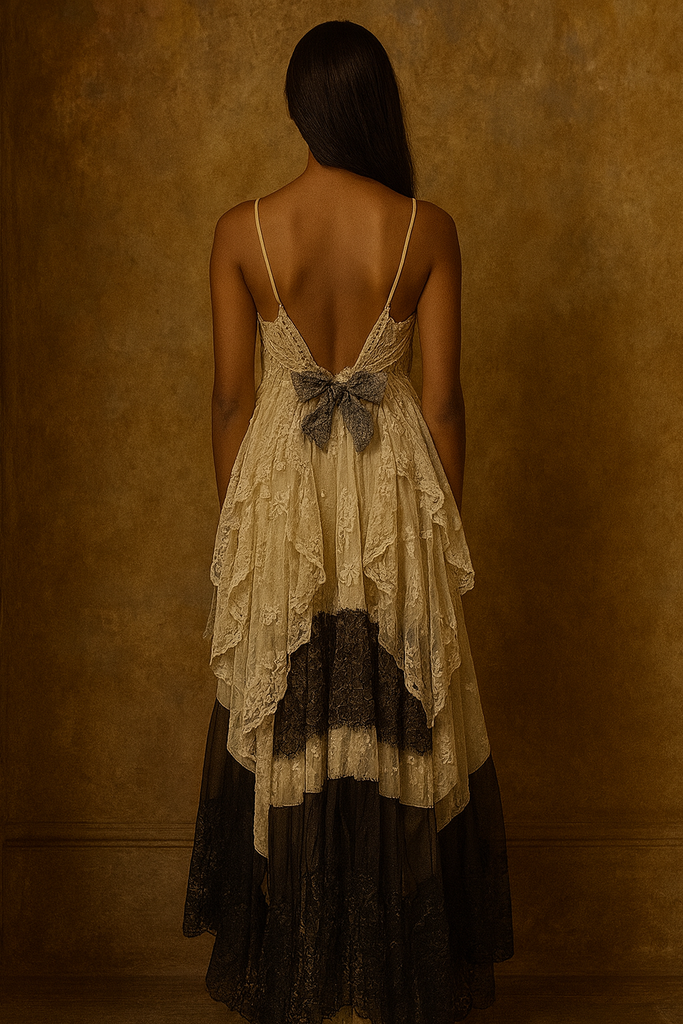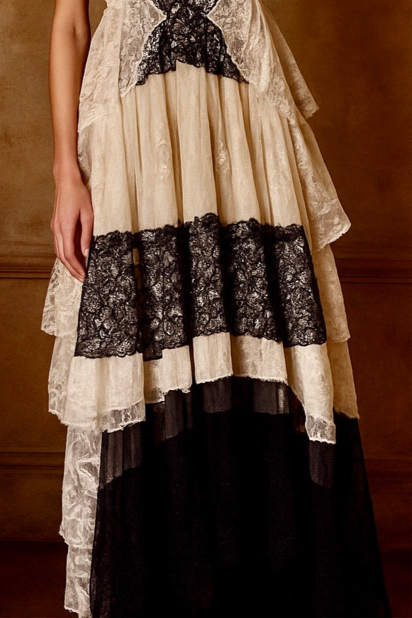 Indulge in antique handmade lace with this one of a kind dress, a reworked masterpiece of sumptuous antique cream chiffon and black lace. Featuring a V-neckline, delicate lace straps and handmade pink and blue micro florals on the bust with asymmetric tiers of chiffon hemmed in lace, this dress makes the perfect modern bridal gown and looks fabulous paired with sandals or high heels. With a back lace tie and an elasticated back , it comfortably flatters sizes UK8 to 12.