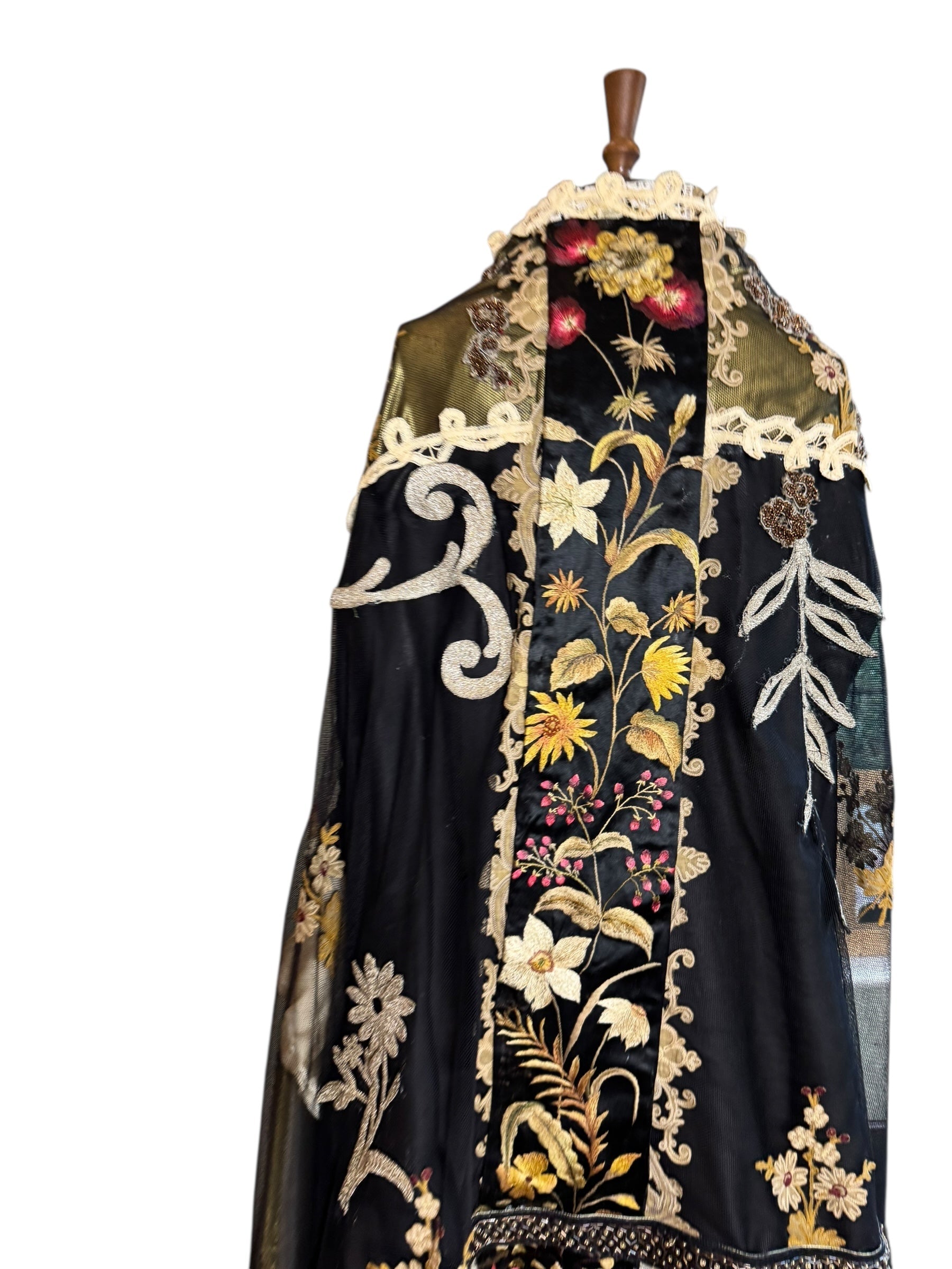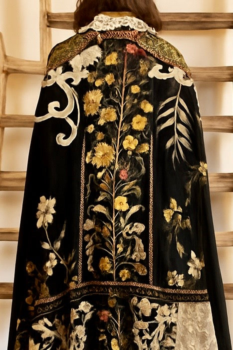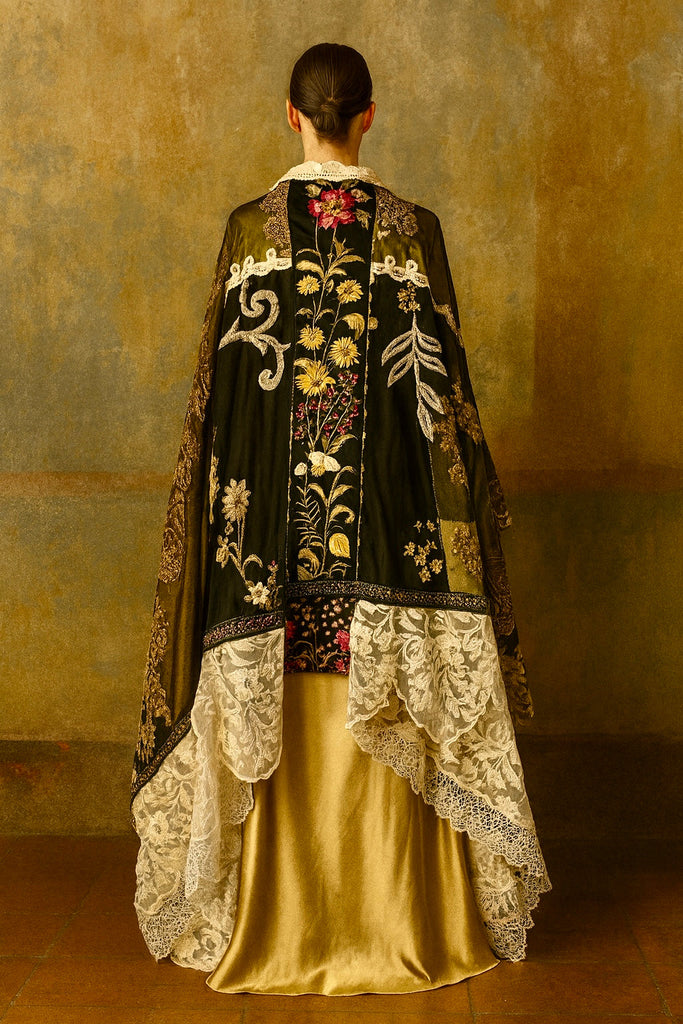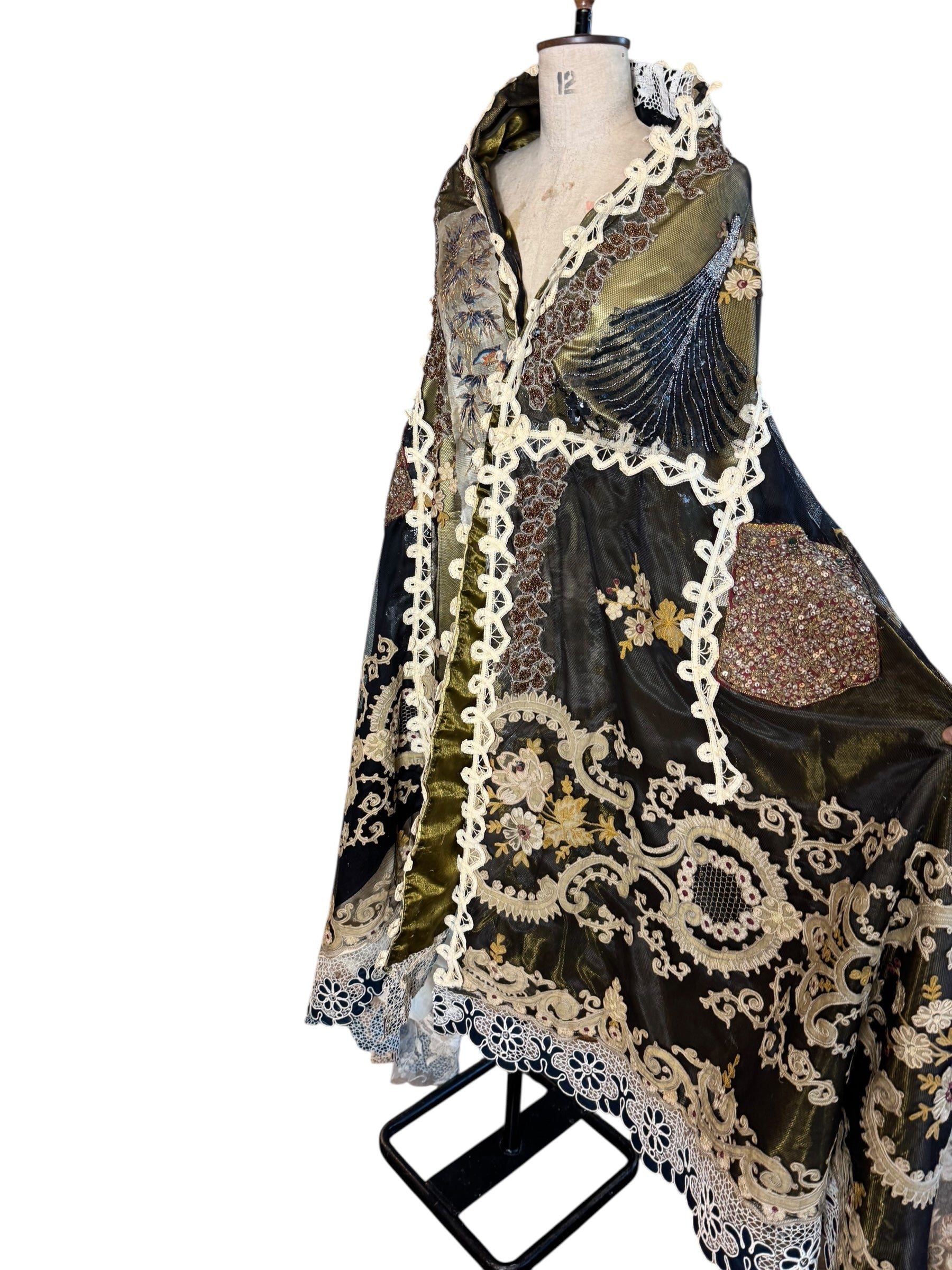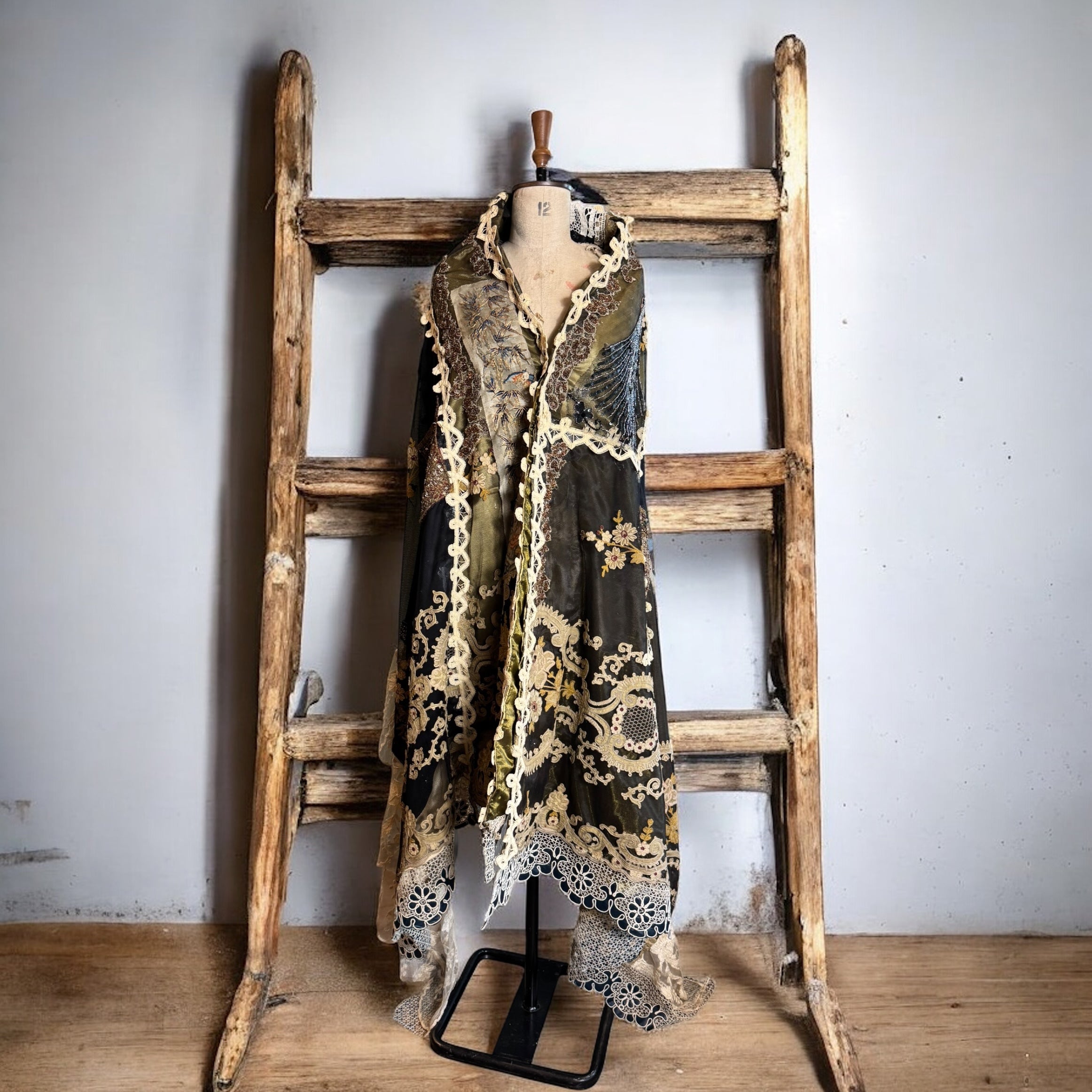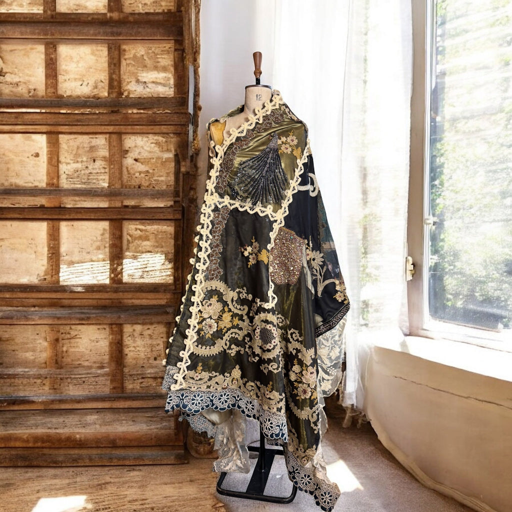 Experience the timeless elegance of our reworked one-of-a-kind antique French patchwork cape. Crafted from rare floral cotton tape work and beaded fragments, this cloak is a true treasure.