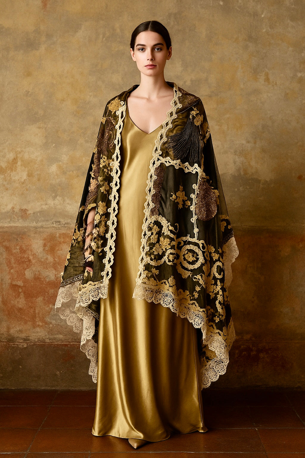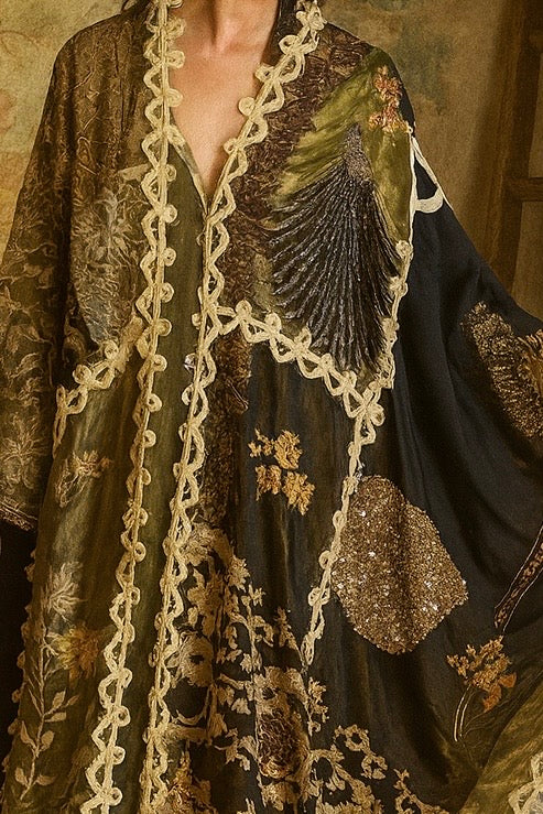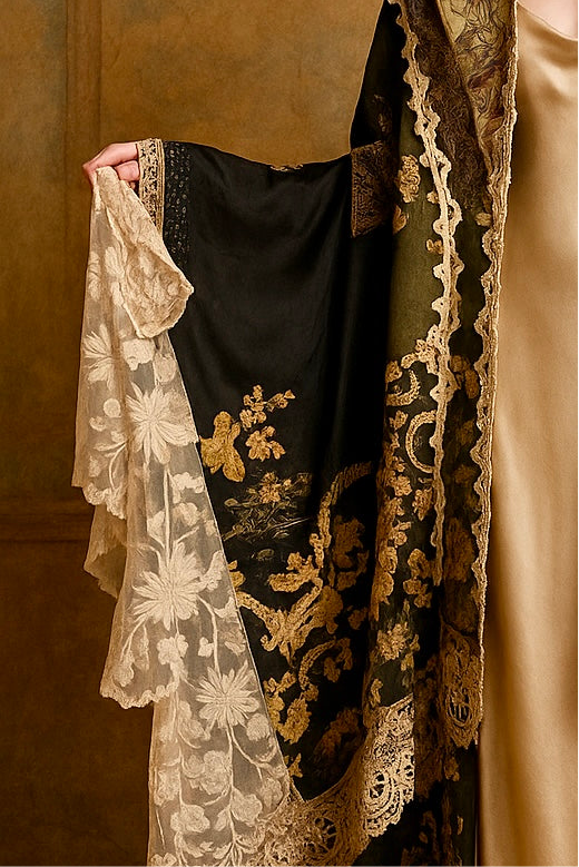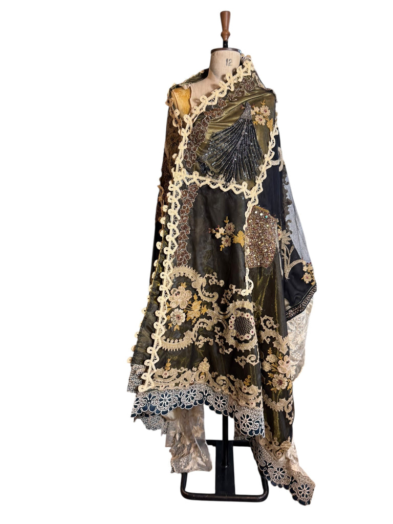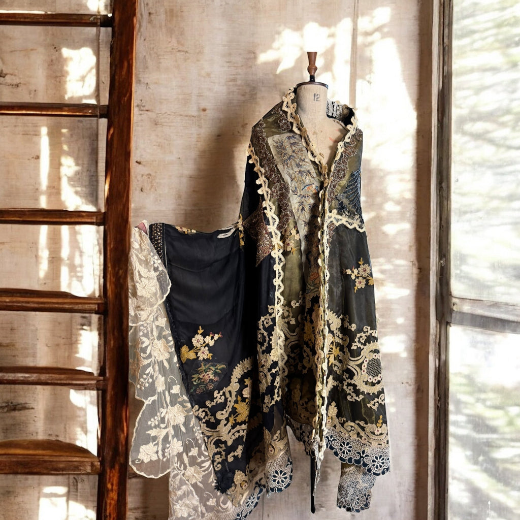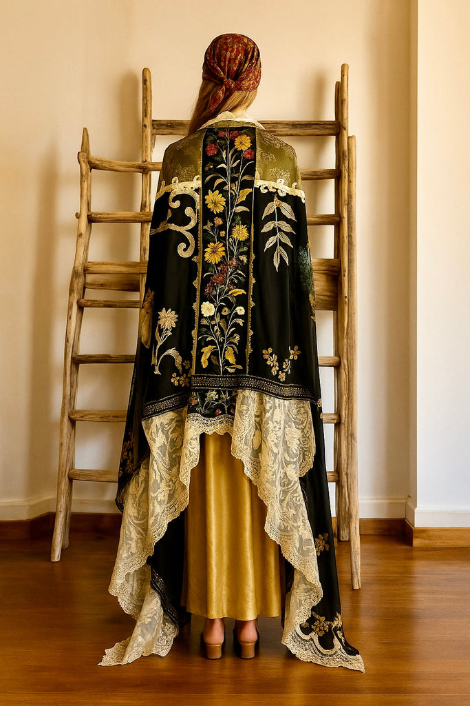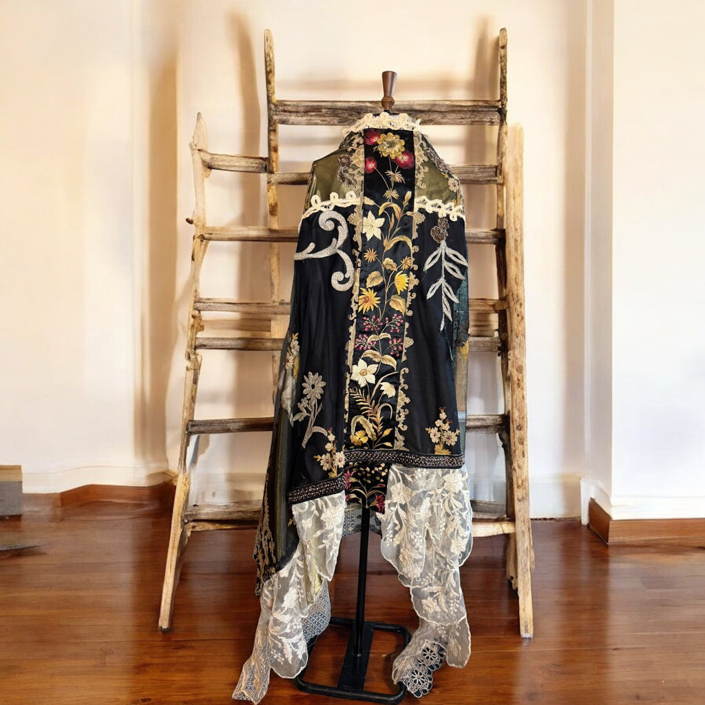 Experience the timeless elegance of our reworked one-of-a-kind antique French patchwork cape. Crafted from rare floral cotton tape work and beaded fragments, this cloak is a true treasure.