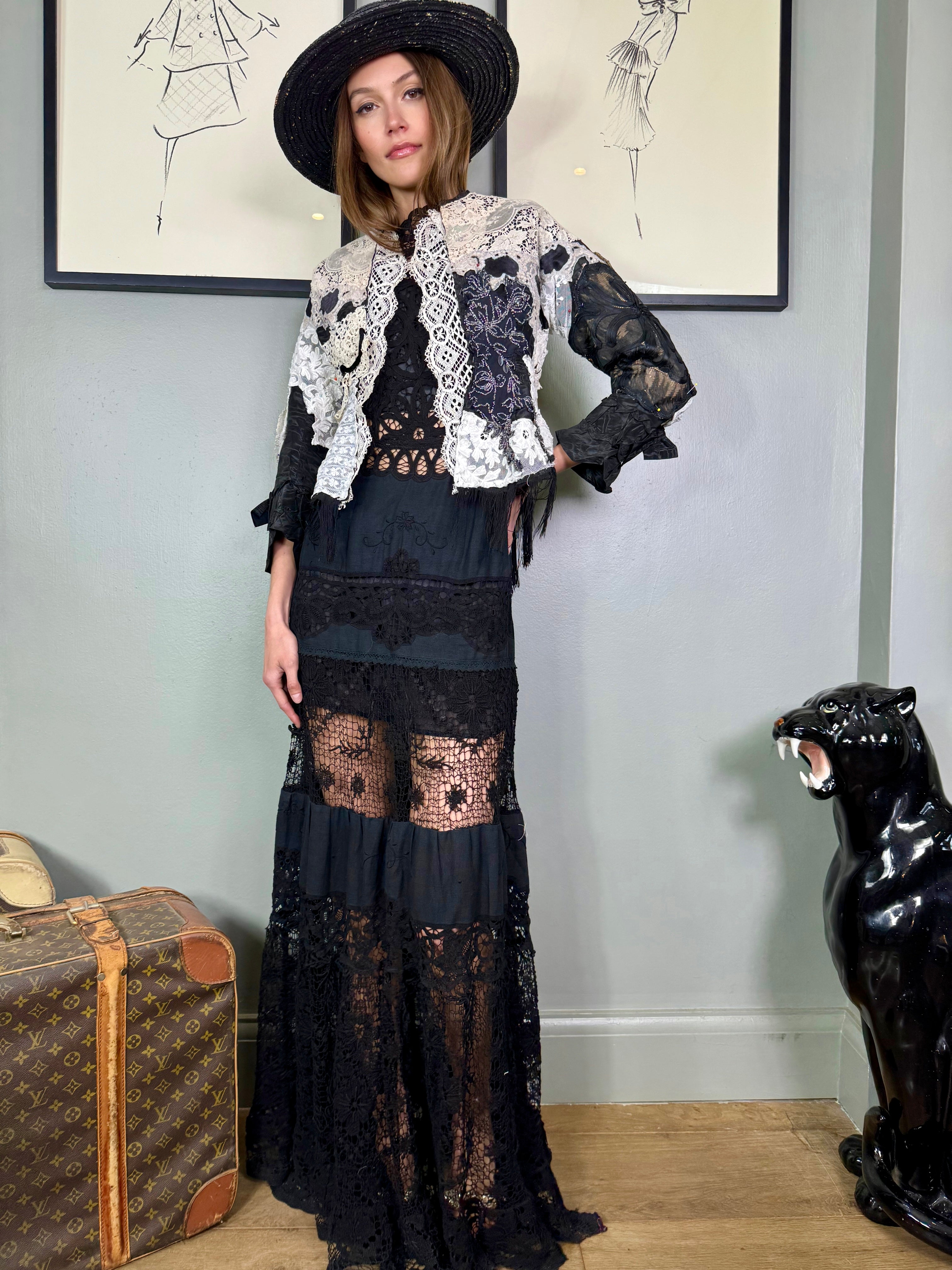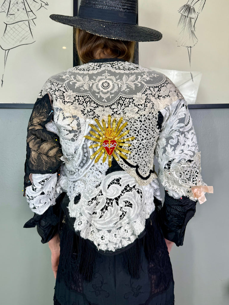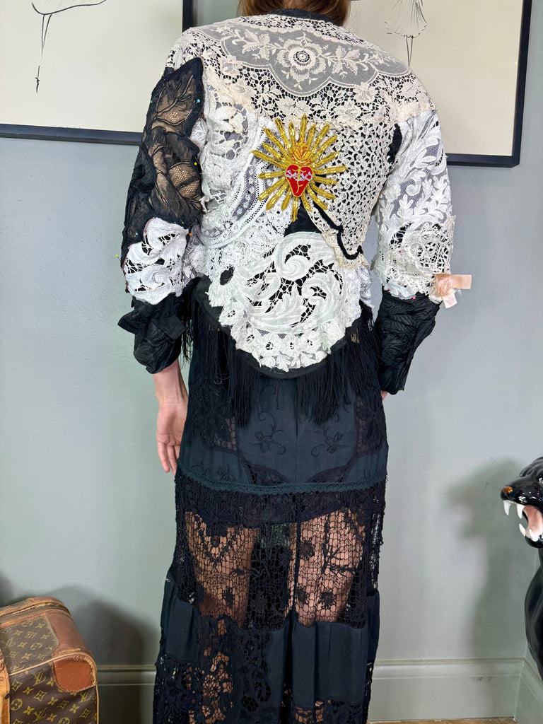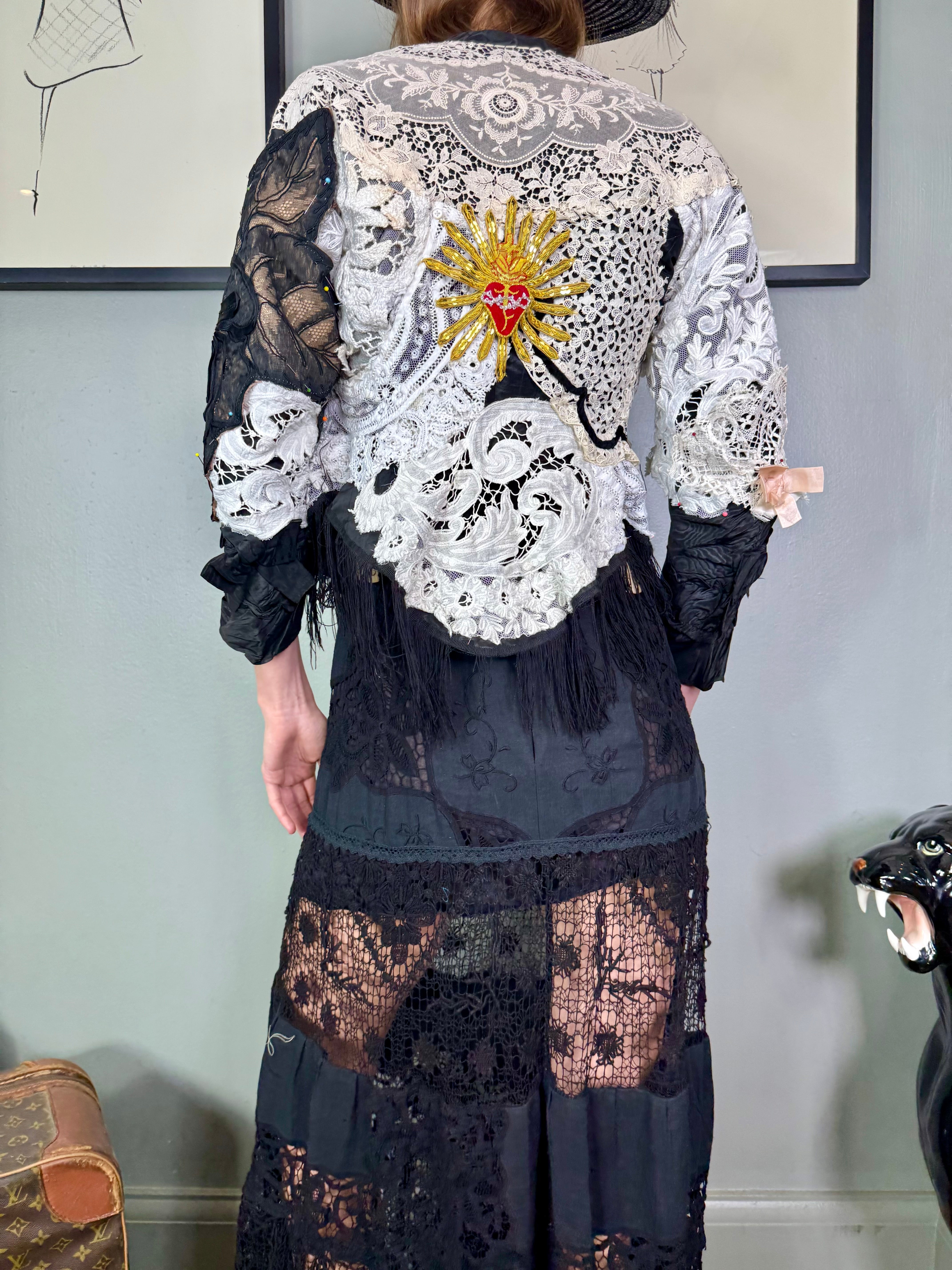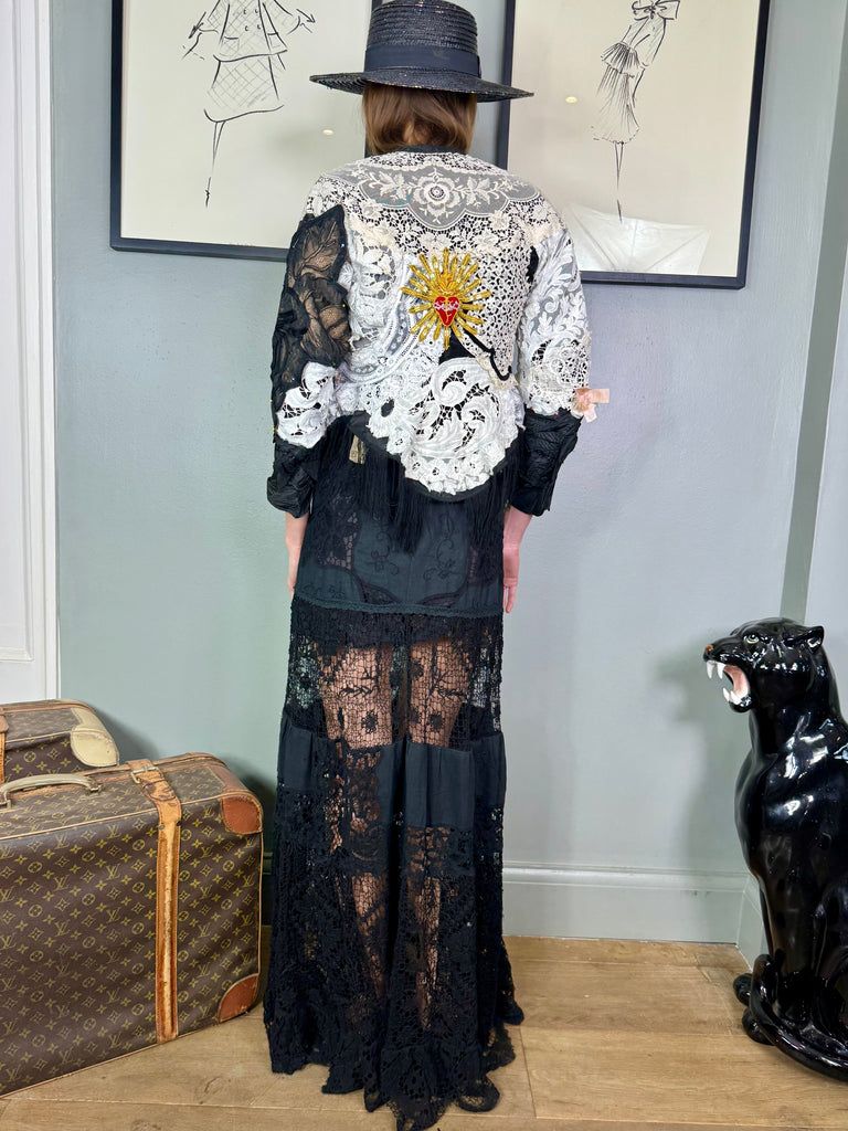 A true one of a kind Victorian silk fringed jacket adorned with antique lace fragments and 20s beading. A gold papal heart embroidered motif is woven on the back lace panel. Has a round neckline with no lapel, curved sleeves and a very cinched in waist, has a slight kick and is finished with black fringing. Has its original boning. No fastening.