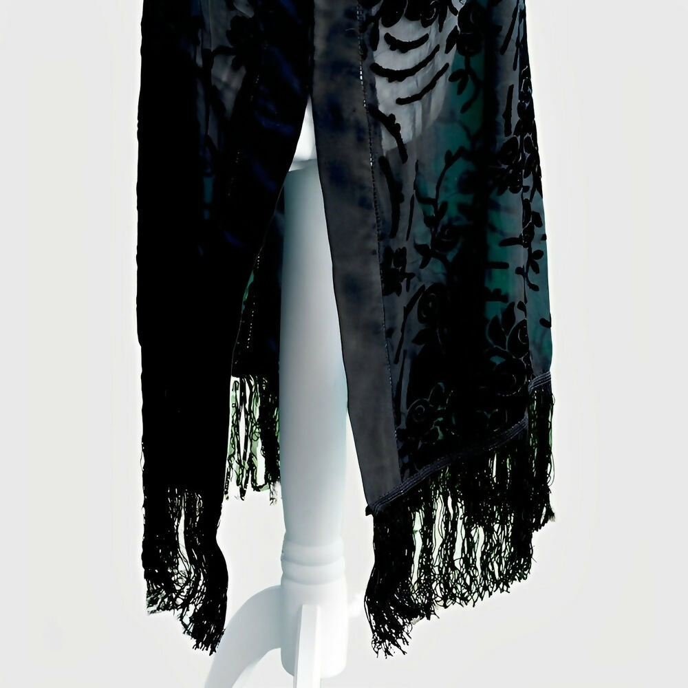 This lovely black devoré flapper dress is circa 1920s. A rare find.