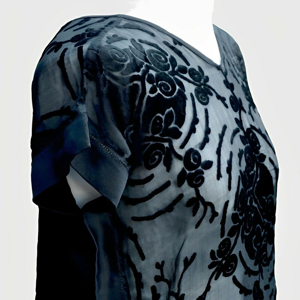 BLACK DEVORÉ SILK SIDE SLIT FLAPPER DRESS FLOWER PRINT