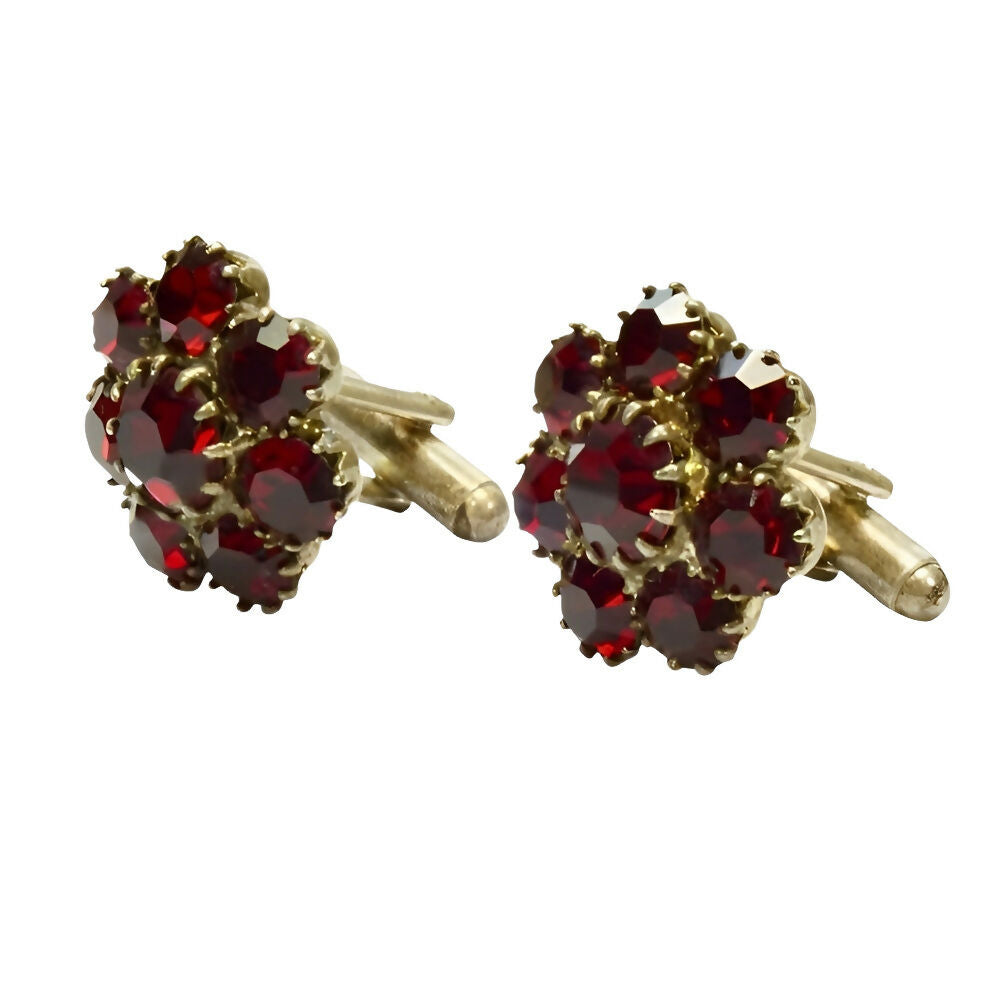 Lovely gold plated cufflinks, set with faceted ruby red glass rhinestones. The gold plating has wear.
