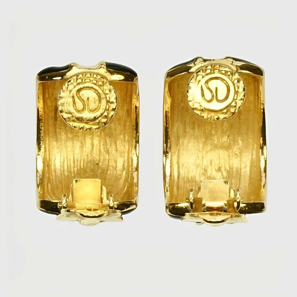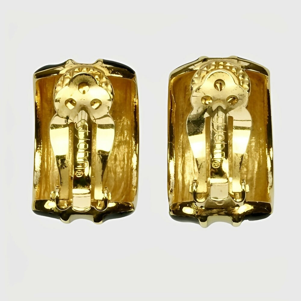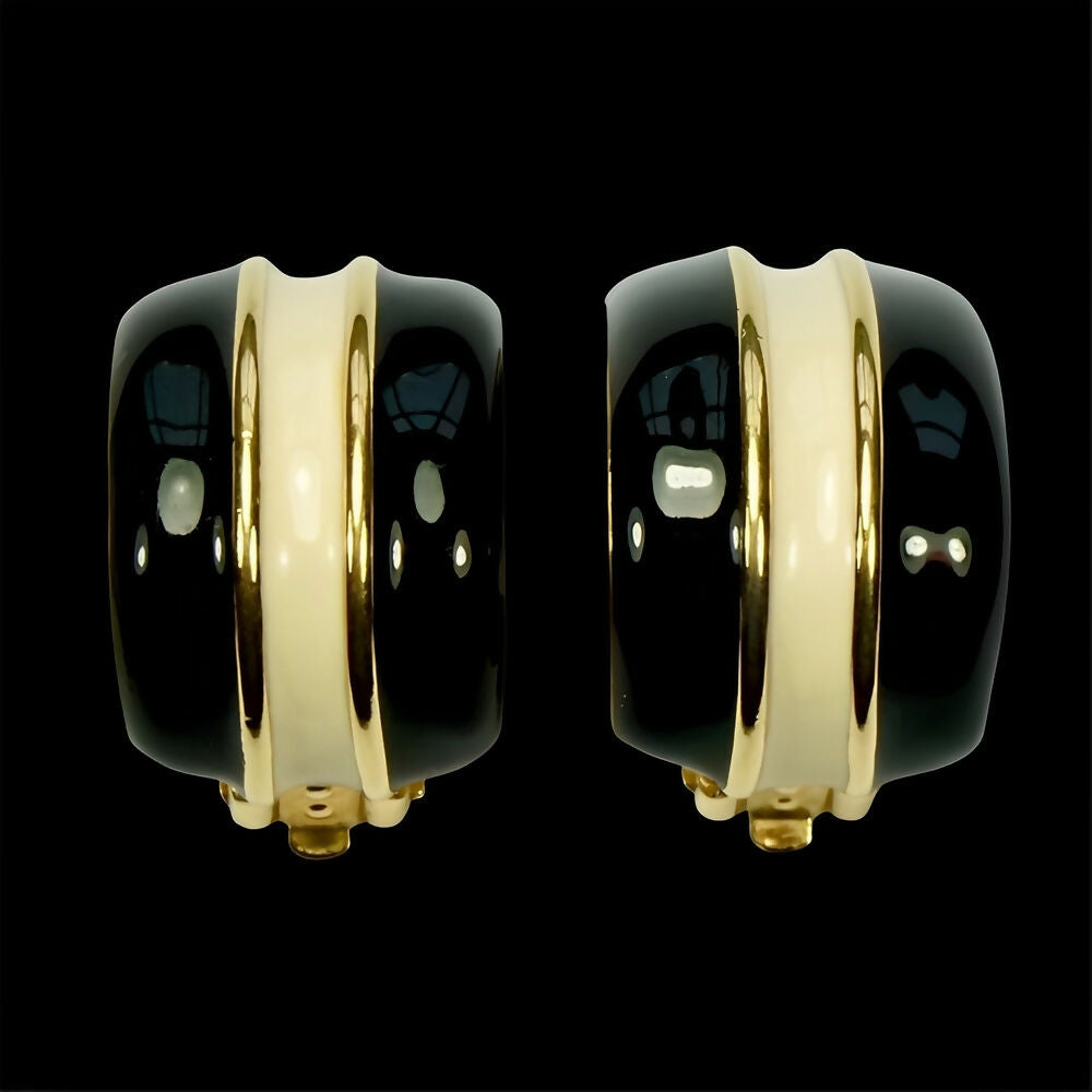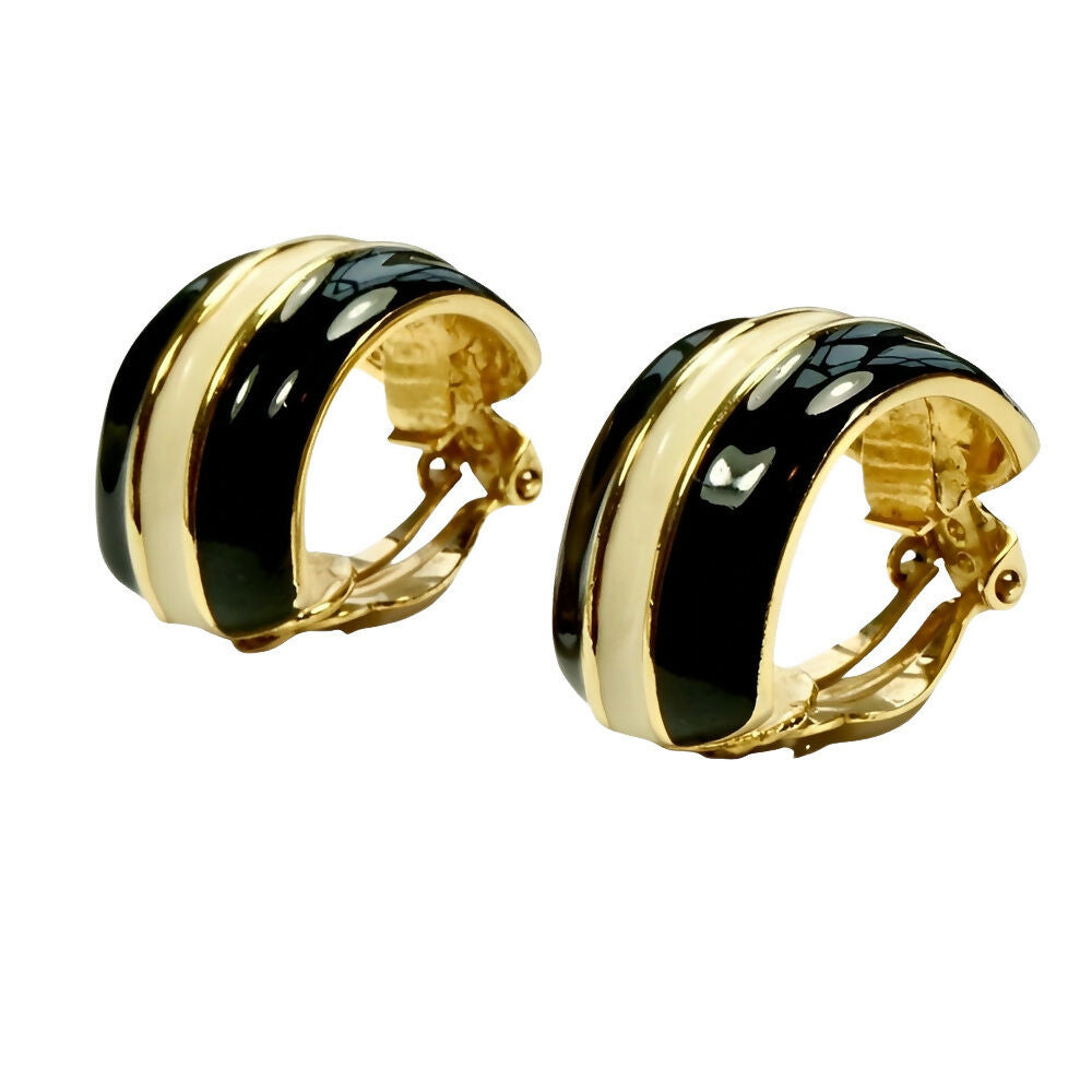 Lovely gold plated half hoop clip on earrings featuring black and cream enamel.