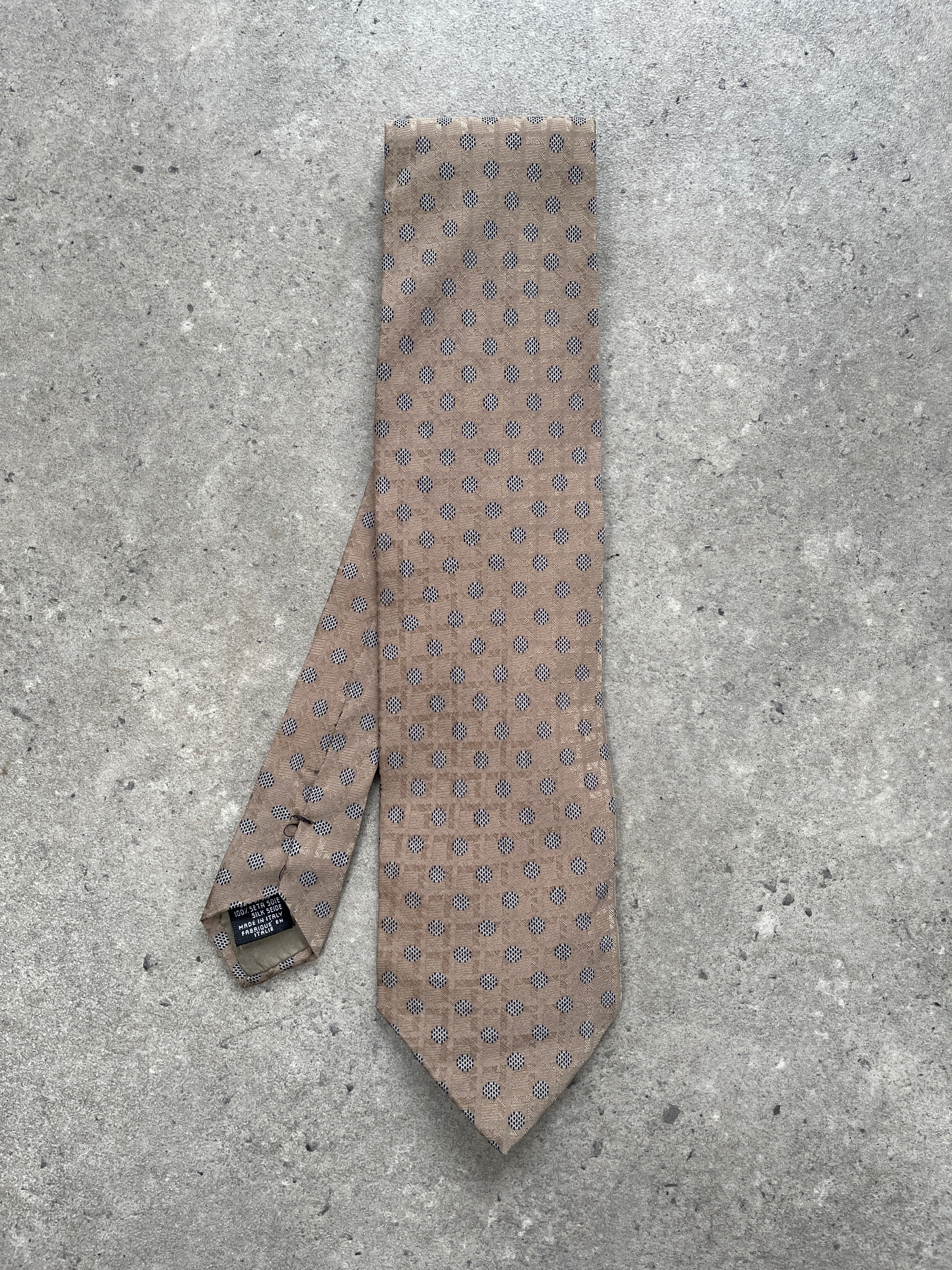 A beige Armani Collezioni tie in pure silk with an all over geometric polkadot and textured jacquard pattern in tonal brown and charcoal. Finished with classic wide blade proportions and a refined, understated sheen typical of early 2000s tailoring.