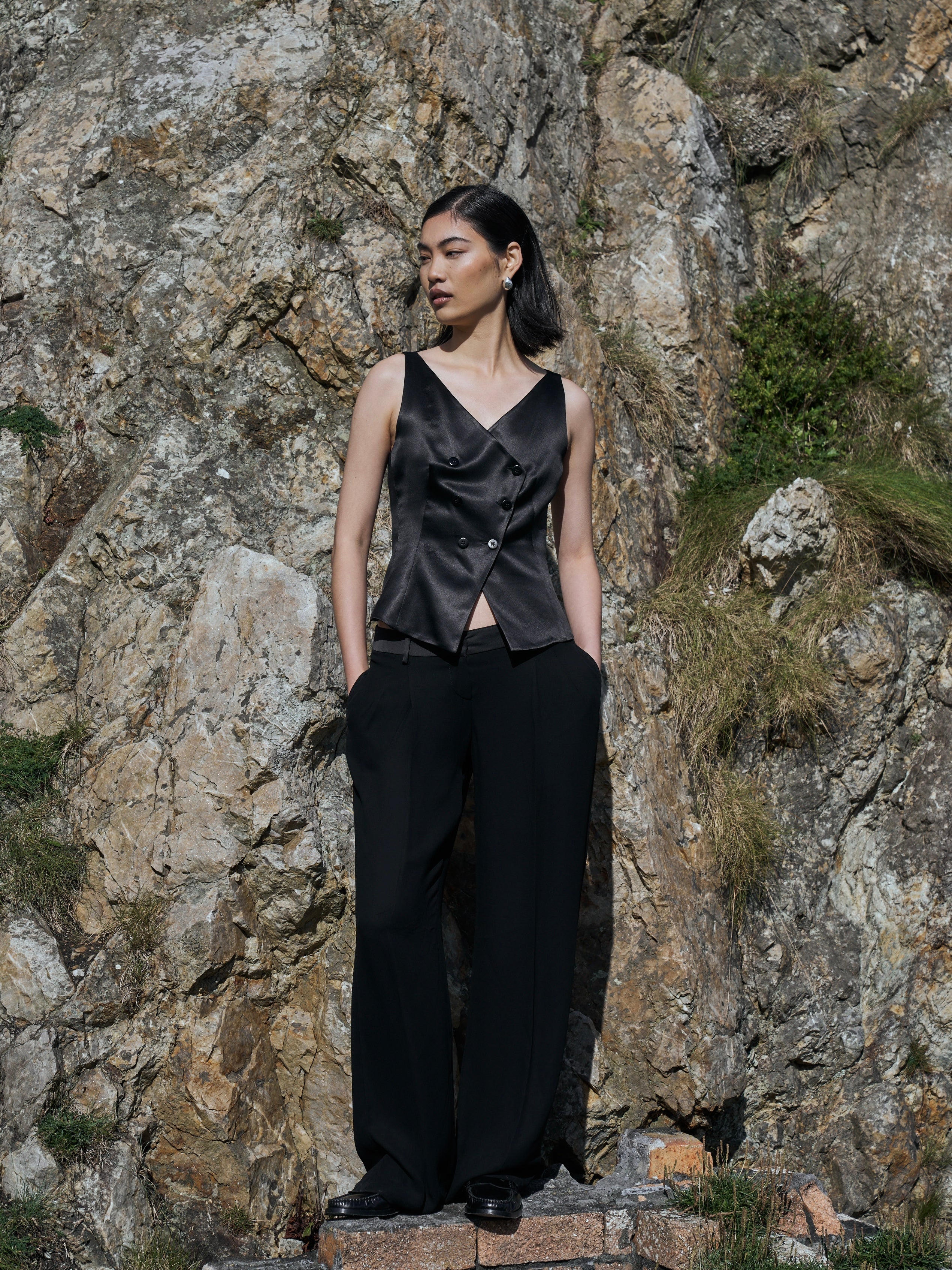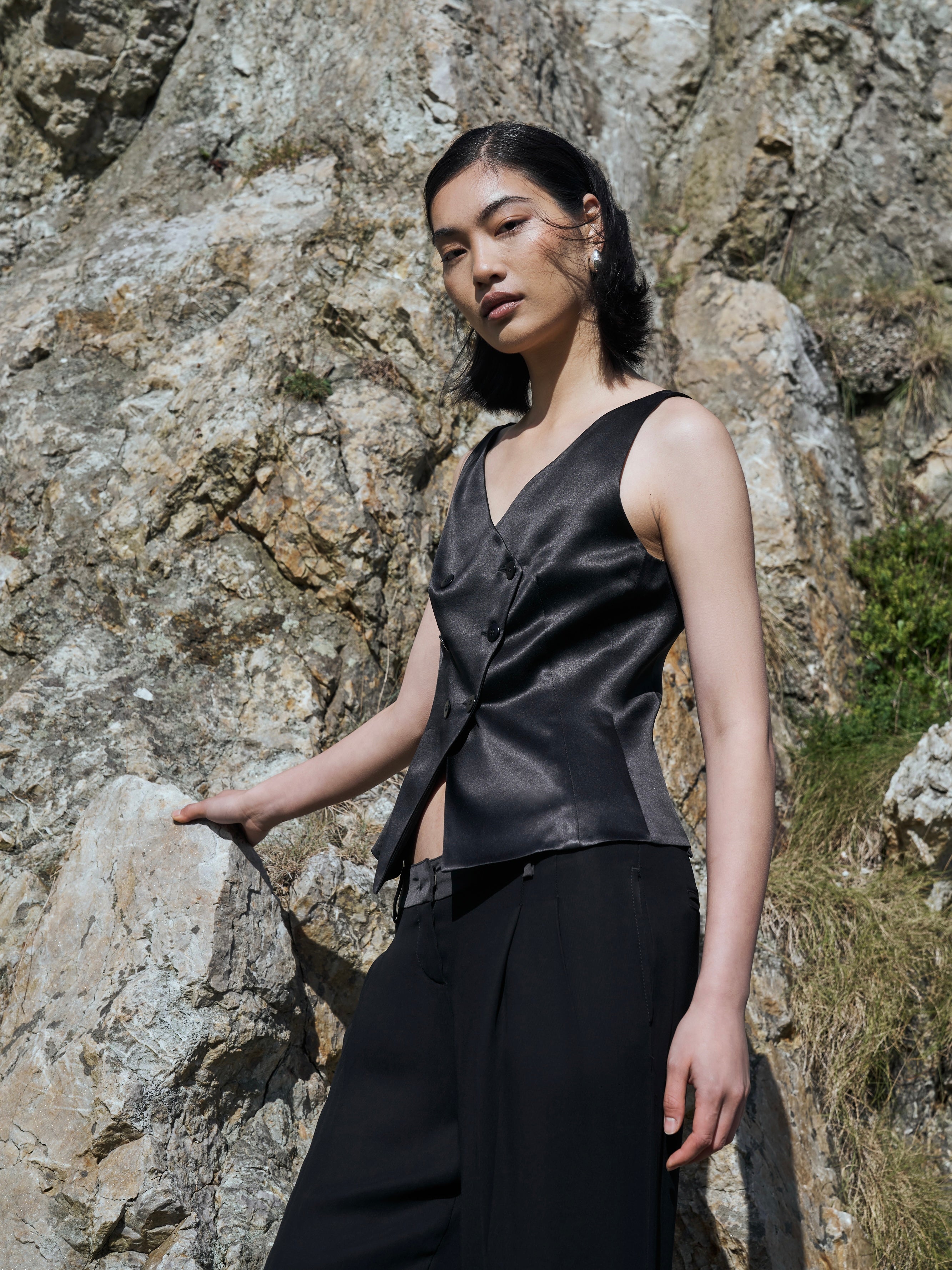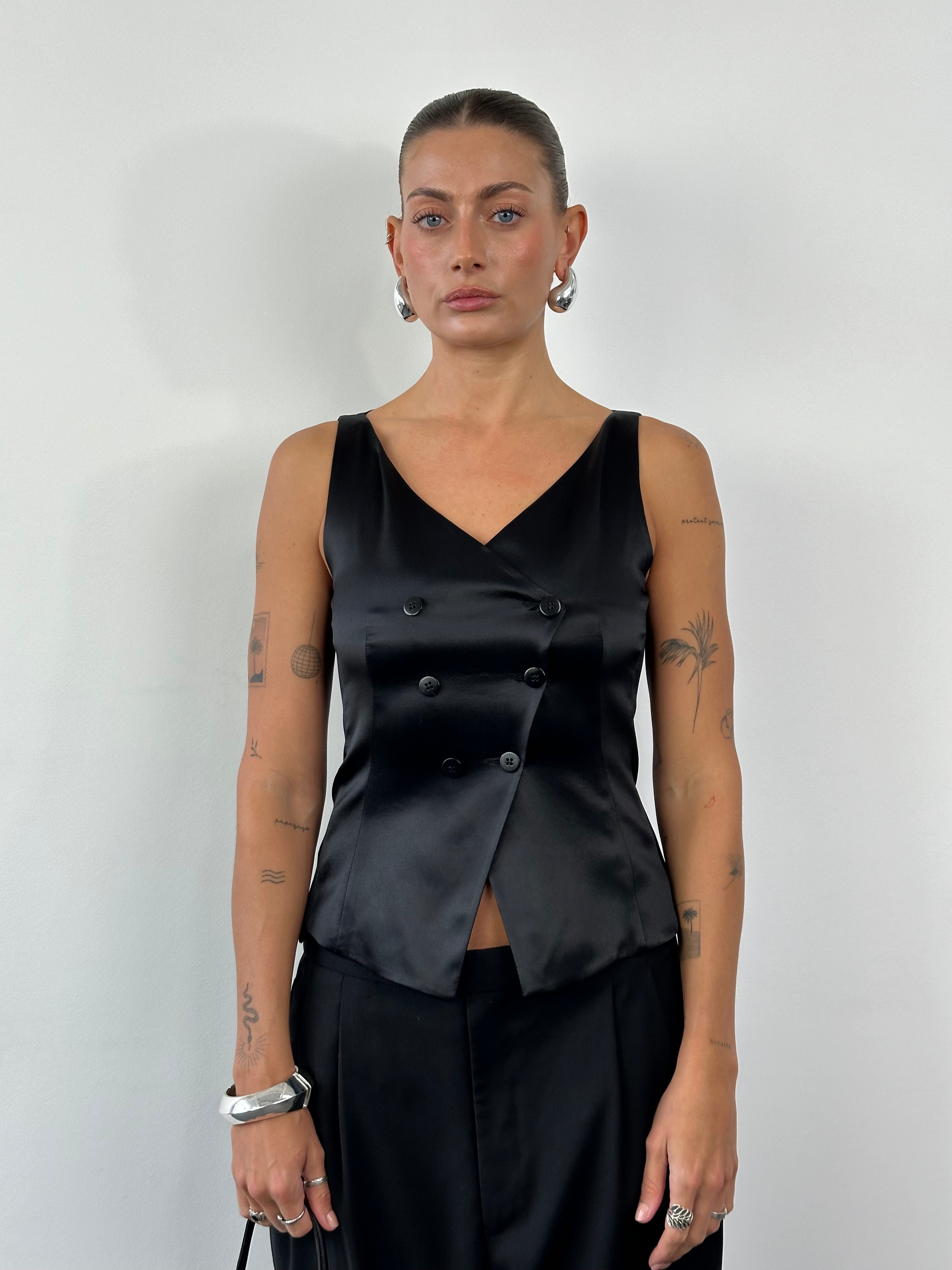 ~ Tailored, sleeveless, v-neckline