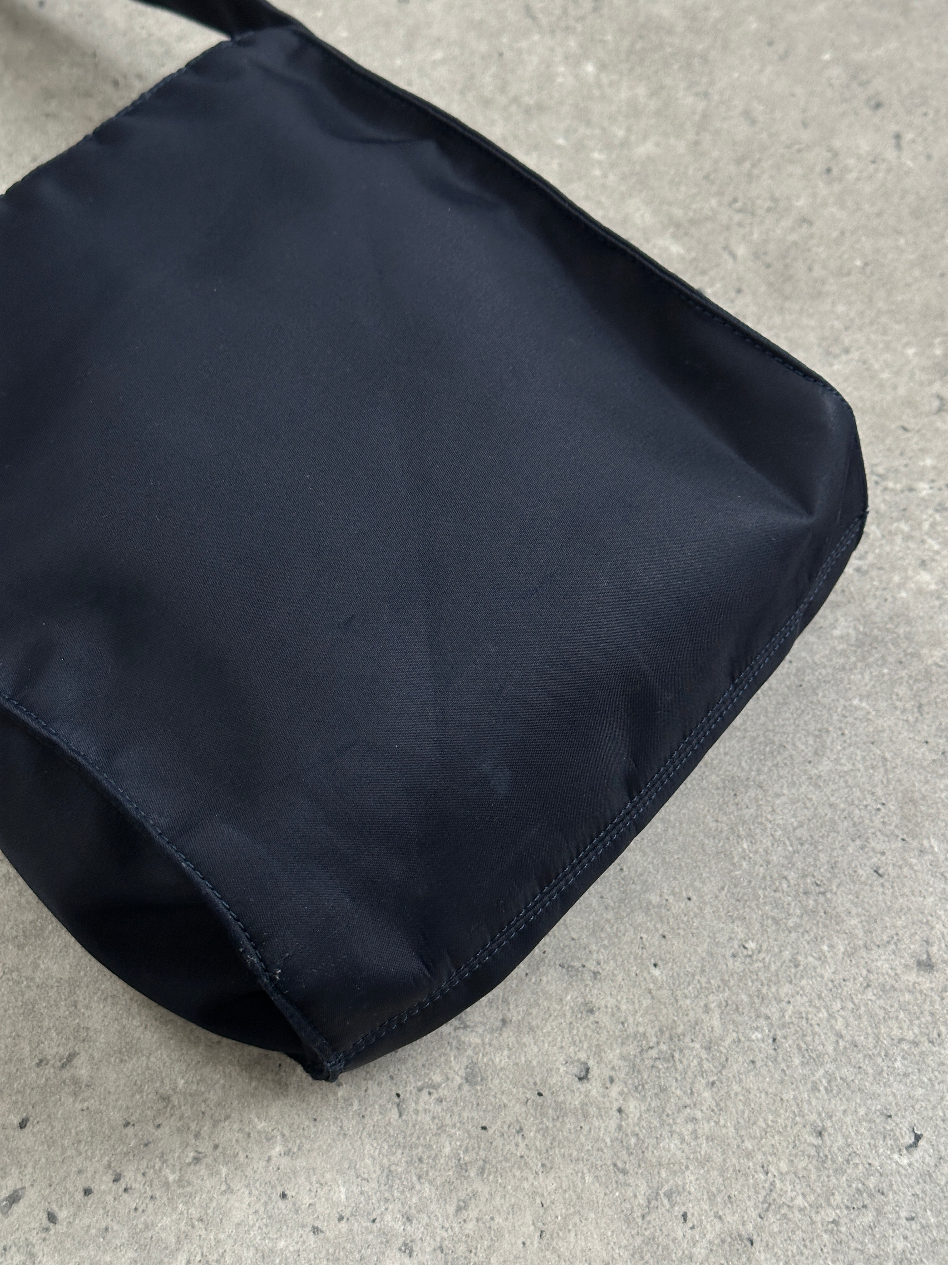 Vintage 2000s navy nylon shoulder bag by Armani Jeans, designed with a compact structured shape and adjustable strap allowing wear on the shoulder or crossbody. Finished with subtle AJ branding and accompanied by the original branded dust bag.
