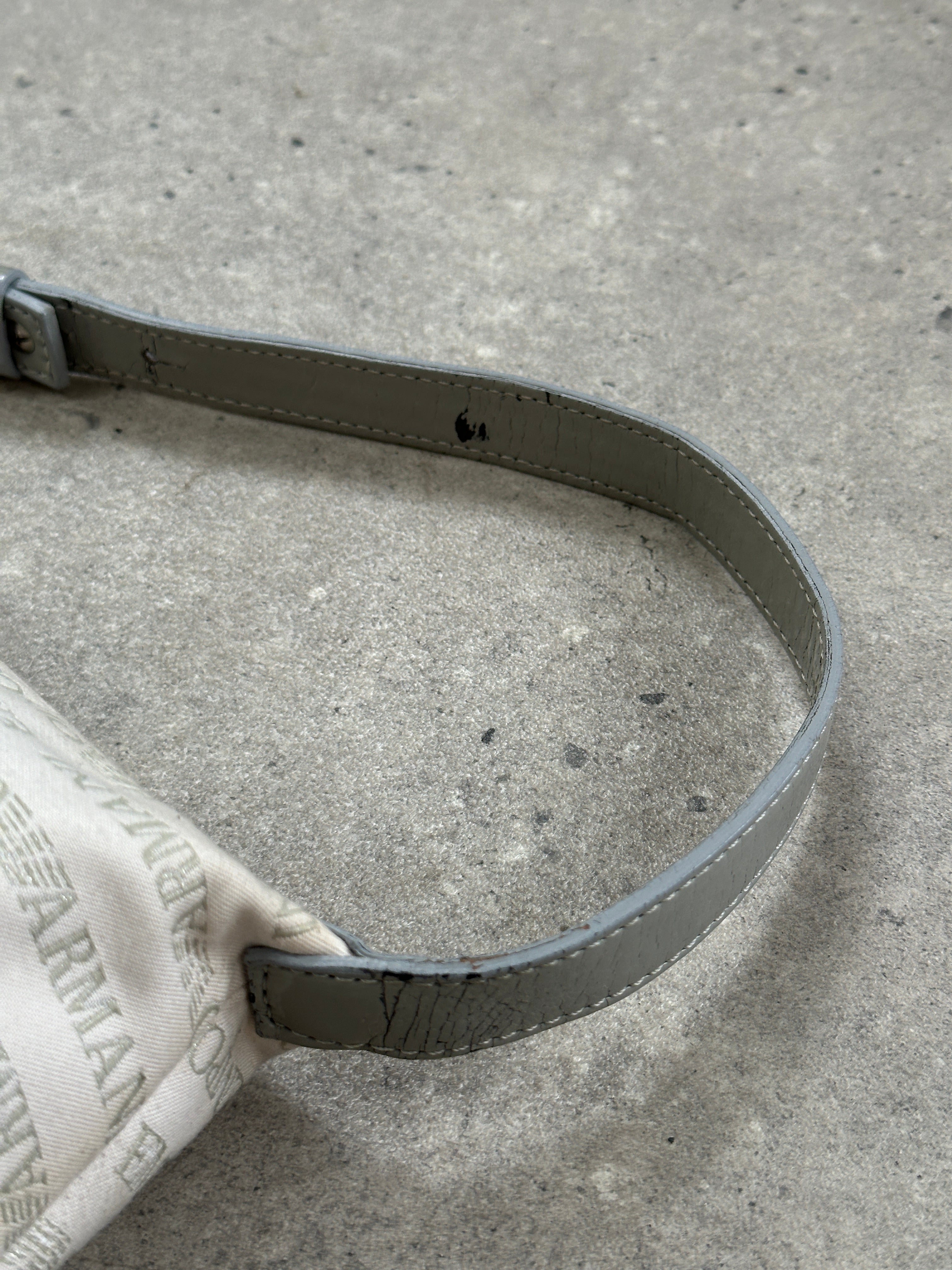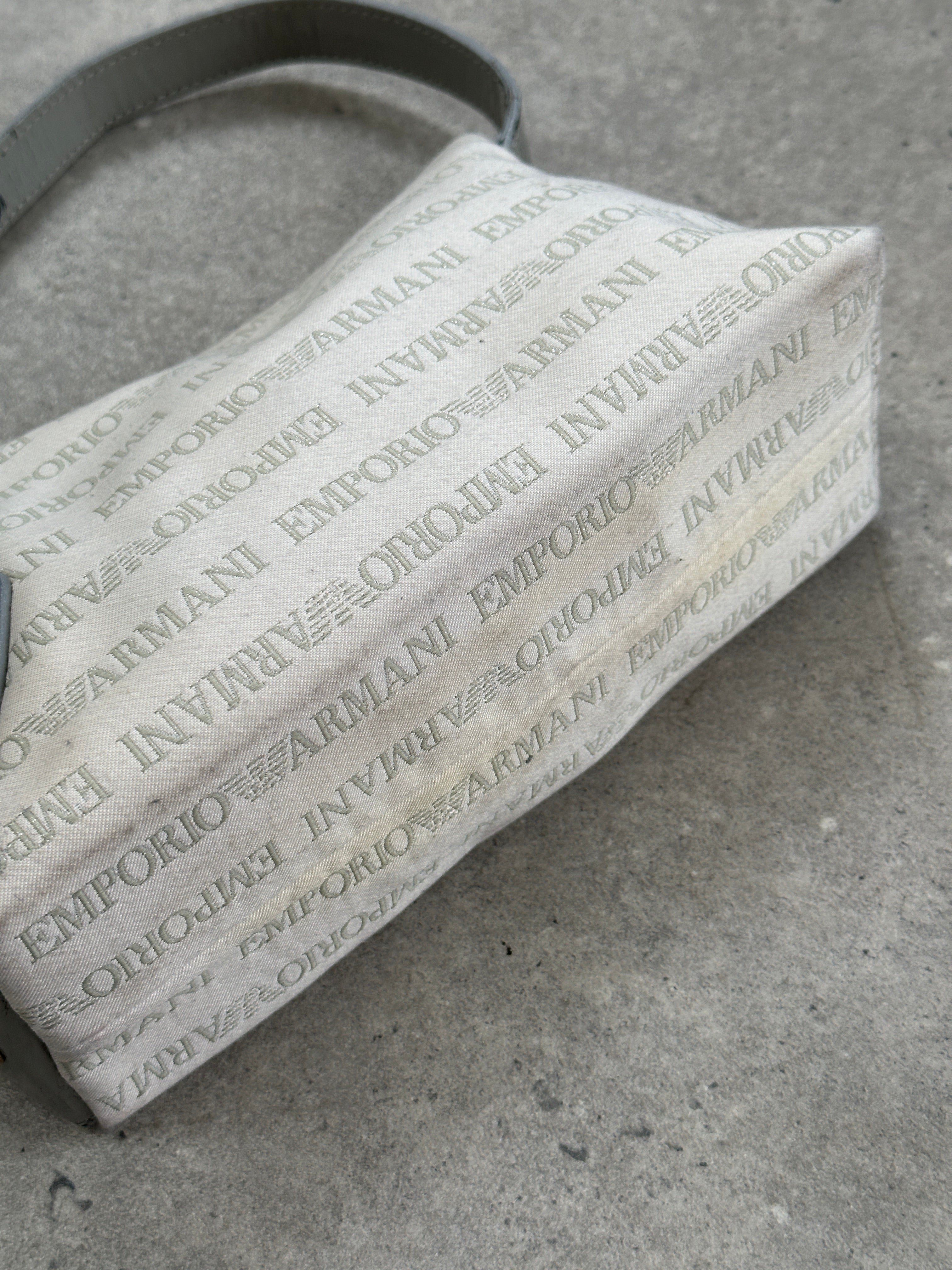 A Y2K-era Emporio Armani baguette bag in monogram logo canvas with grey patent trim — compact, branded, and iconic of early 2000s minimal-luxury styling.