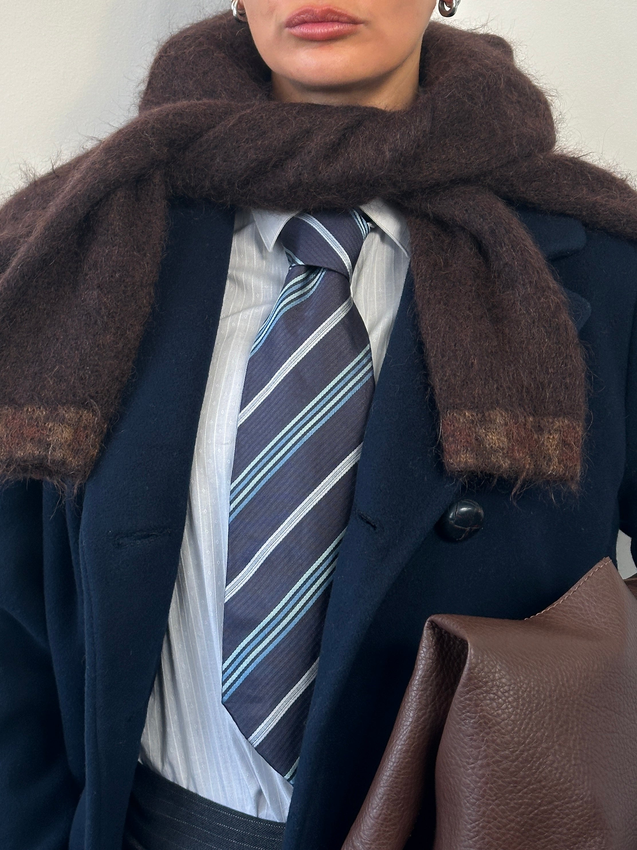 A classic vintage 1990s striped tie by Giorgio Armani, crafted in Italy from pure silk with a refined diagonal stripe pattern in tonal blues and soft neutrals. Offering a timeless accessory that works effortlessly with both tailored and contemporary looks.