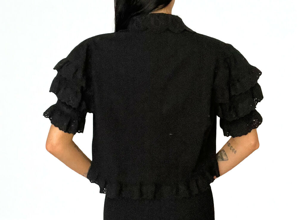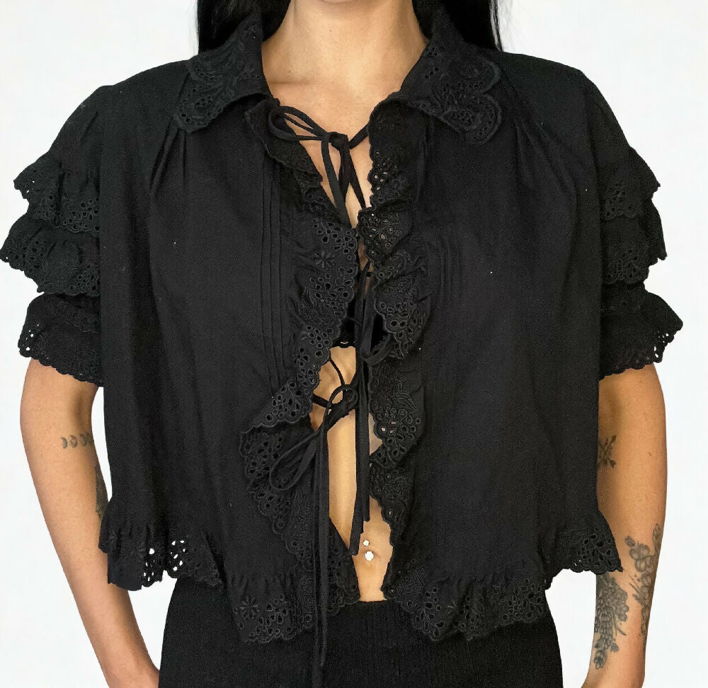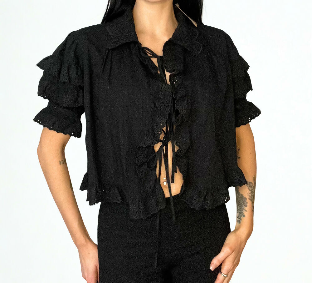 McQ by Alexander McQueen short sleeve black layered top with lace detail. From the Spring/Summer 2007 collection. Features adjustable ties at the front.