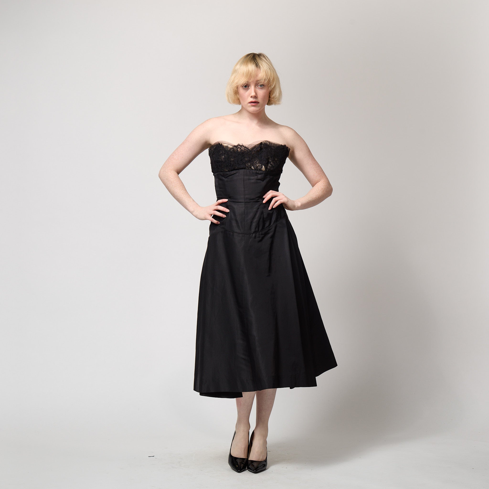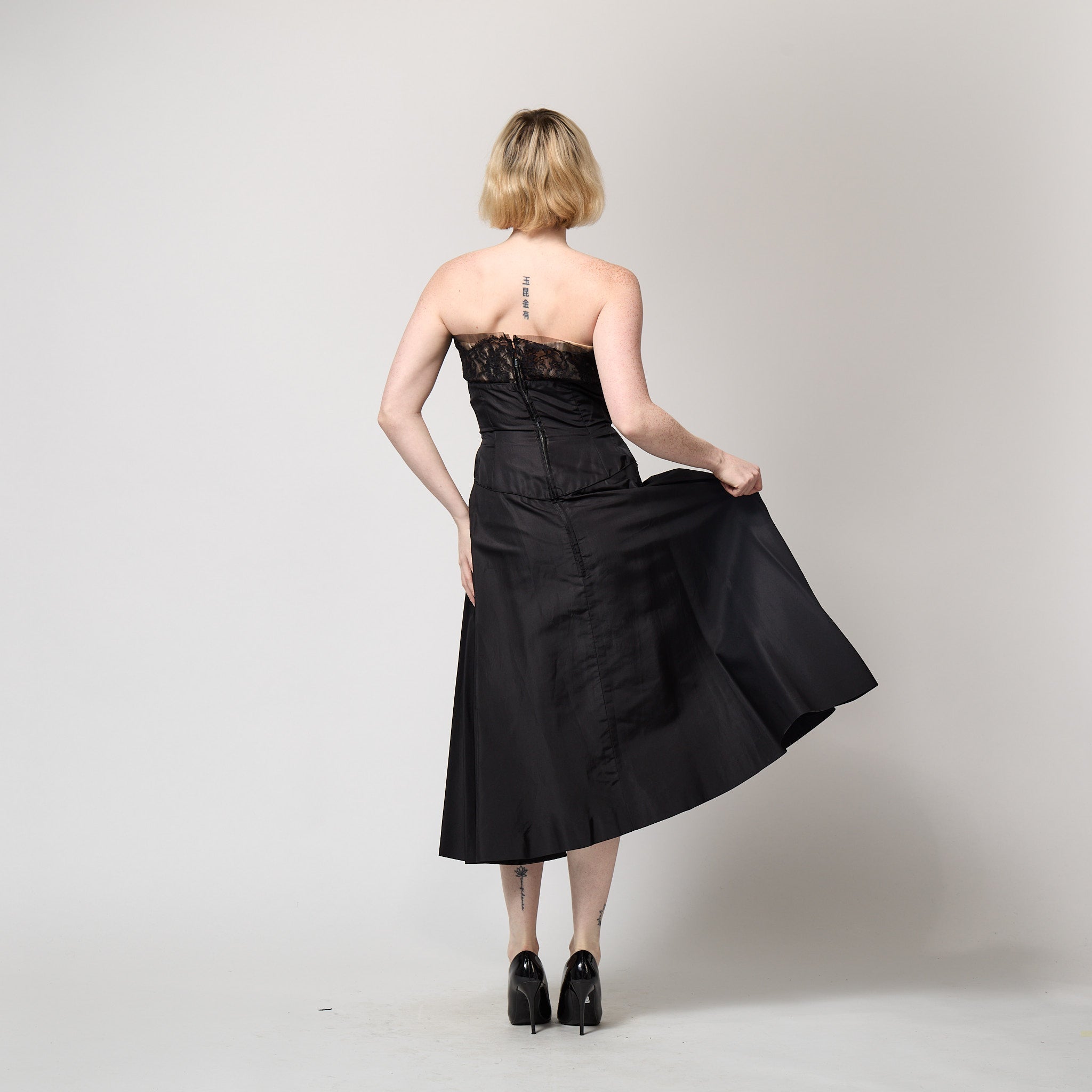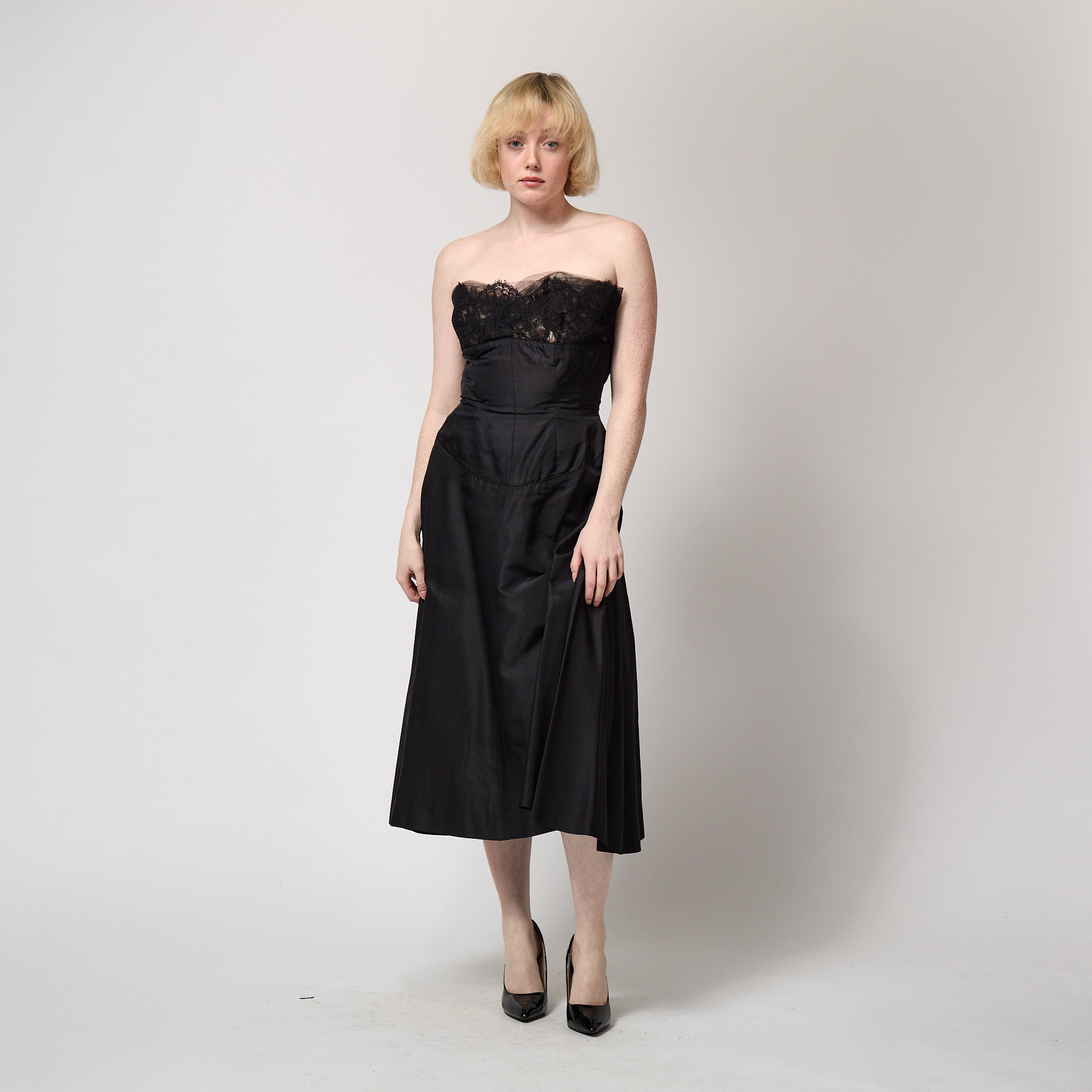 1950s Black Strapless Dress With Sweetheart Neckline and Lace Trim