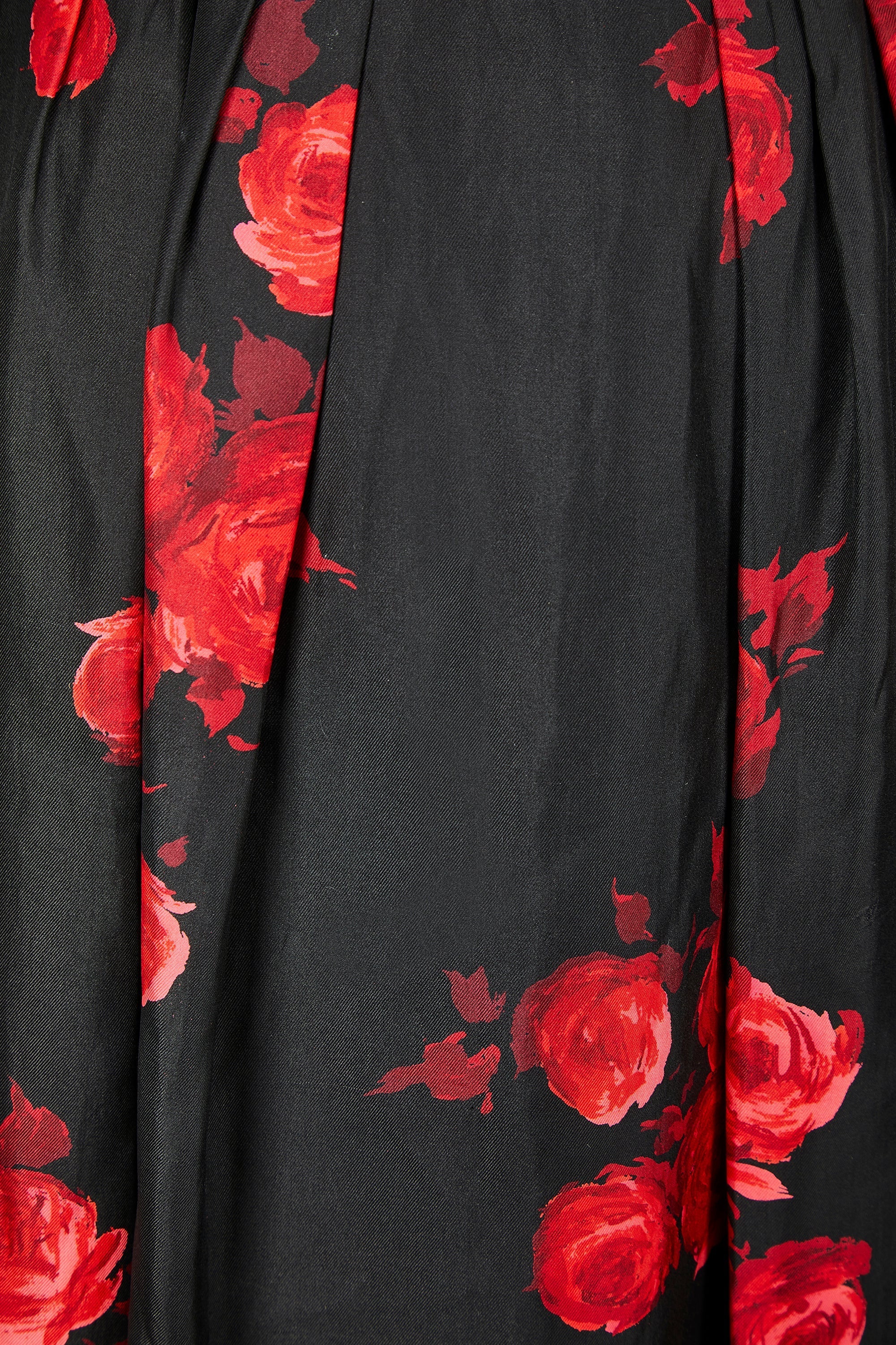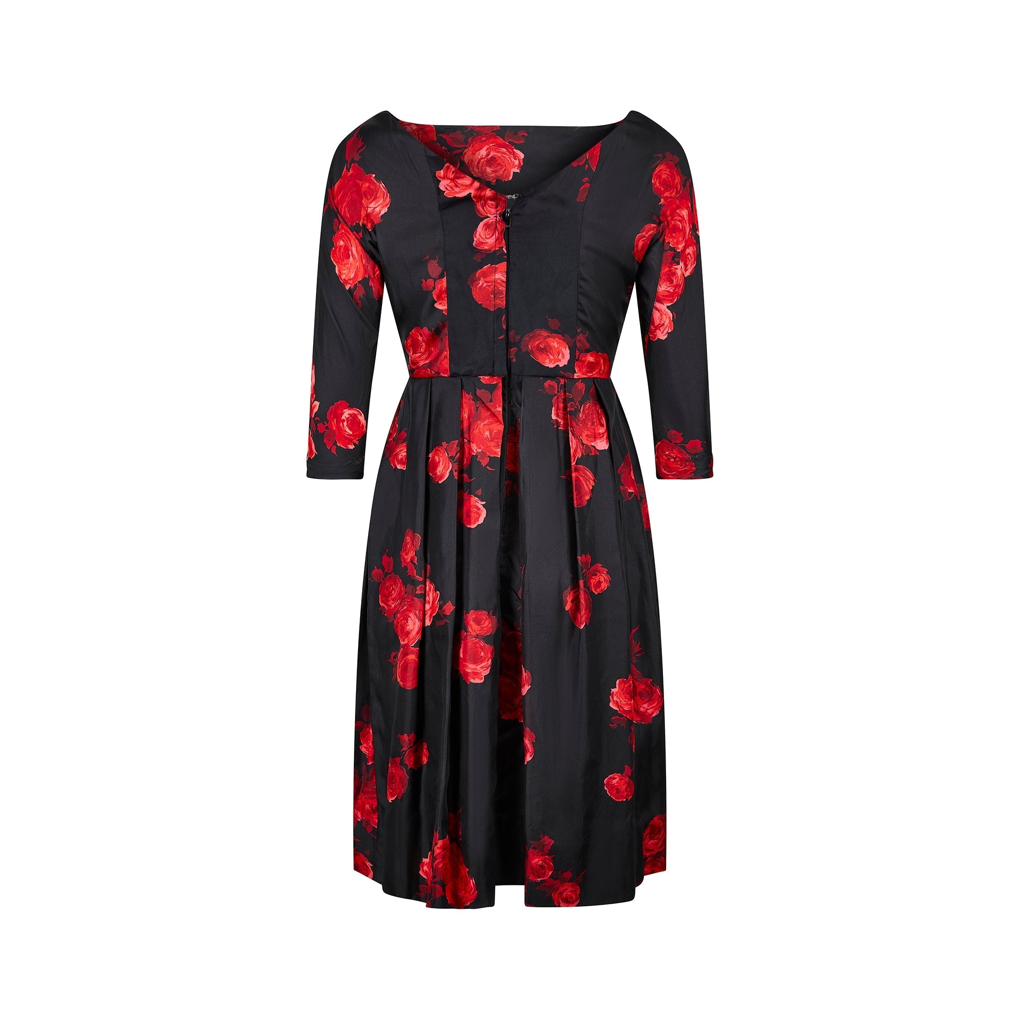 Suzy Perette brought the signature silhouettes of Christian Dior’s “New Look” to women across America. Thanks to a licensing arrangement between Suzy Perette’s owner, Sidney Blauner, and Christian Dior, American women could access these highly desirable Parisian designs for the first time. Created in the 1950s, this elegant dress has many of the hallmarks of the “New Look” with its fitted waist, wide boat neckline and mid-length flared skirt. The smooth black silk is printed with dramatic, clashing red roses. Three-quarter sleeves are designed to show off a delicate, jewel-adorned wrist. The back is secured with a hidden black zip and the dress is lined to the reverse of the silk in black viscose.