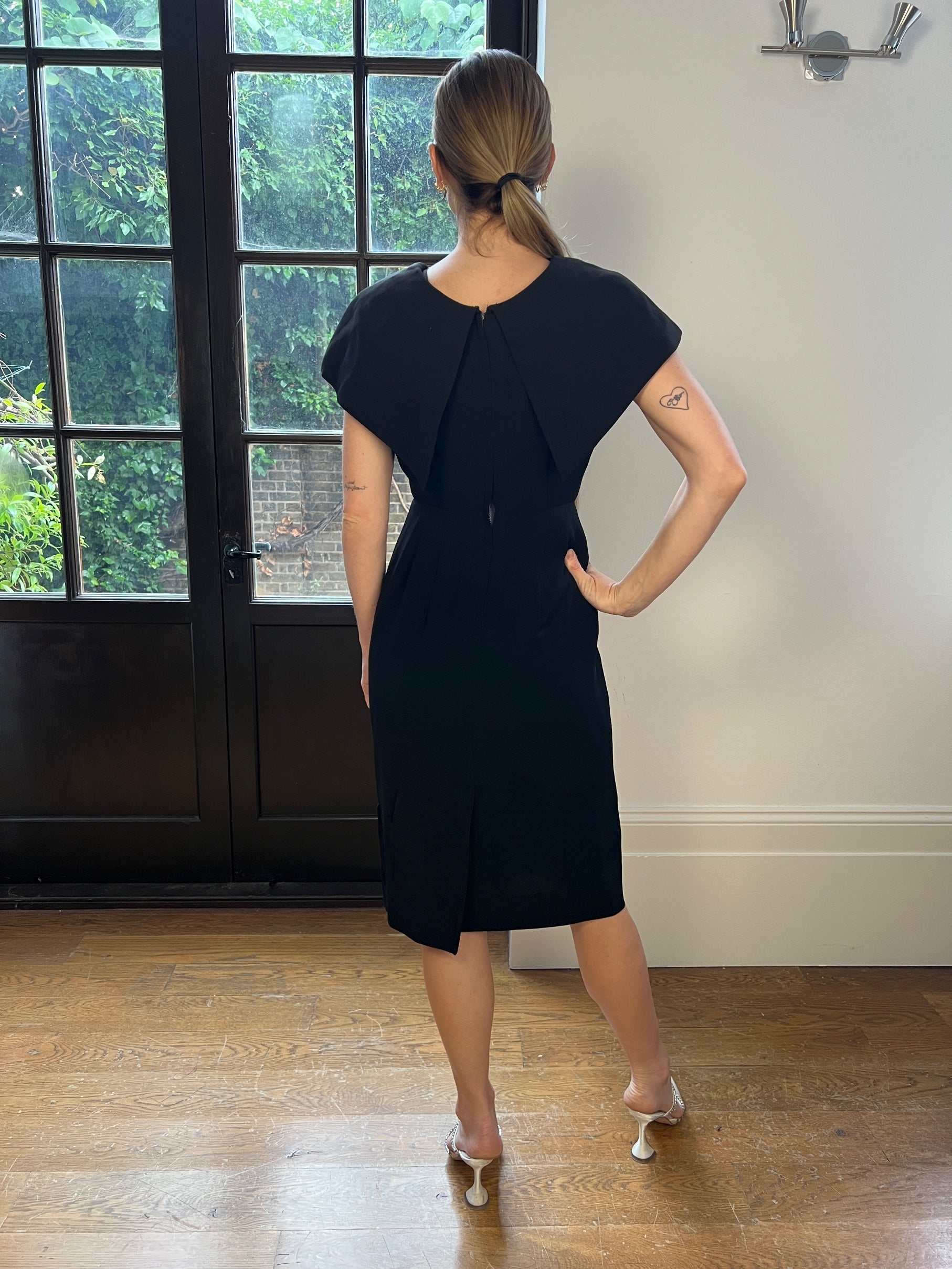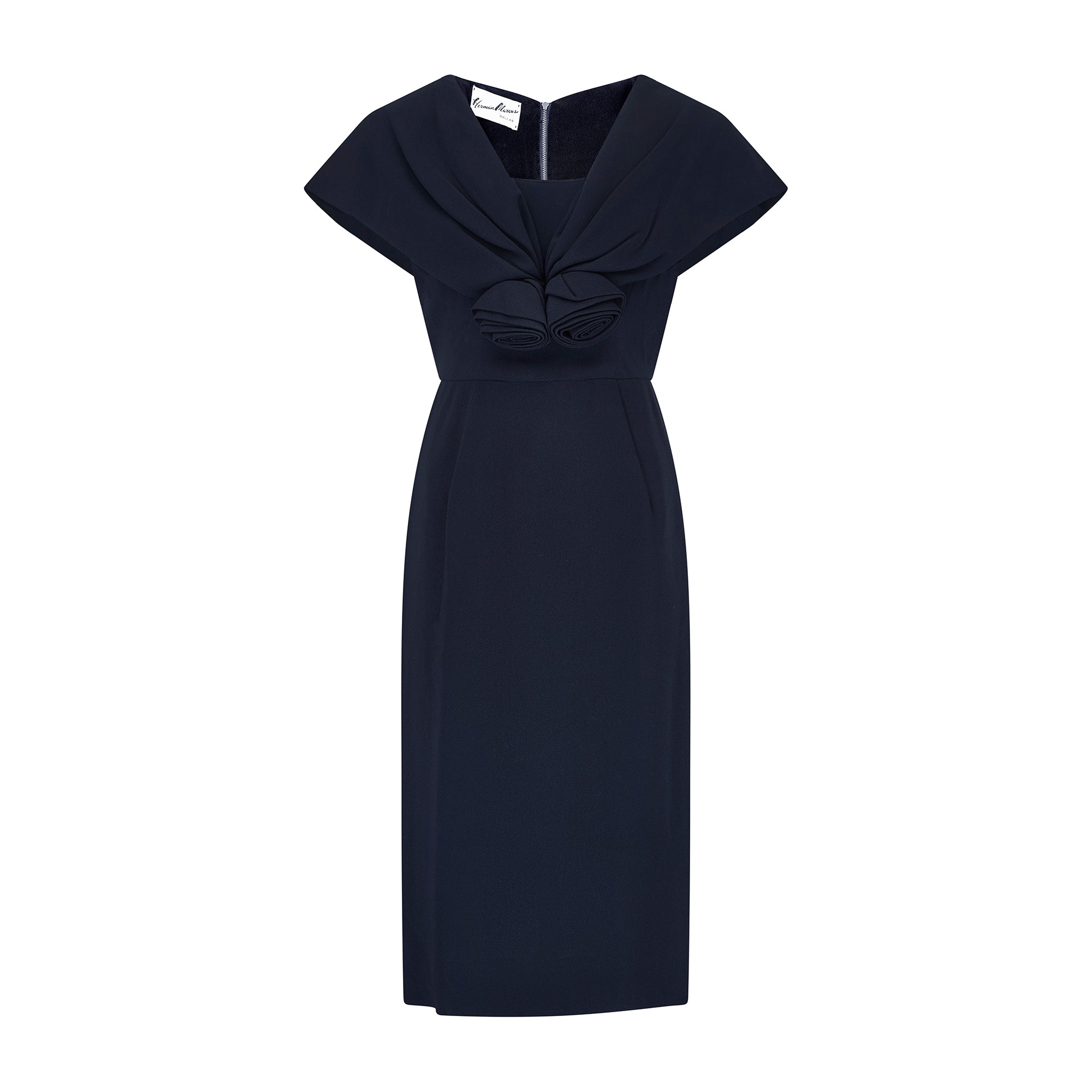 A supremely well made dress and tailored to a timeless, pencil silhouette with capped sleeves, this is a little black number you’ll pull out of your wardrobe time and time again. Fashioned from best quality thick black crepe, it was crafted by Herman Marcus in the late 1950s or very early 1960s. The tailoring is hugely flattering, hugging the waist and falling in a pencil skirt silhouette. The neckline has a decadent collar which covers the shoulders like a shawl, meeting at the chest where it is finished with two large, flamboyant rosettes. The skirt is lined with soft black satin. This elegant gown is secured with a hidden tonal zip and hook-and-eye clasp at the rear.