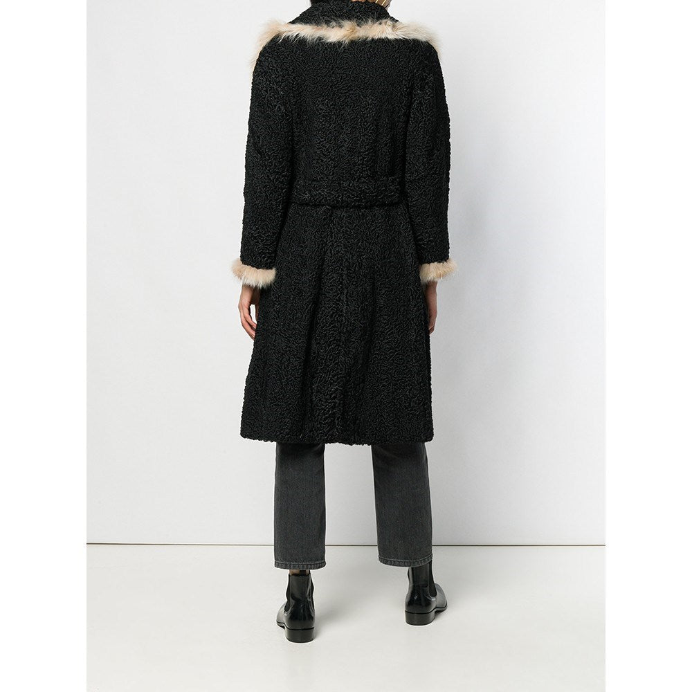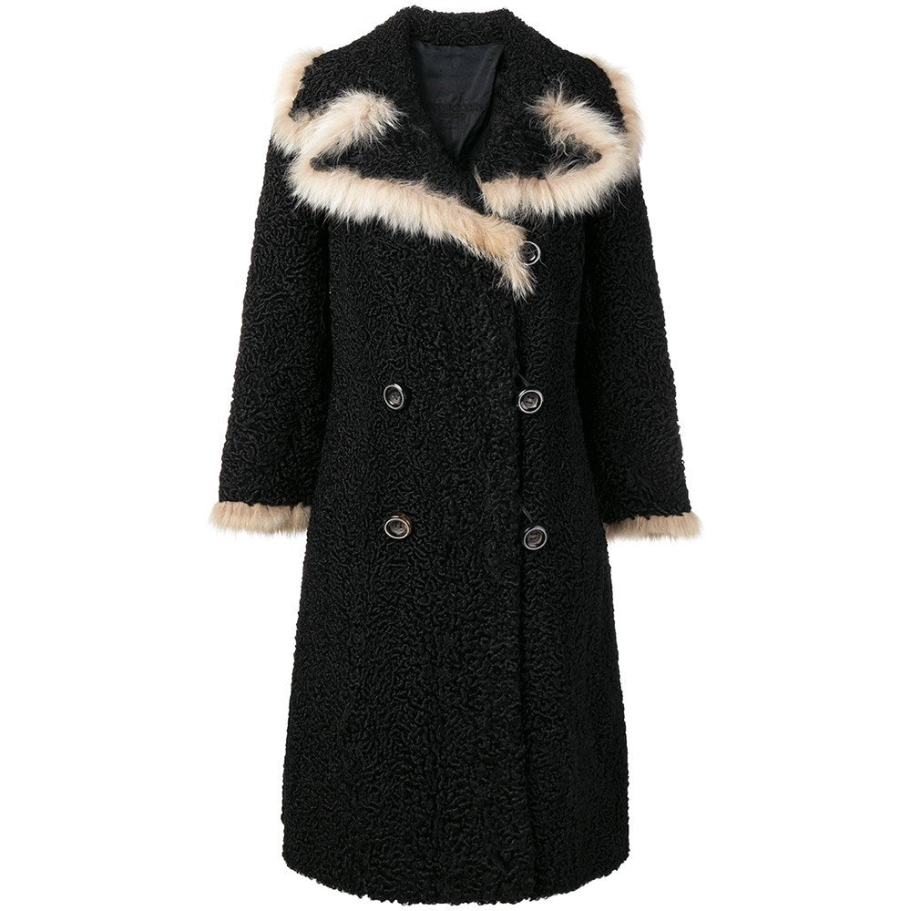 A.N.G.E.L.O. Vintage Cult black Persian fur coat with edges trimmed in white fox fur. Classic lapel collar and double-breasted front closure with buttons. Long sleeves and front welt pockets.