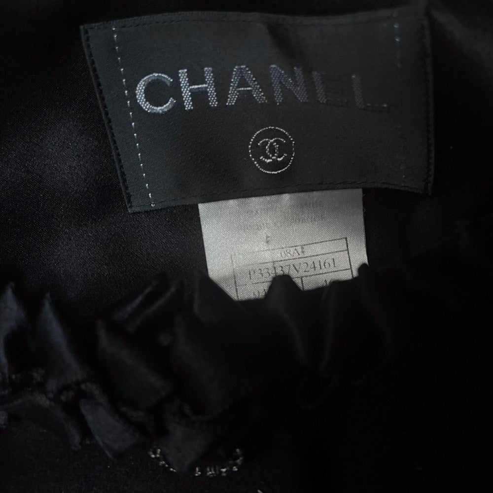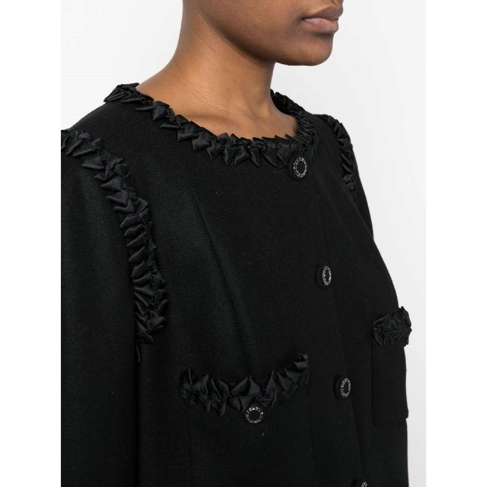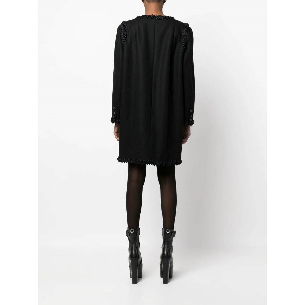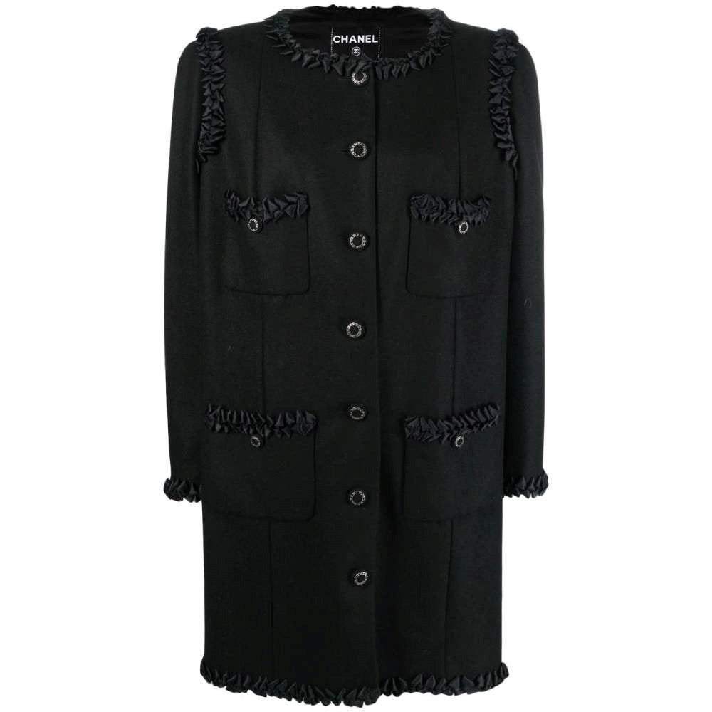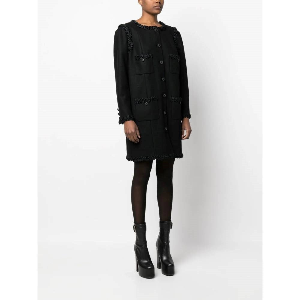 Black wool blend Chanel coat, from the 2000s. Round neckline, curled details along the edges, front pockets applied and closure with covered buttons.