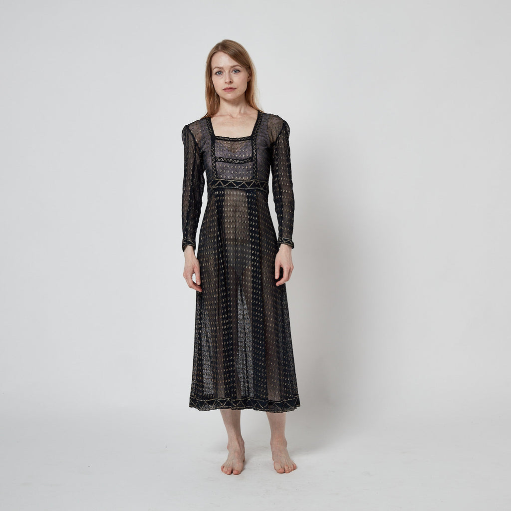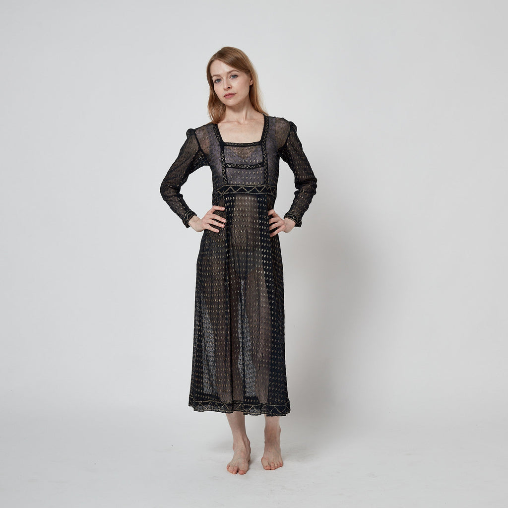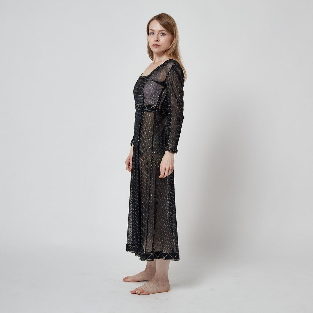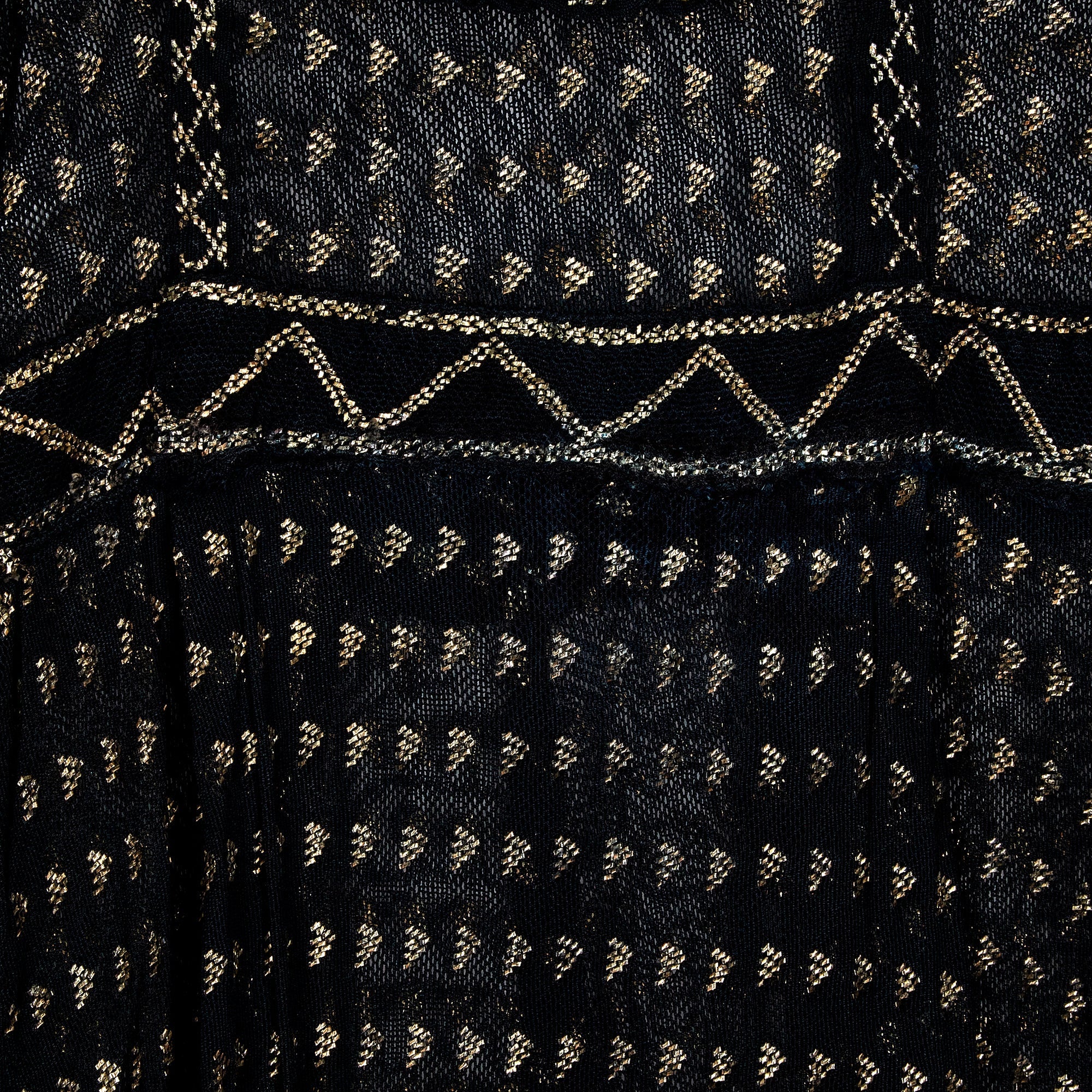 The cut of this Assiut dress is empire-line, falling in two soft pleats from under the bust to the mid-calf. It has a flattering square-neckline which subtly hints at the décolletage although this garment would almost certainly have been paired with a silk or cotton undergarment for modesty. The gold tinted silver-work is arranged in meticulous detail into a bold geometric textile and vertical linear design. The waistband and hem of the skirt are patterned with zig-zag shapes in shimmering metallic thread. The long narrow sleeves are detailed with coordinating zig-zag patterns at the cuffs.