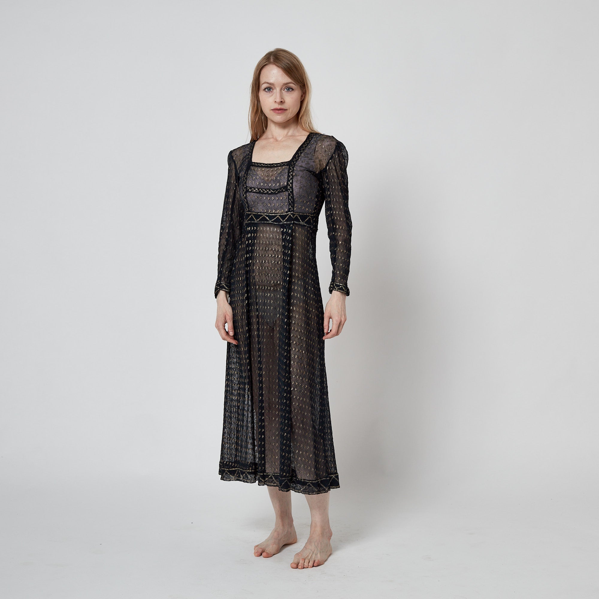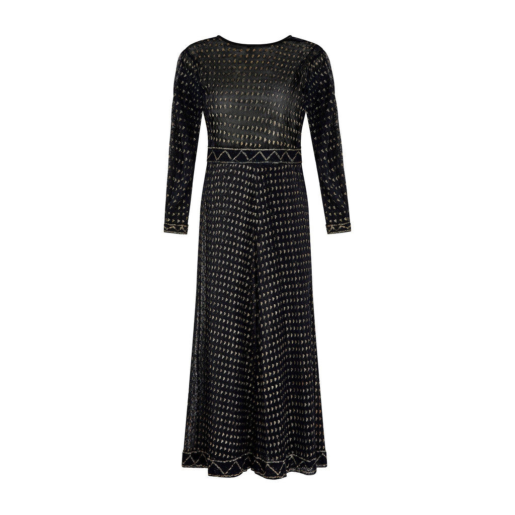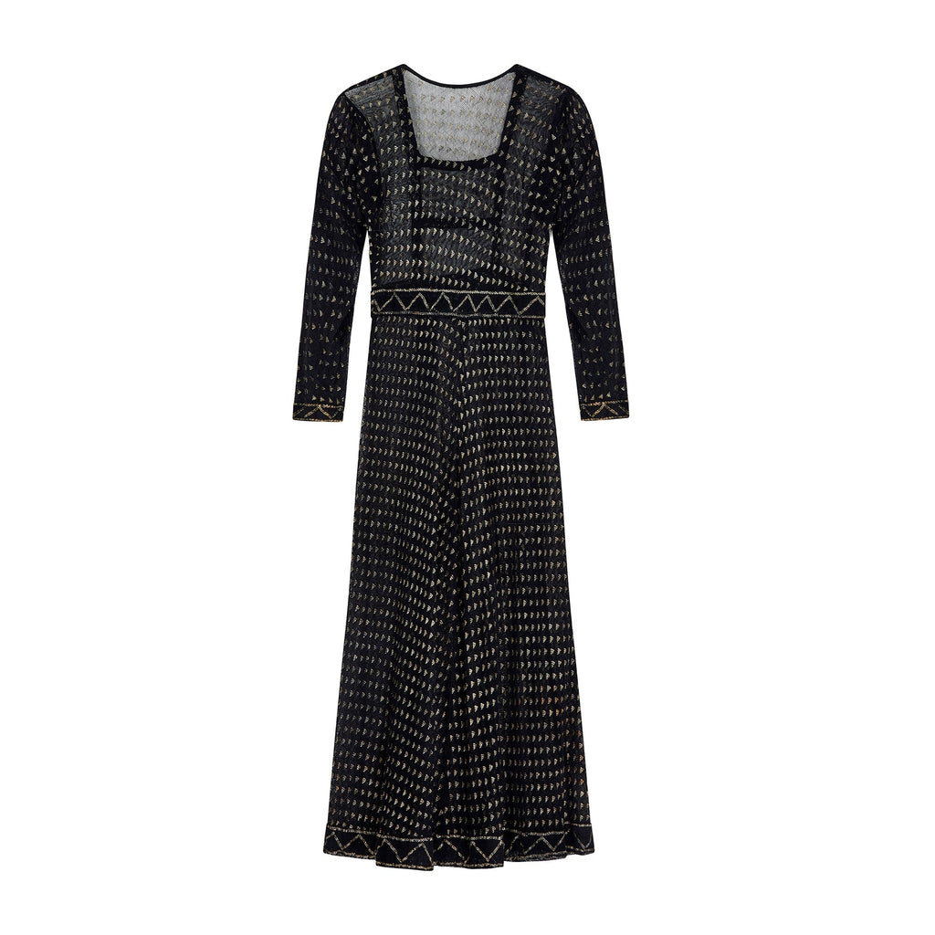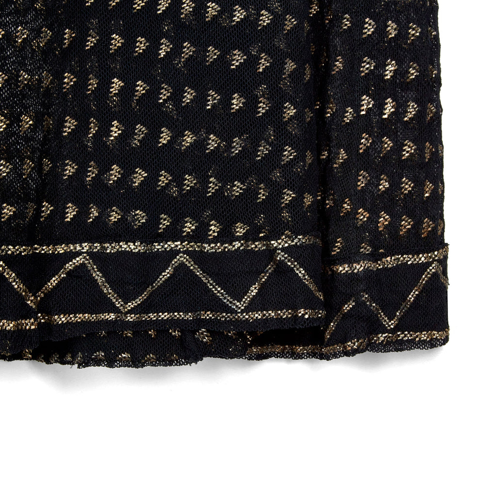 The cut of this Assiut dress is empire-line, falling in two soft pleats from under the bust to the mid-calf. It has a flattering square-neckline which subtly hints at the décolletage although this garment would almost certainly have been paired with a silk or cotton undergarment for modesty. The gold tinted silver-work is arranged in meticulous detail into a bold geometric textile and vertical linear design. The waistband and hem of the skirt are patterned with zig-zag shapes in shimmering metallic thread. The long narrow sleeves are detailed with coordinating zig-zag patterns at the cuffs.