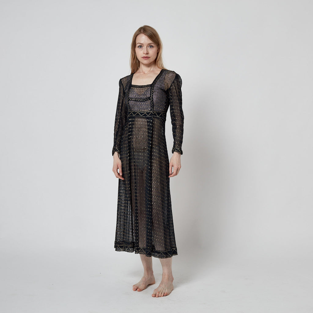 This rare and original kaftan pre-dates 1922 with the discovery of Tutankhamen's tomb and the subsequent years when the fashion for all things Egyptian reached its zenith until 1926. The ancient metal embroidery technique marries cotton mesh with small strips of hammered metal and was fashioned into exotic shawls, dresses and jackets during the flapper era worldwide.