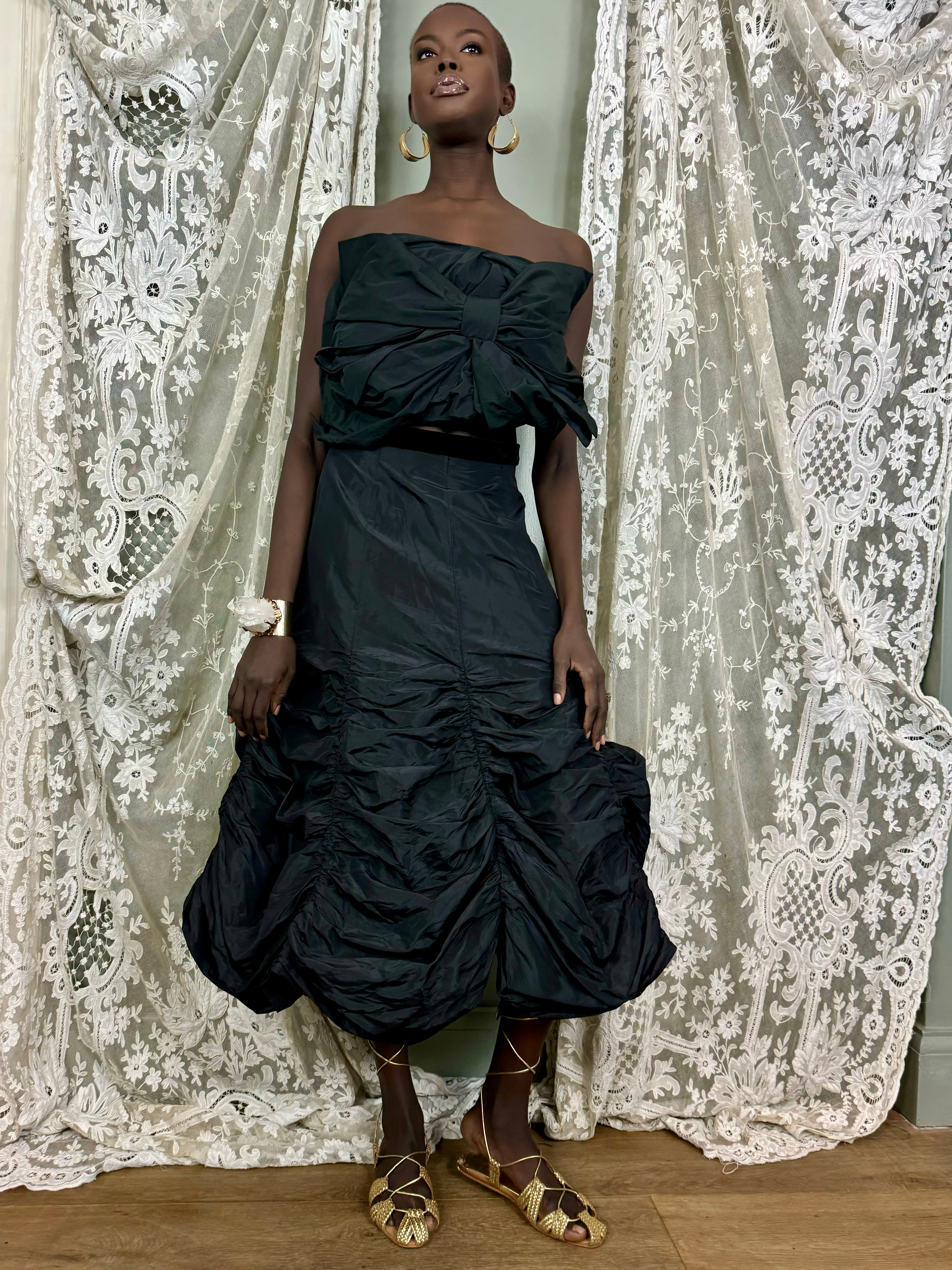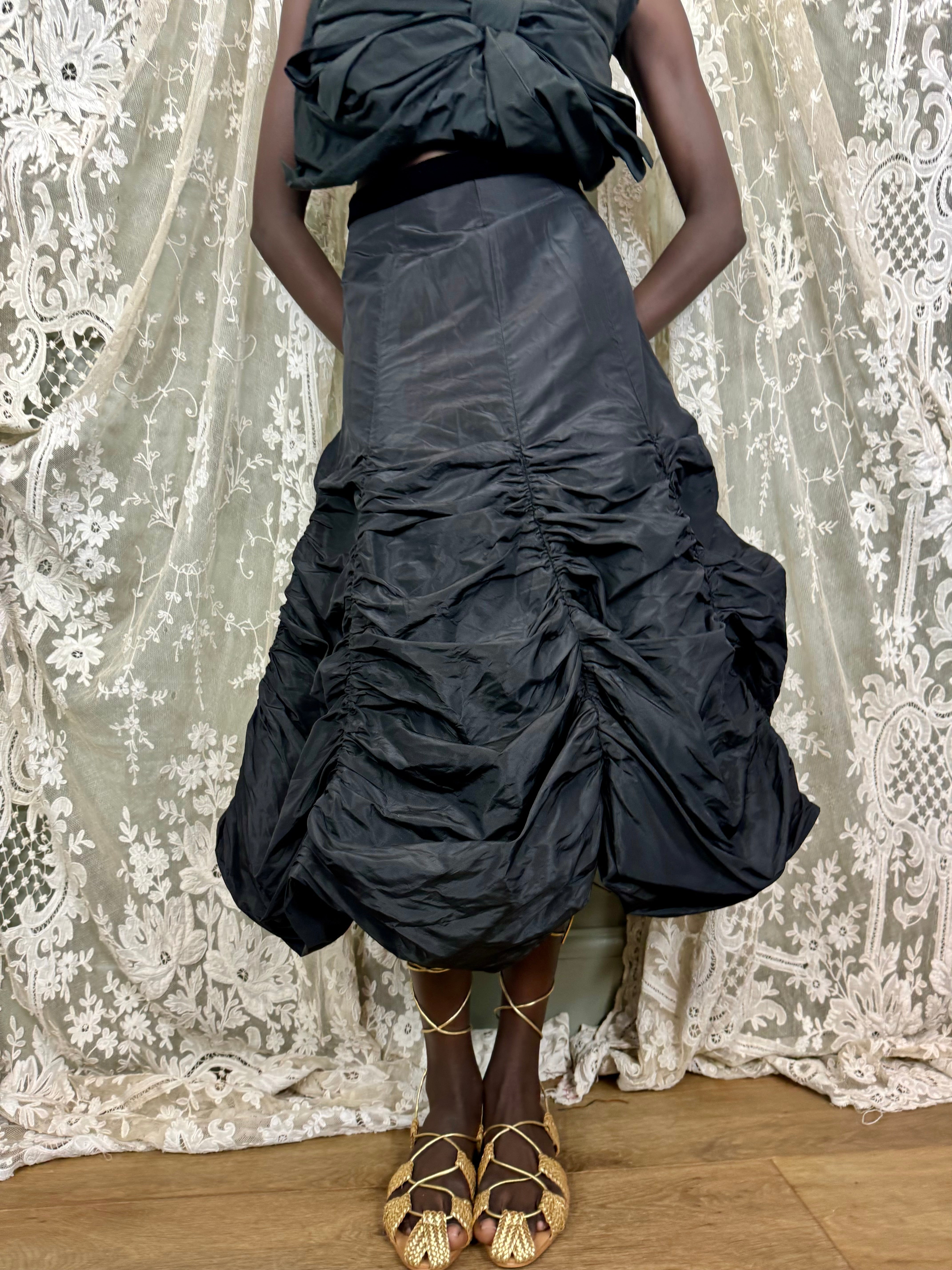 Discover this stunning 80s black parachute draped taffeta skirt, perfect for any occasion. Featuring a velvet waistband and button fastening, this A-line skirt boasts a luxurious draped design for a flattering fit.