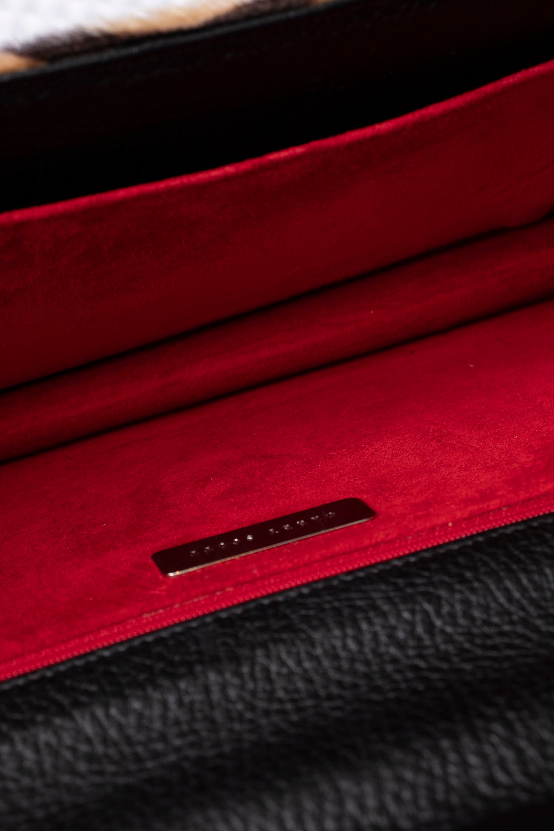 • snap closure interior open pocket & interior zip pocket with red grosgrain lining