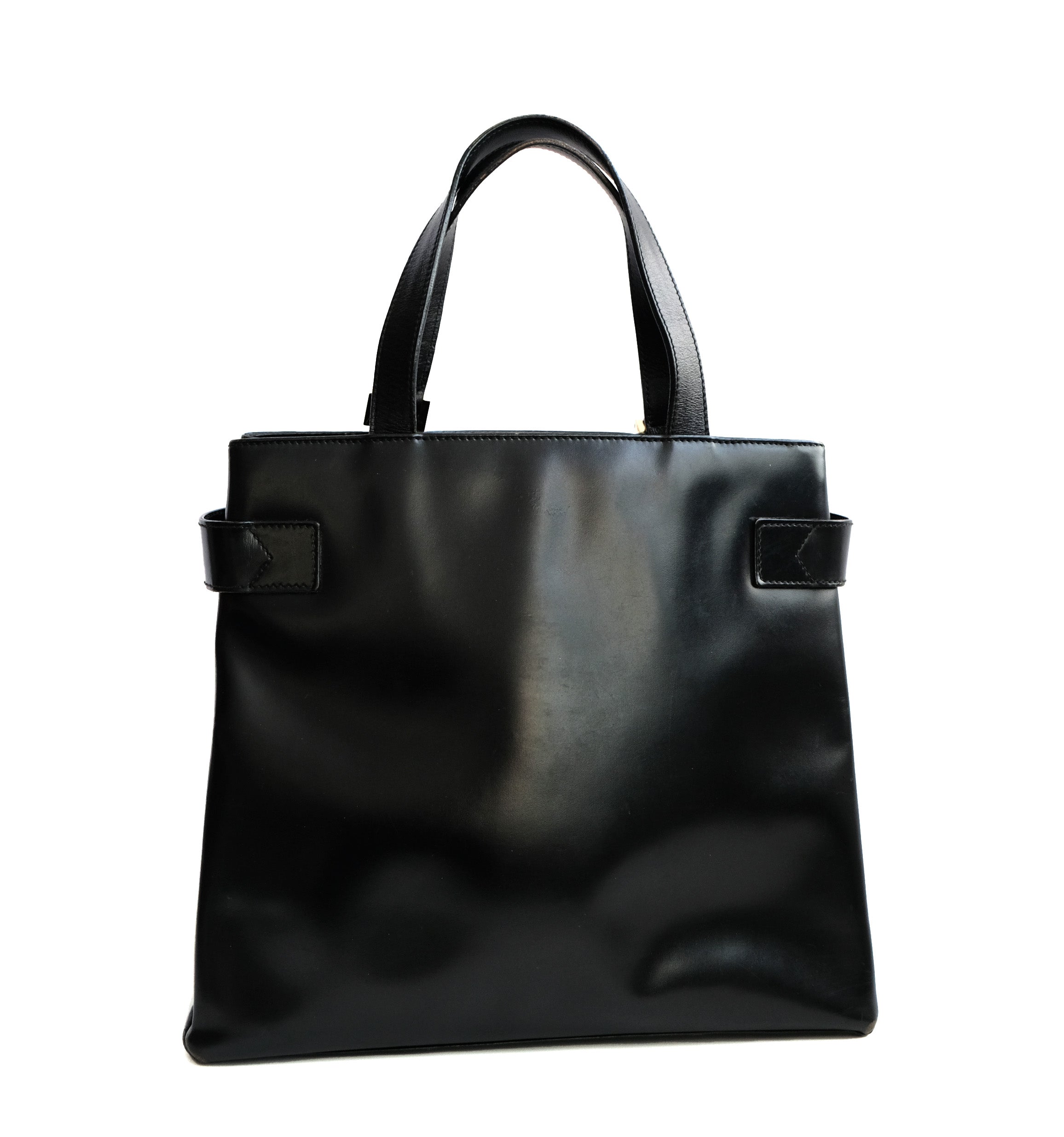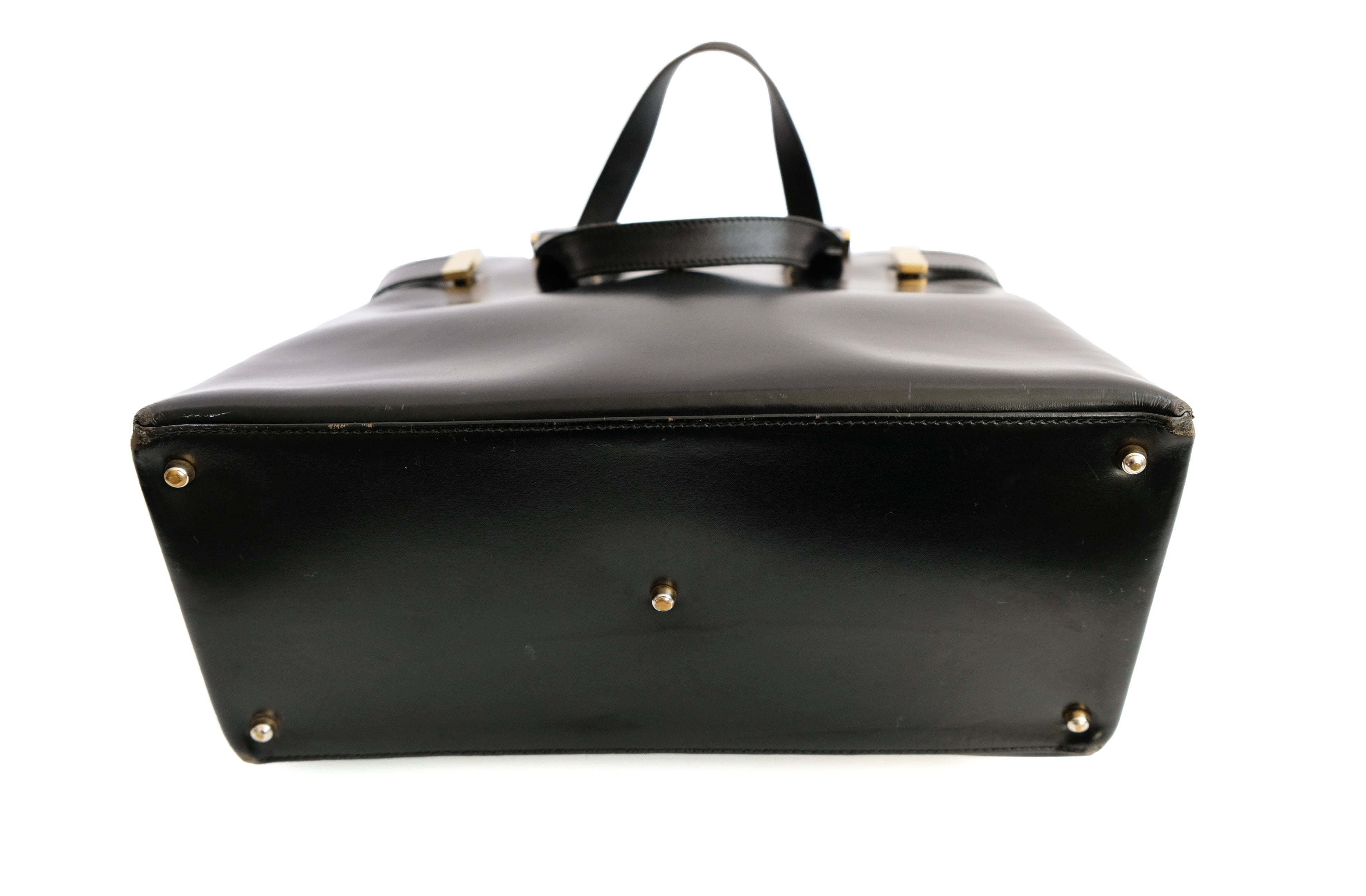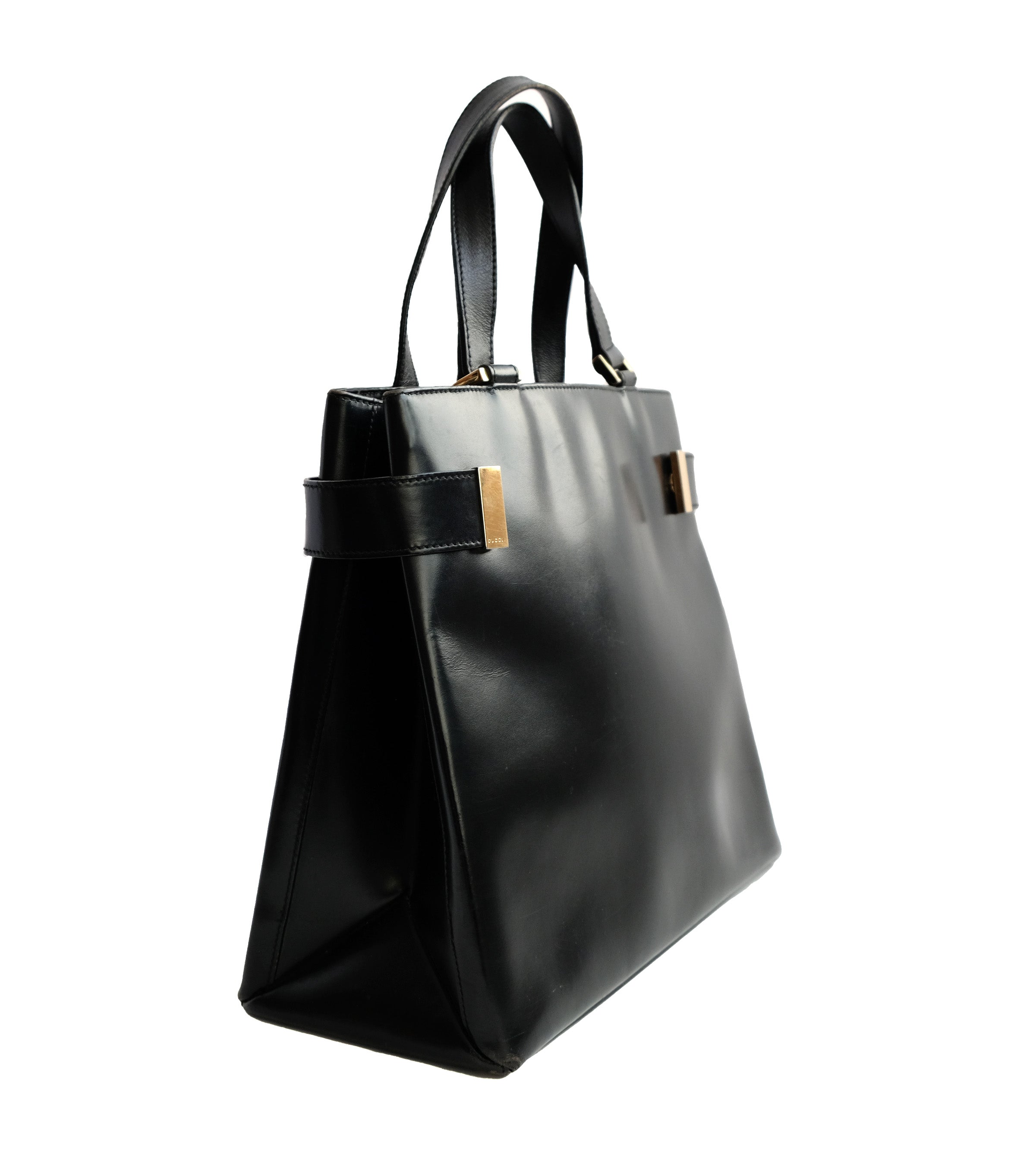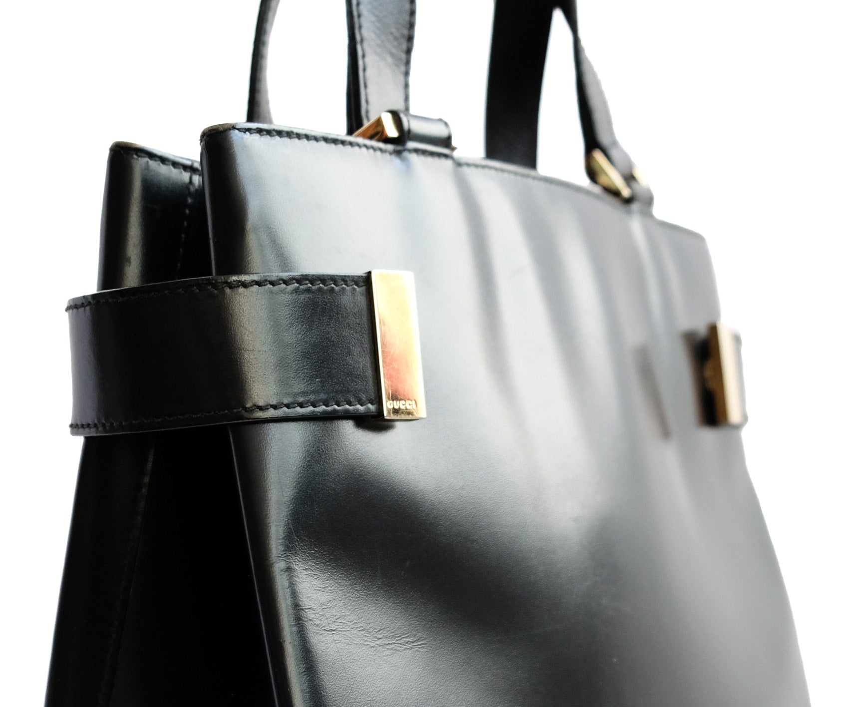 A sleek, grown up 1990s vintage handbag by Gucci, in glossy black leather with gold tone hardware.