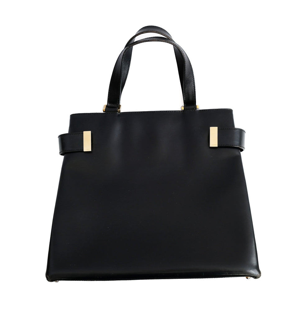 Trapezium shaped, wide base with gold tone studs. Twin handles and long detachable shoulder strap with gold tone clips. Simple chic design, with two side straps at the top fastening with poppers and finished with Gucci signature gold tone details. Two roomy interior compartments, with single zipped pocket inside.