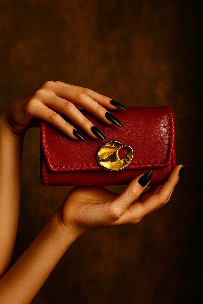 Jasmir, handmade red lizard skin clutch with a sculptural 70s clasp