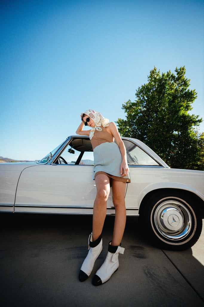 A coveted archival piece from Nicolas Ghesquière’s early 2000s Balenciaga reign, this sculptural colorblock dress features warm tan tones and soft baby blue in a sleek body-hugging silhouette. The top has a sheer, unlined finish for a whisper of skin, while the skirt is lined for structure and coverage. Sexy, subtle, and unmistakably Ghesquière—with that perfect mix of intellect and edge.