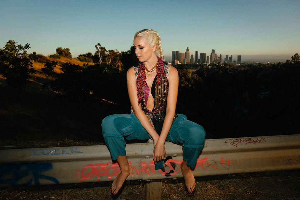 Crafted from vintage Liberty London archive fabrics, the piece features a mix of blooming florals, metallic lamé pinstripes, and rich jewel-toned silks. The asymmetric hem and slip-on design exude effortless cool.