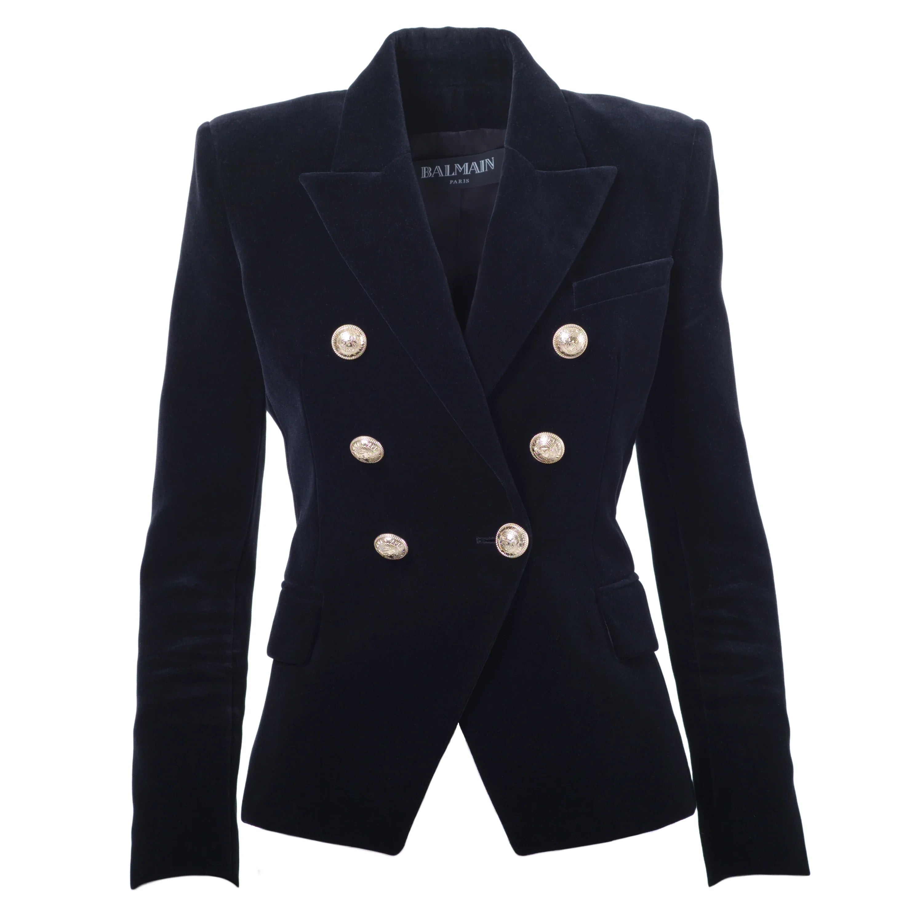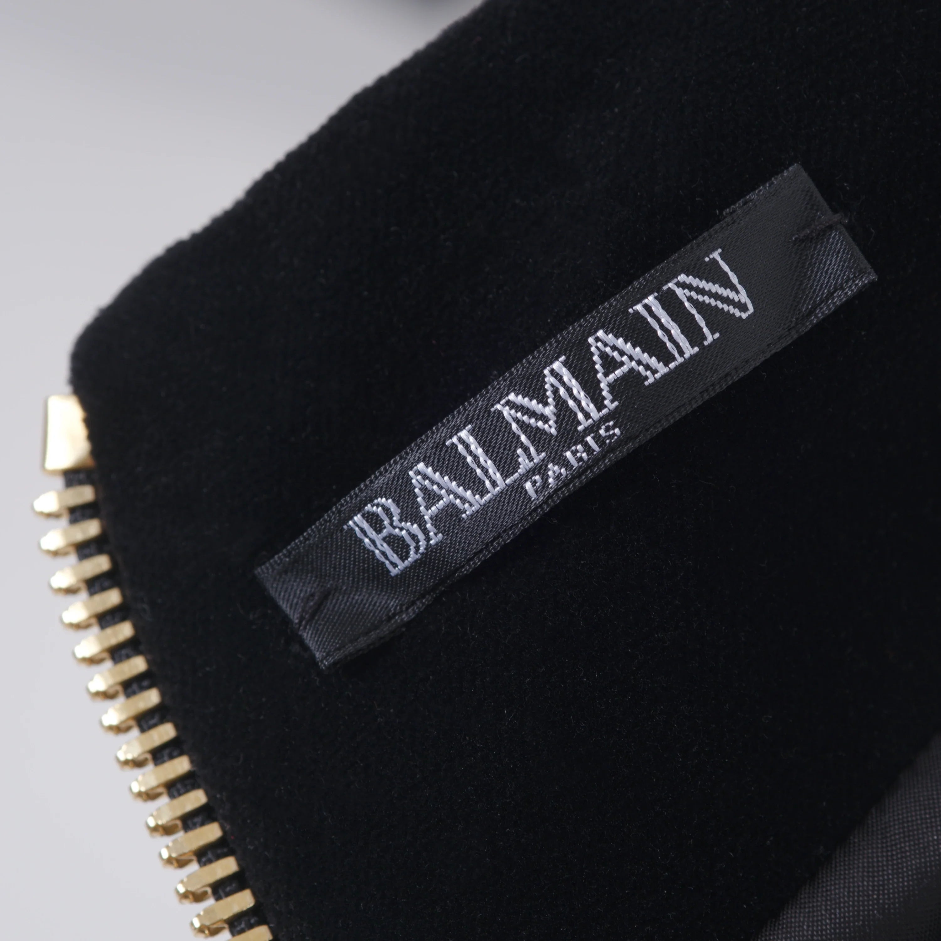 Crafted from high-quality black velvet, this set consists of a structured double-breasted blazer and a coordinated skirt, both embellished with Balmain’s signature gold-tone buttons, a hallmark of the maison.