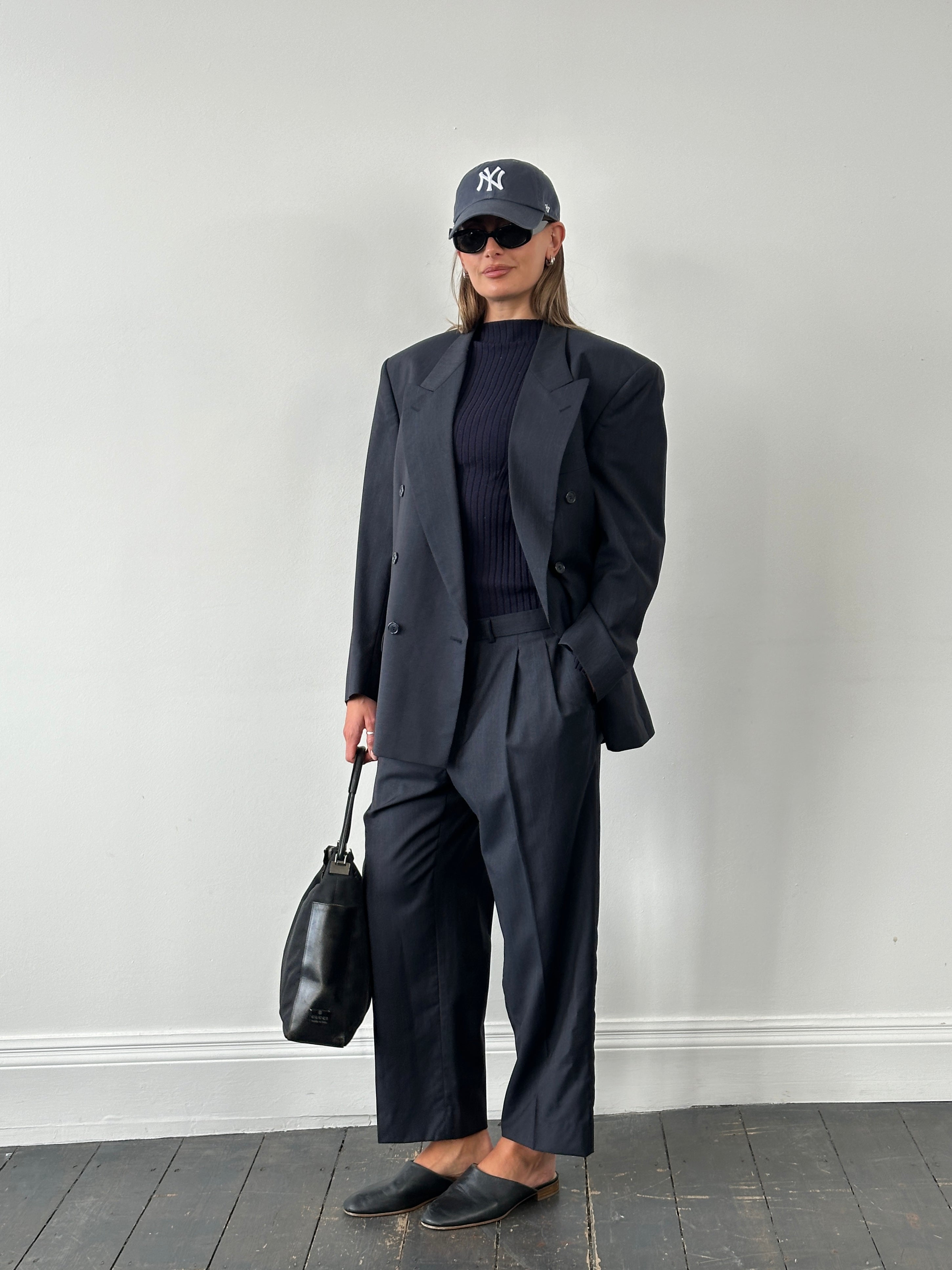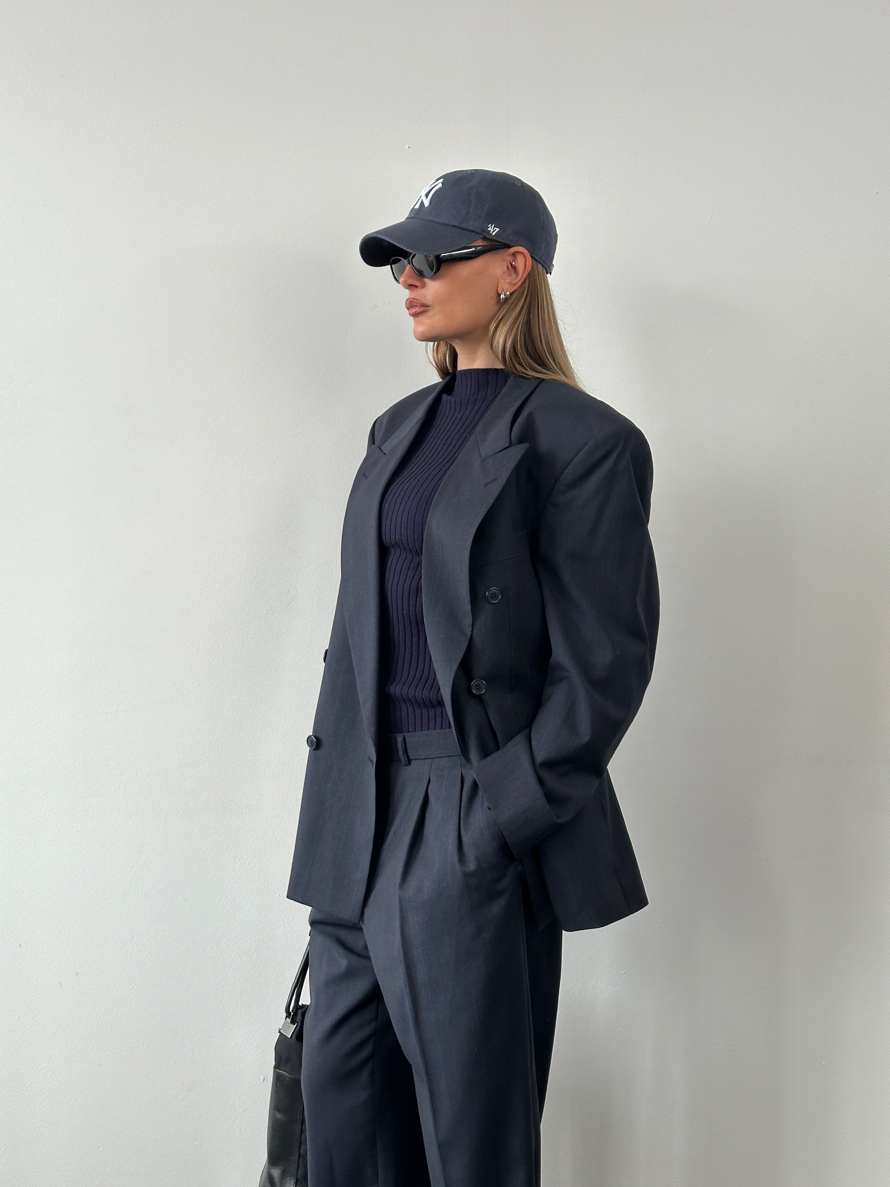 Vintage 1990s double breasted pure wool suit by Pierre Balmain, finished in navy with a subtle burgundy stripe. Structured jacket and straight leg trousers, fully lined in logo branded monogram viscose.