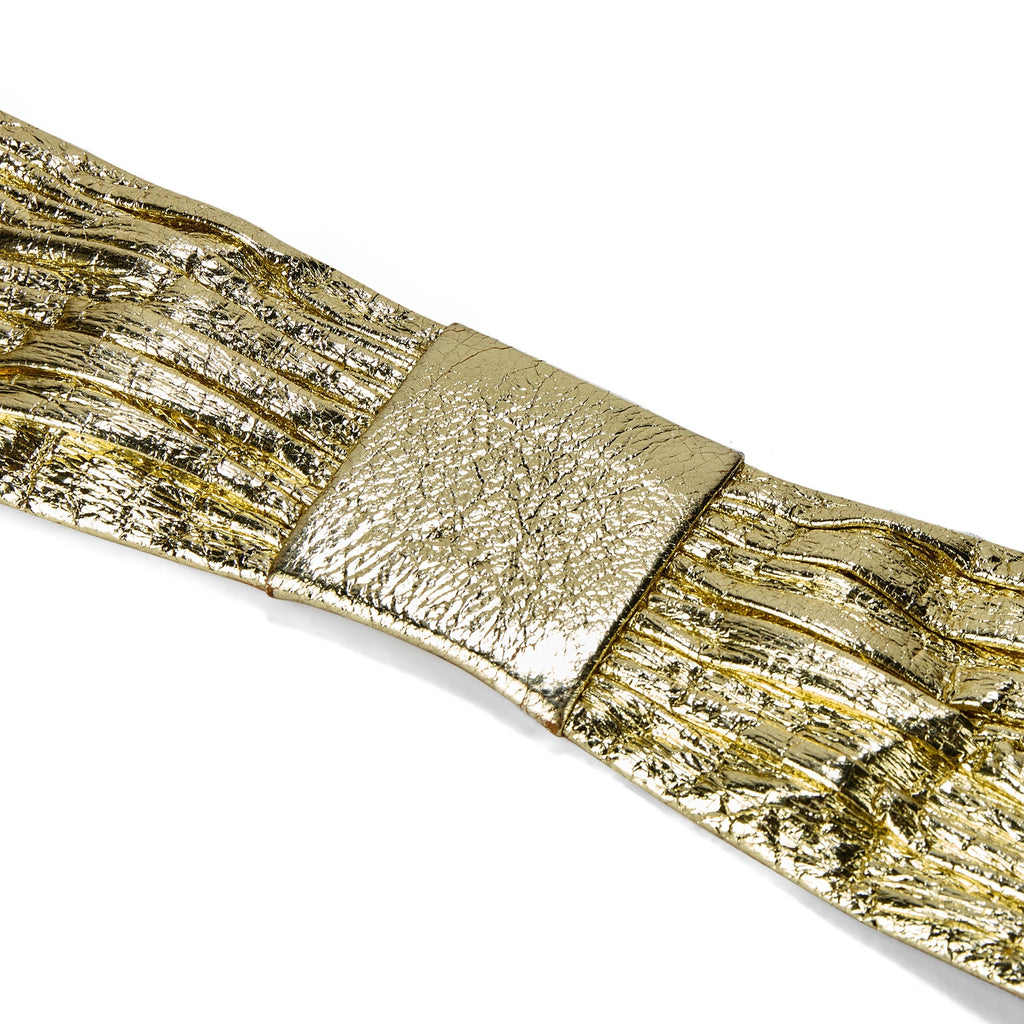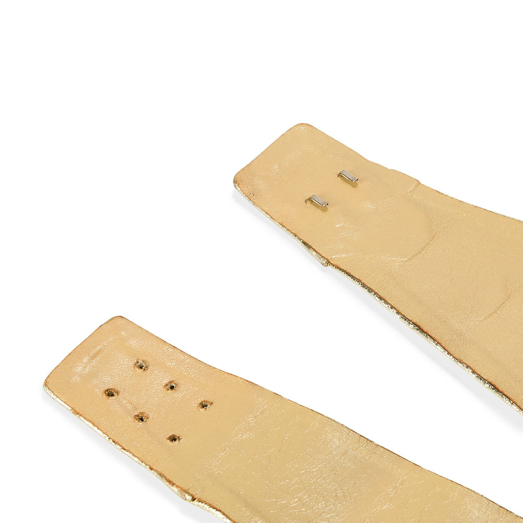 This glamorous belt was designed by an unknown French couture house in the 1970s and probably accompanied a decadent ensemble. Crafted from gold leather with a ruched, textured finish. It is backed with nude leather and designed to hold its shape stiffly. At the middle front and at each end of the belt, there are flat gold bands that circle the ruched leather.